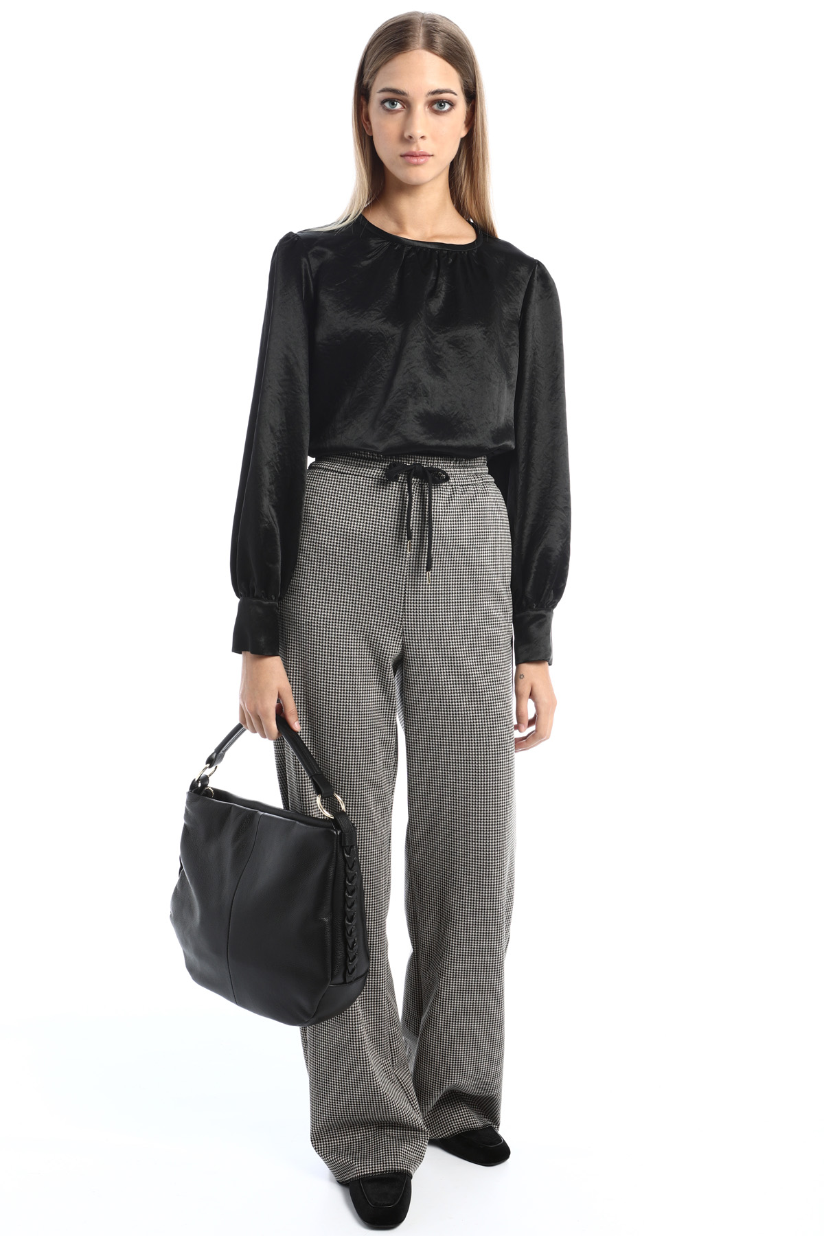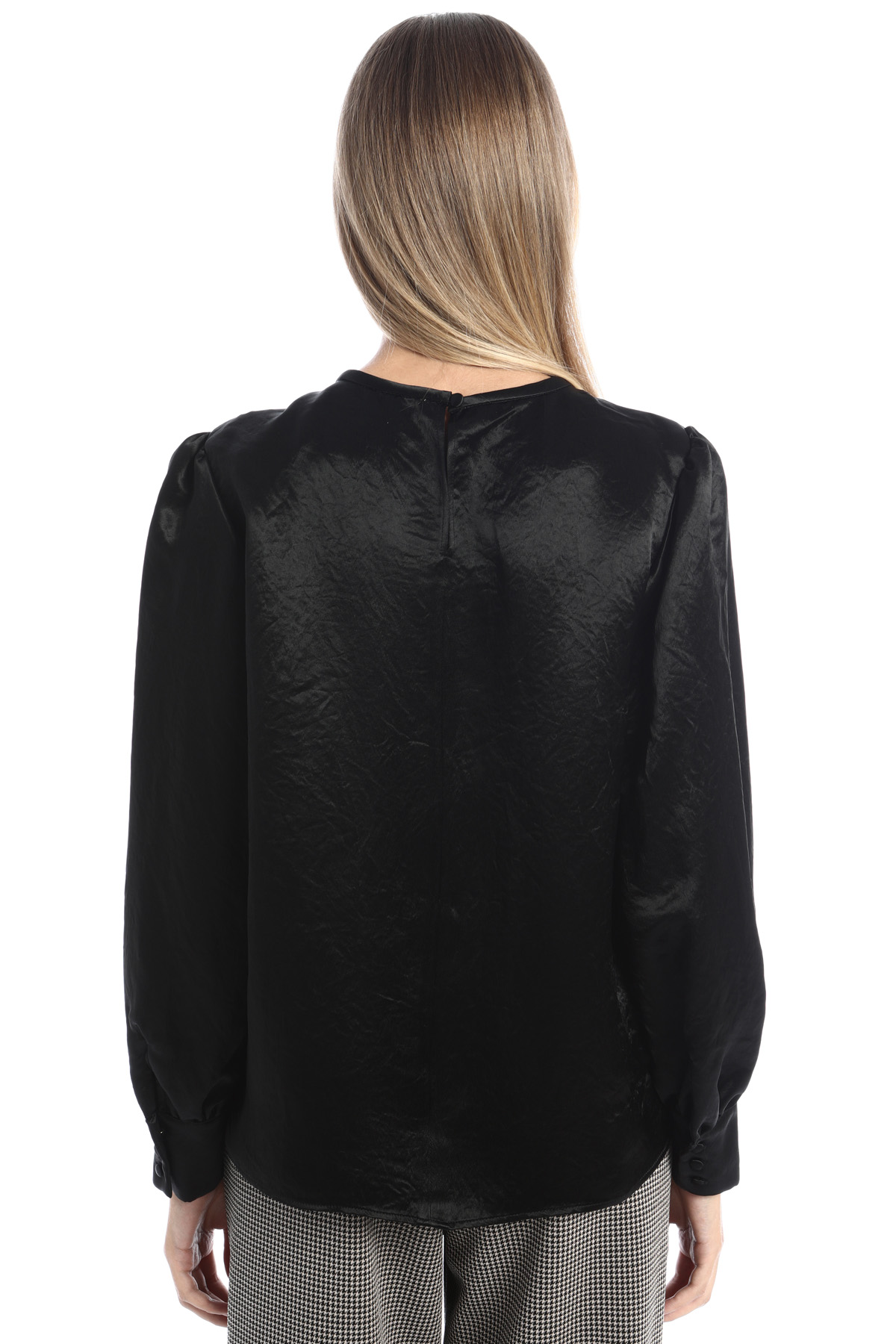 Blusa dalla linea fluida realizzata in raso dal finish metallizzato, con scollo rotondo, maniche lunghe con polsino e bottoni, spacchetti laterali a fondo capo e apertura a goccia con bottone nel retro.