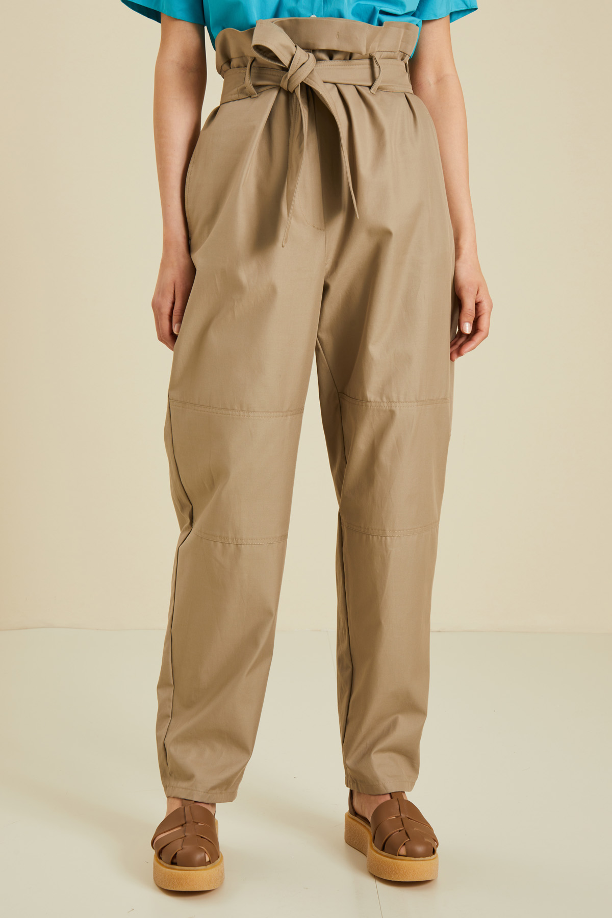Pantaloni dalla linea dritta realizzati in gabardina di puro cotone con cintone e passanti in vita, tasche laterali inserite in cucitura sul davanti e applicate nel retro. Allacciatura nascosta tramite zip, bottone e gancio. Capo dotato di cintura coordinata.