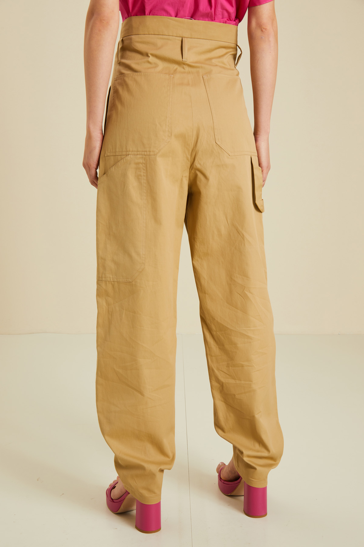 Pantaloni a vita alta dalla linea dritta realizzati in gabardina di puro cotone, con cintone e passanti in vita, tasche laterali inserite in cucitura sul davanti e applicate nel retro. Allacciatura nascosta tramite zip, bottone e gancio. Capo dotato di cintura coordinata.