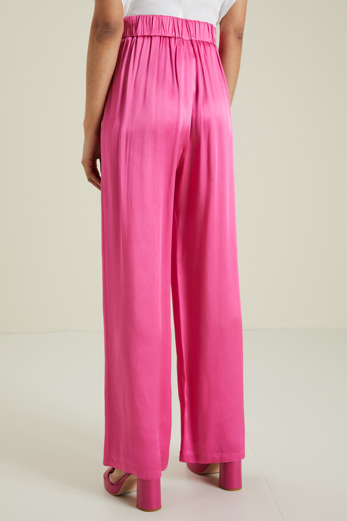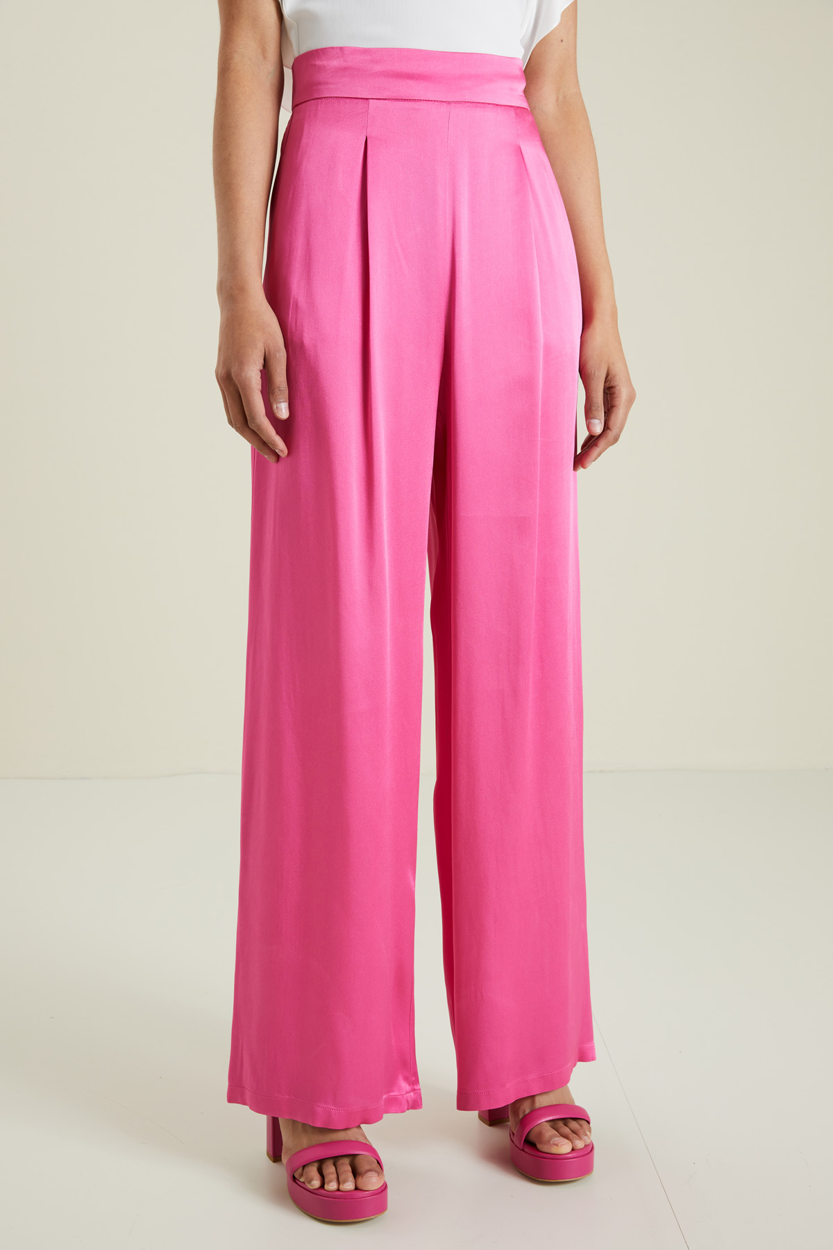 Pantaloni a palazzo realizzati in raso di misto viscosa, con inserto elastico in vita nel retro, pinces sul davanti, tasche laterali inserite in cucitura e chiusura tramite zip invisibile sul fianco.