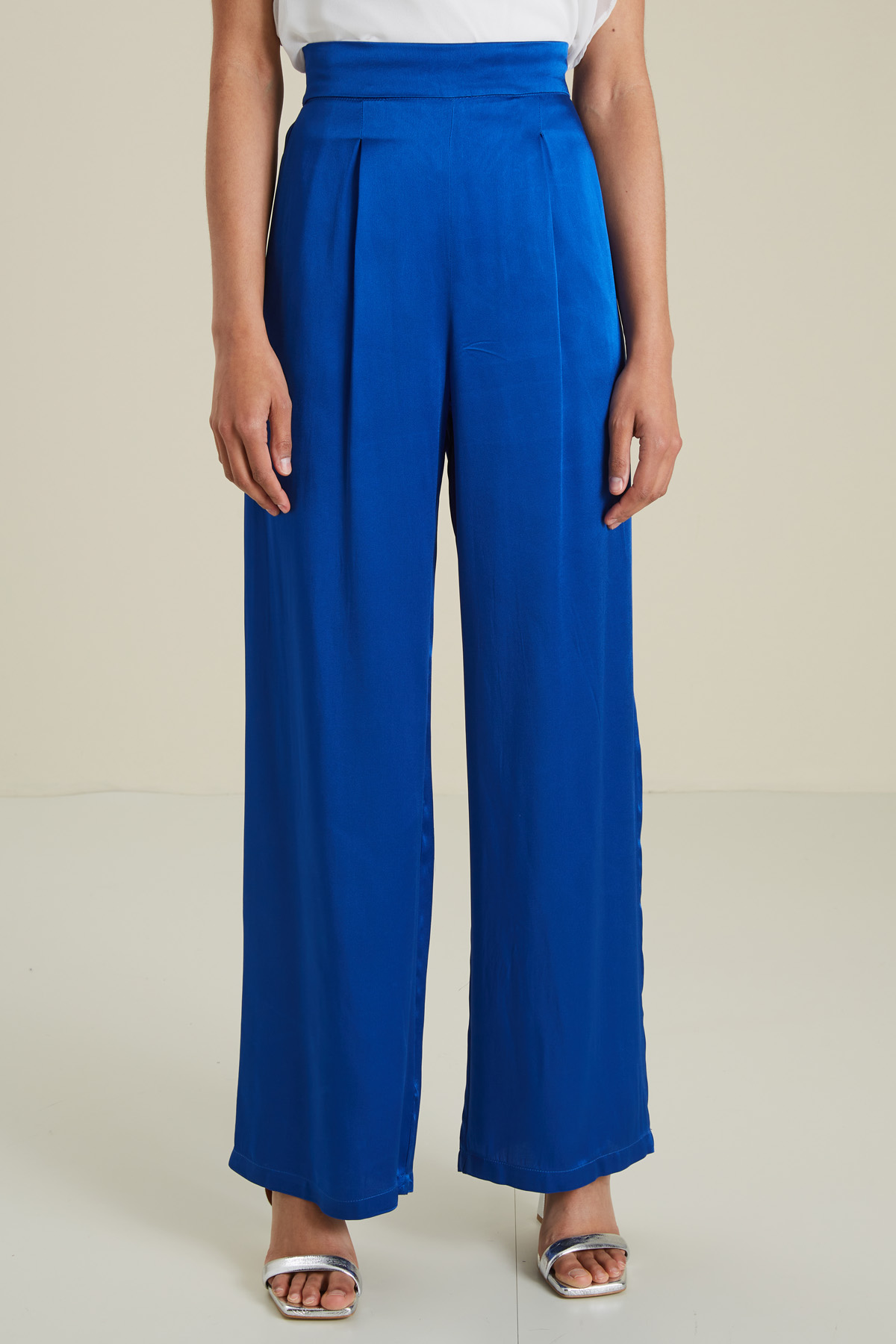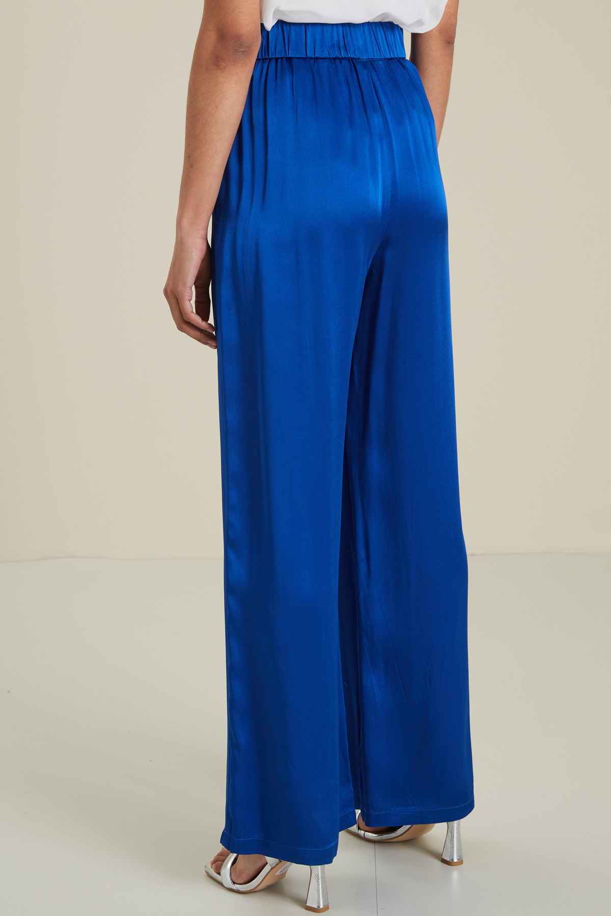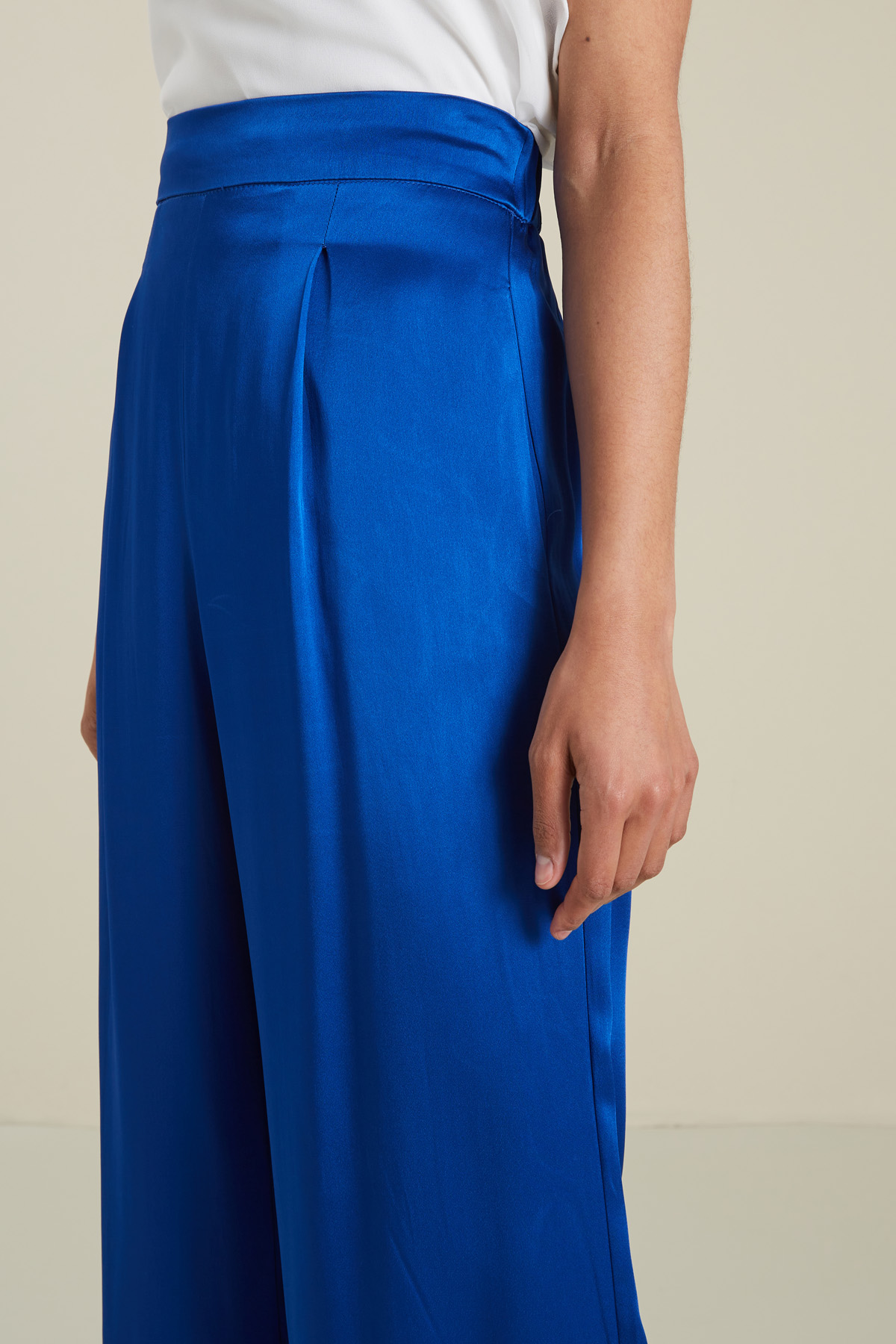 Pantaloni a palazzo realizzati in raso di misto viscosa, con inserto elastico in vita nel retro, pinces sul davanti, tasche laterali inserite in cucitura e chiusura tramite zip invisibile sul fianco.