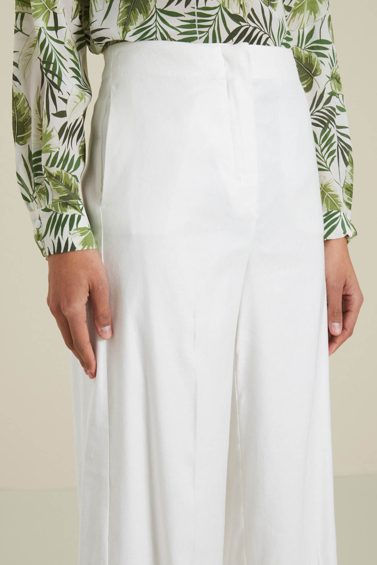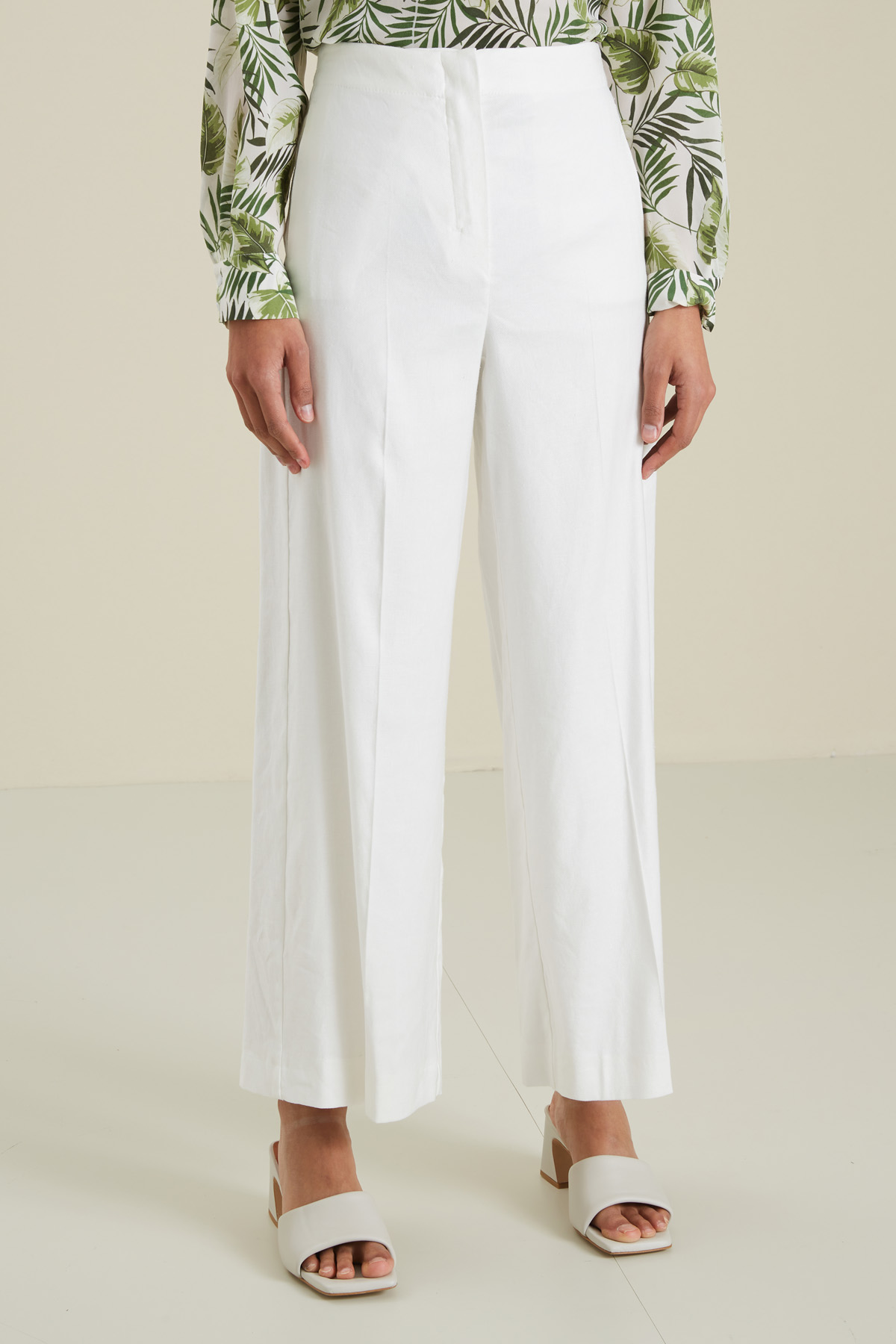 Pantalone dalla linea a palazzo realizzato in faille di misto lino stretch, con tasche laterali inserite nella cucitura e a doppio filetto con bottone sul retro, piega stirata e allacciatura nascosta tramite zip e gancio.