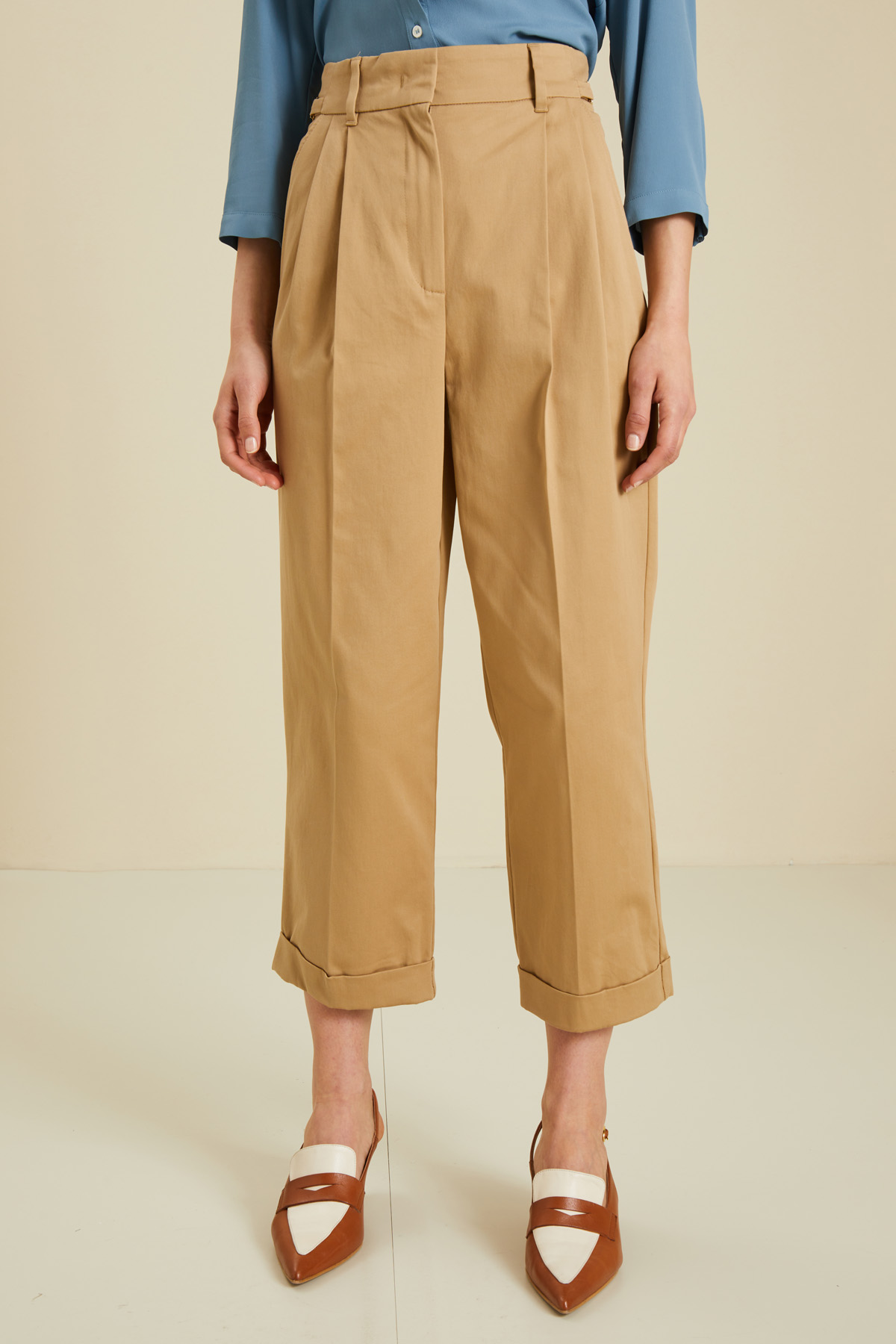 Pantaloni baggy a vita alta realizzati in tricotina di cotone stretch, con passanti e pieghe in vita, dettaglio a catena, tasche alla francese sul davanti e a doppio filetto nel retro, risvolto al fondo. Allacciatura nascosta tramite zip, bottone e gancio.