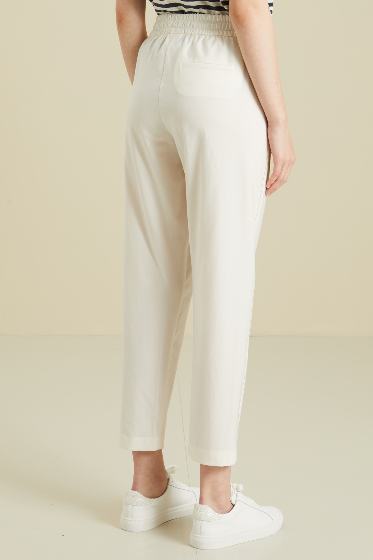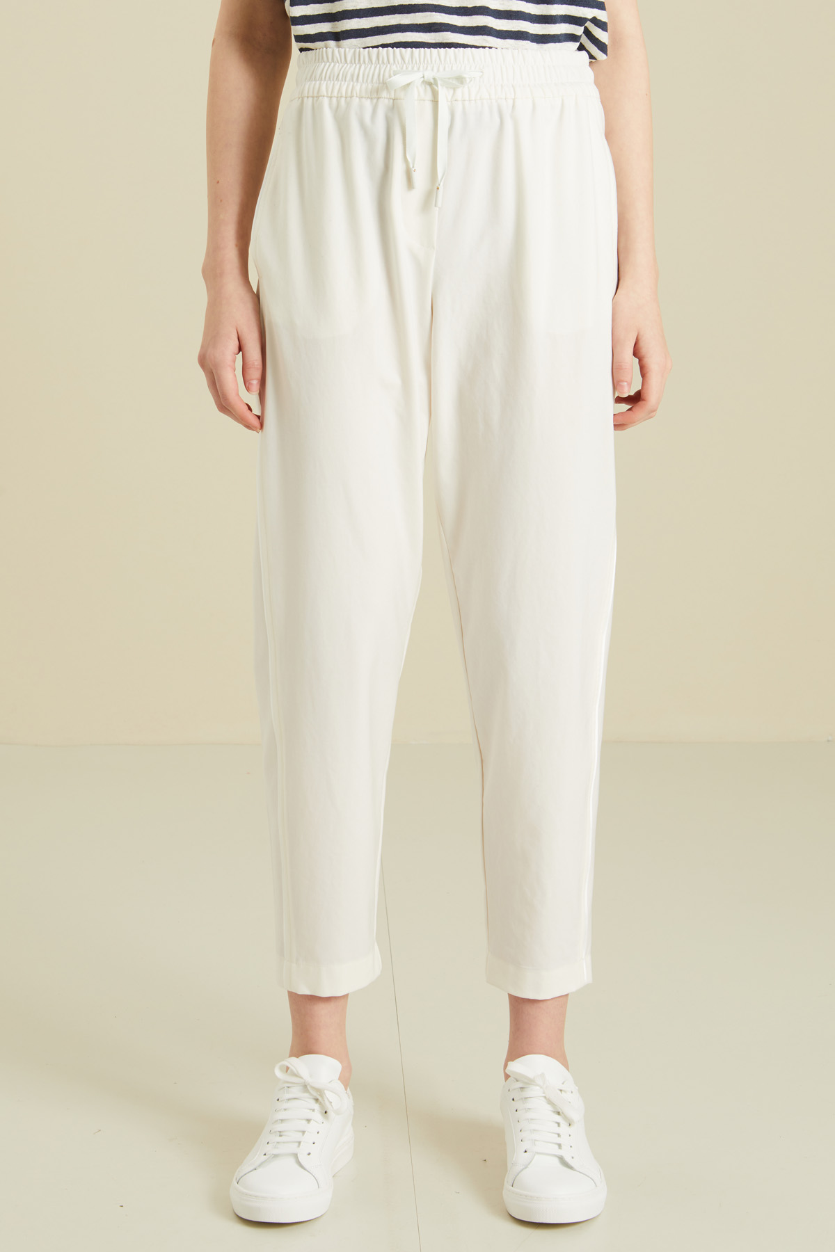 Pantaloni jogger realizzati in tela di misto viscosa stretch, con piping laterale in raso, inserto elastico e coulisse in vita, tasche inserite in cucitura e taschino a filetto dietro.