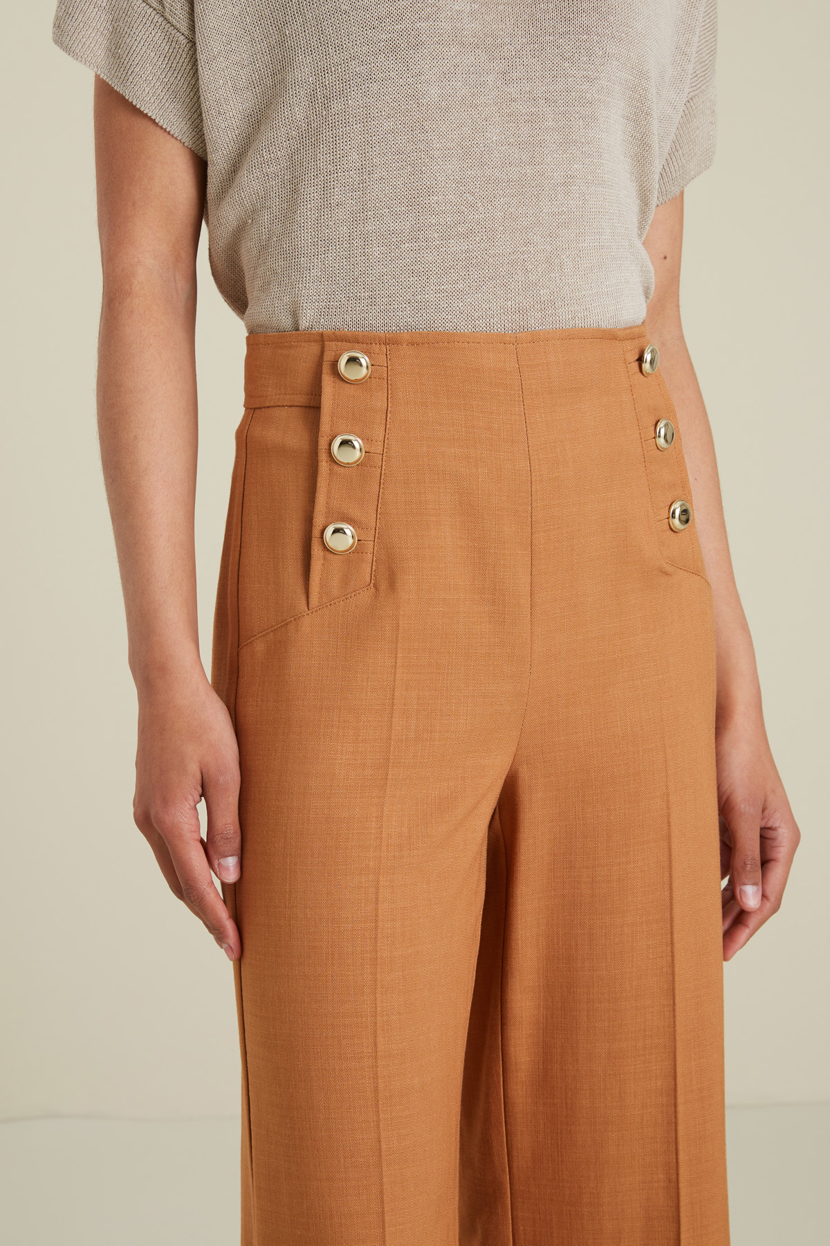 Pantaloni cropped a vita alta dalla linea dritta realizzati in tela di misto viscosa stretch, con dettaglio di bottoni metallici, tasche a filetto e allacciatura tramite zip invisibile e gancio nel retro.