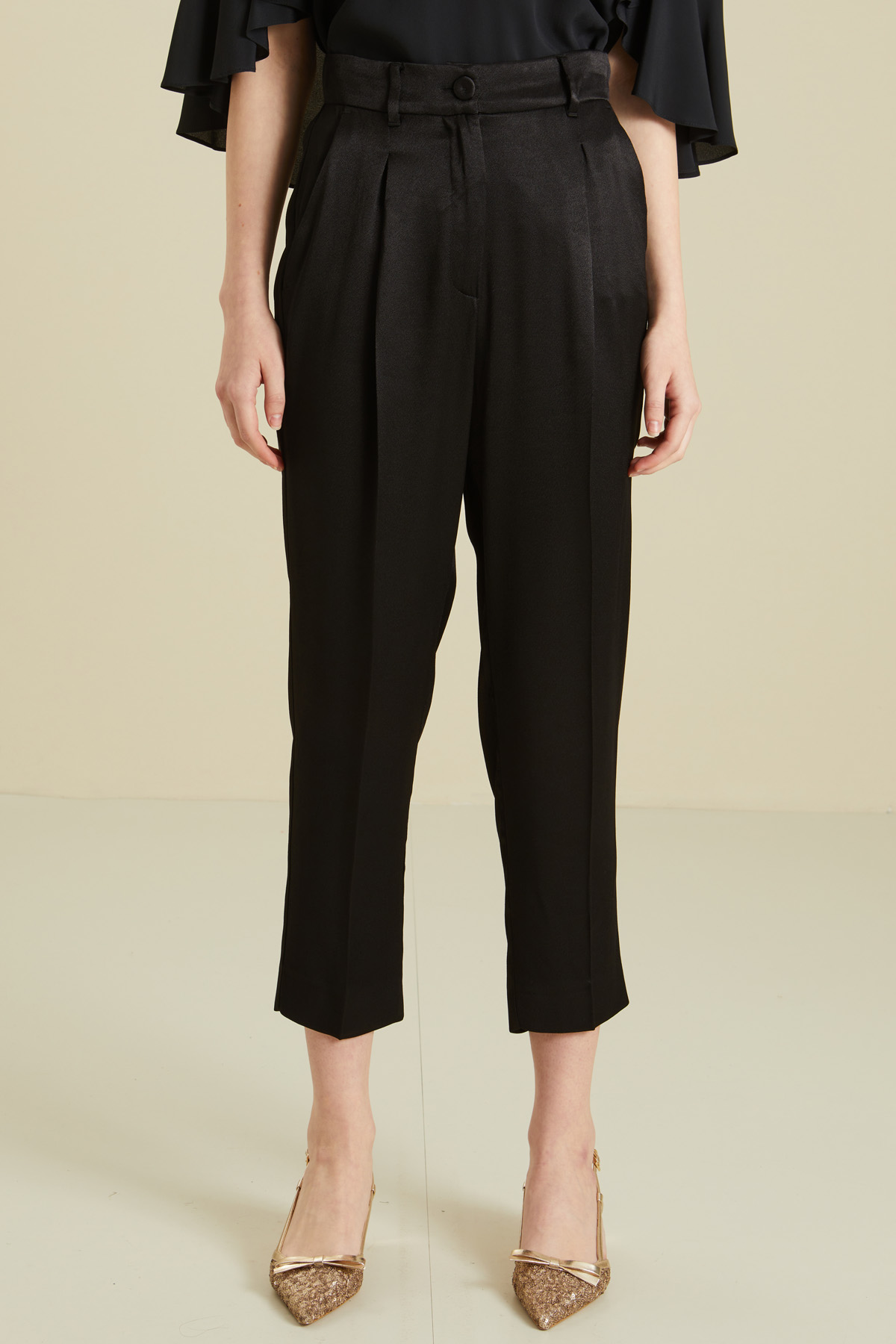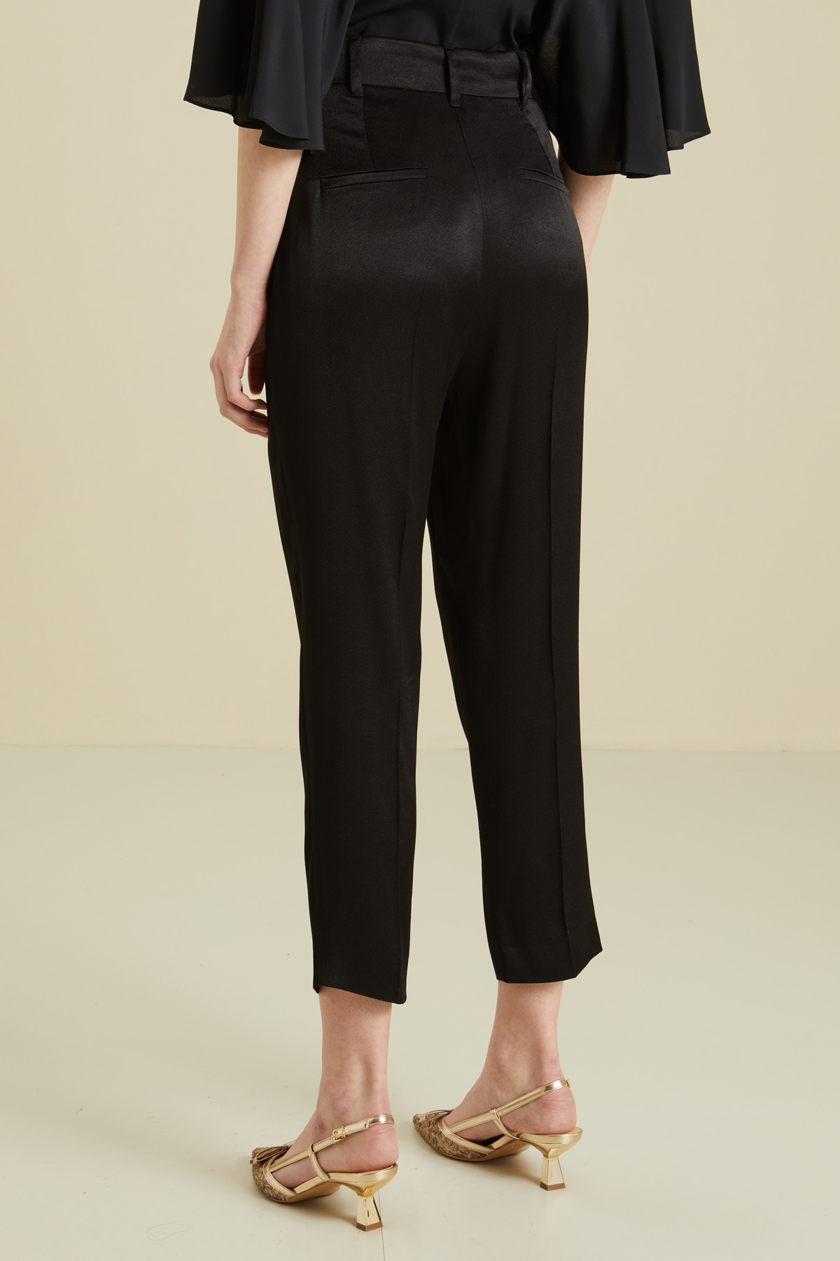 Pantaloni cropped a sigaretta realizzati in crèpe envers satin, con passanti, pinces in vita, tasche alla francese laterali e a filetto dietro. Chiusura con bottone ricoperto e zip nascosta.