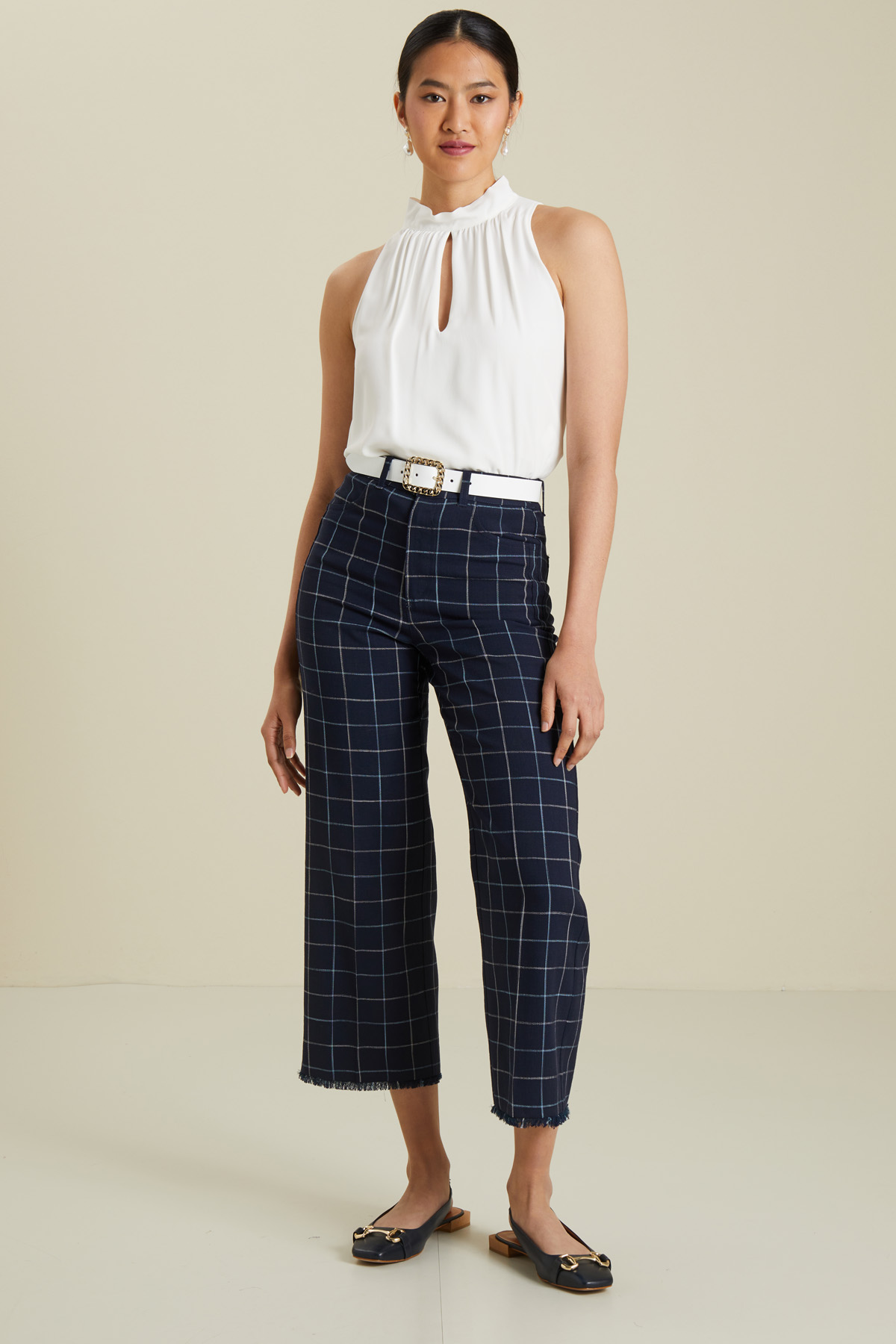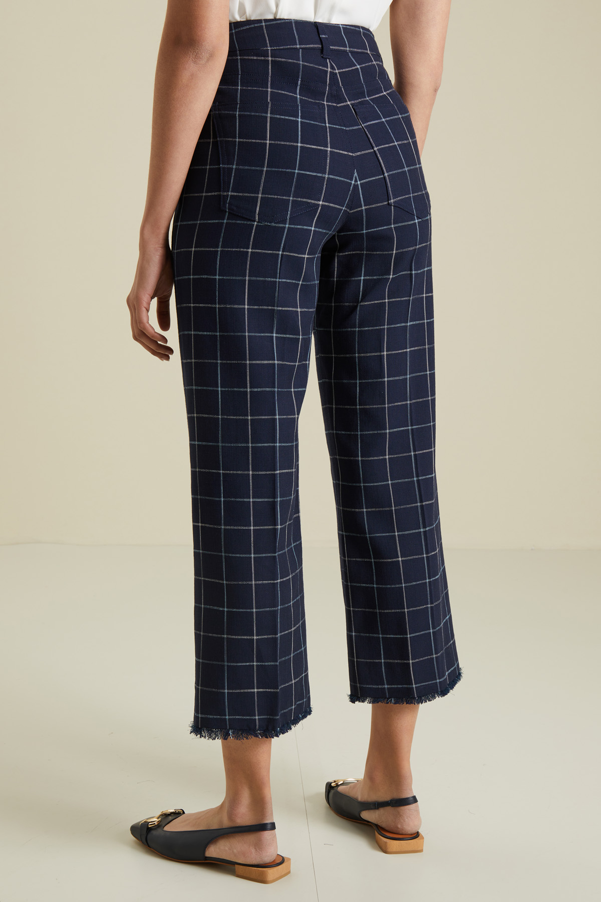 Pantaloni dalla linea dritta realizzati in stuoia di misto viscosa stretch tinto filo, con tasche alla francese sul davanti e applicate nel retro, fondo sfrangiato e allacciatura tramite zip nascosta e bottone.