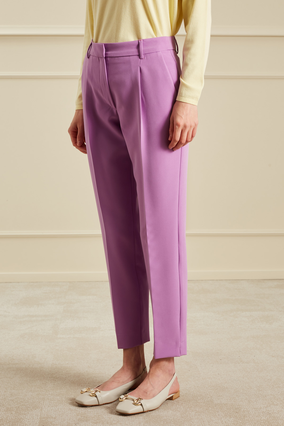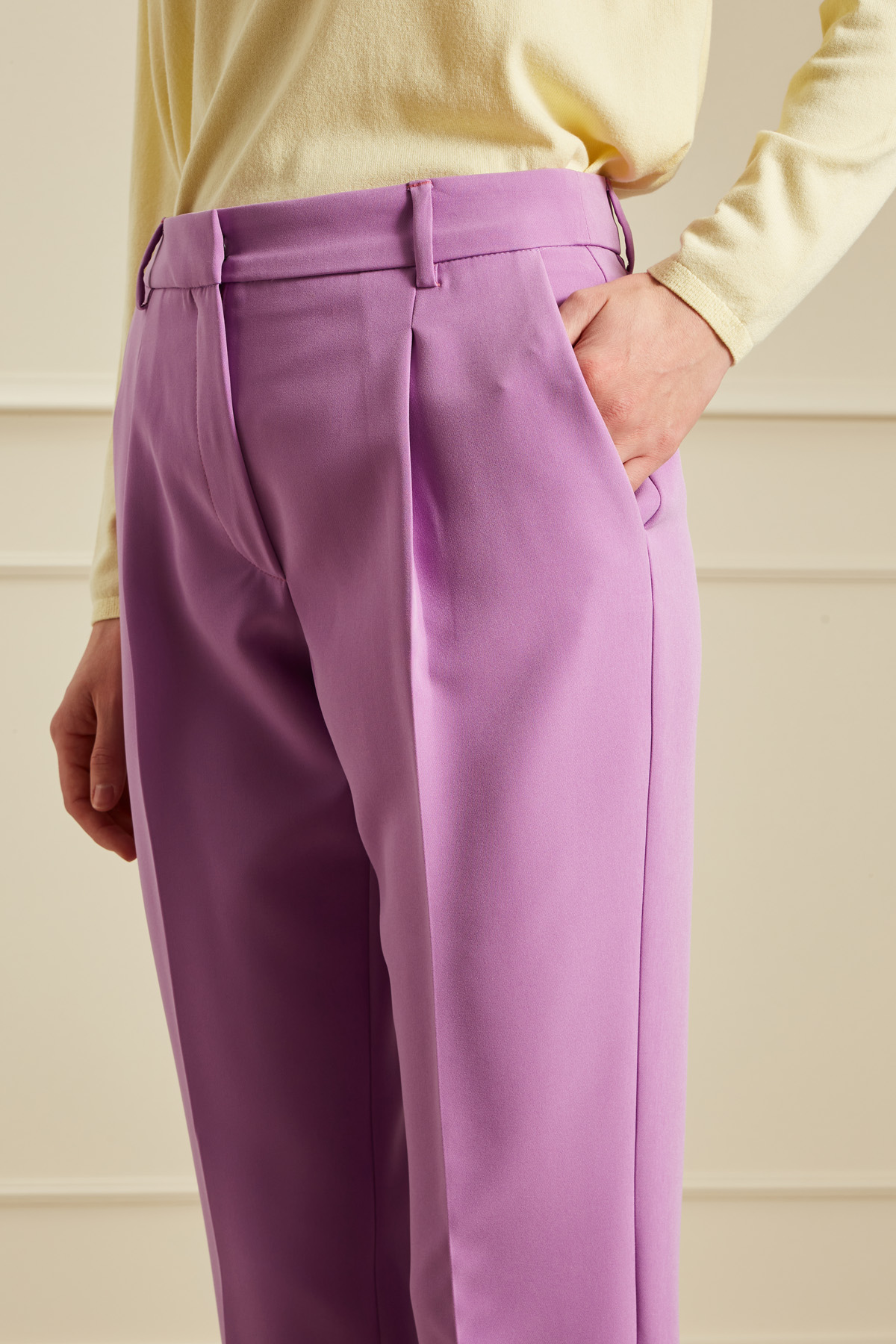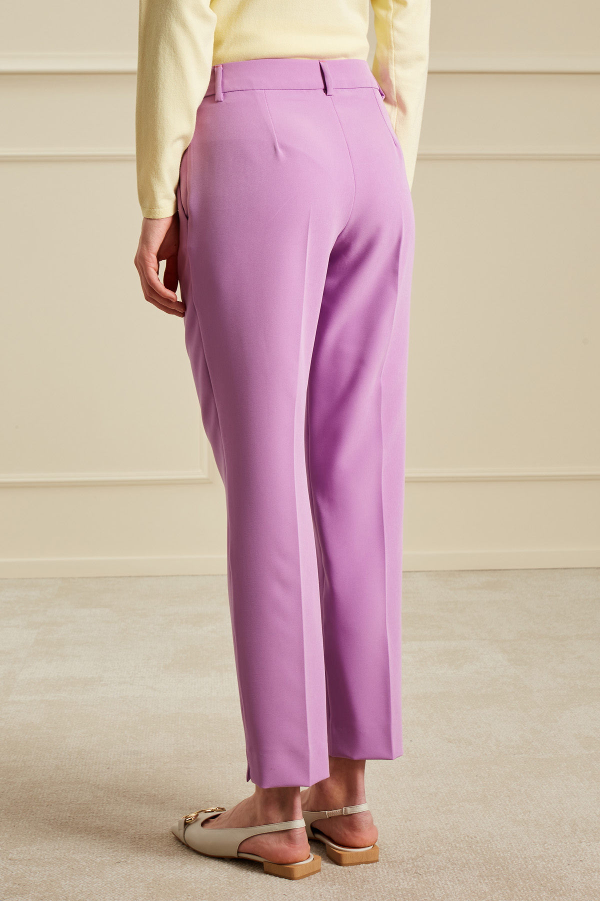 Pantaloni dalla linea dritta realizzati in cady stretch, con passanti in vita, tasche laterali alla francese, spacchetti al fondo e allacciatura nascosta tramite zip, bottone e gancio.