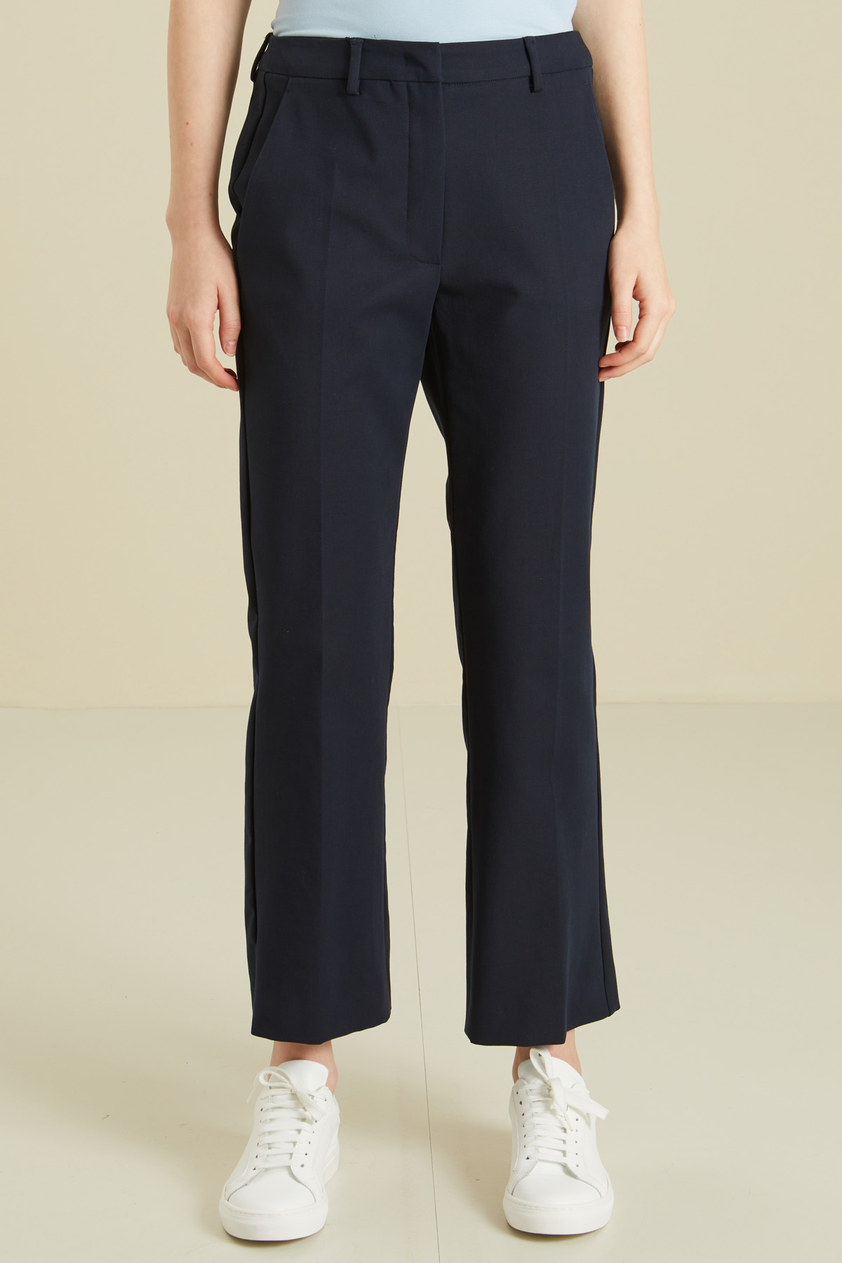 Pantaloni dalla linea leggermente svasata al fondo realizzati in tessuto di cotone stretch, con cintone e passanti in vita, piega stirata, tasche alla francese ai fianchi e a filetto dietro. Chiusura coperta tramite zip, gancio e bottone.
