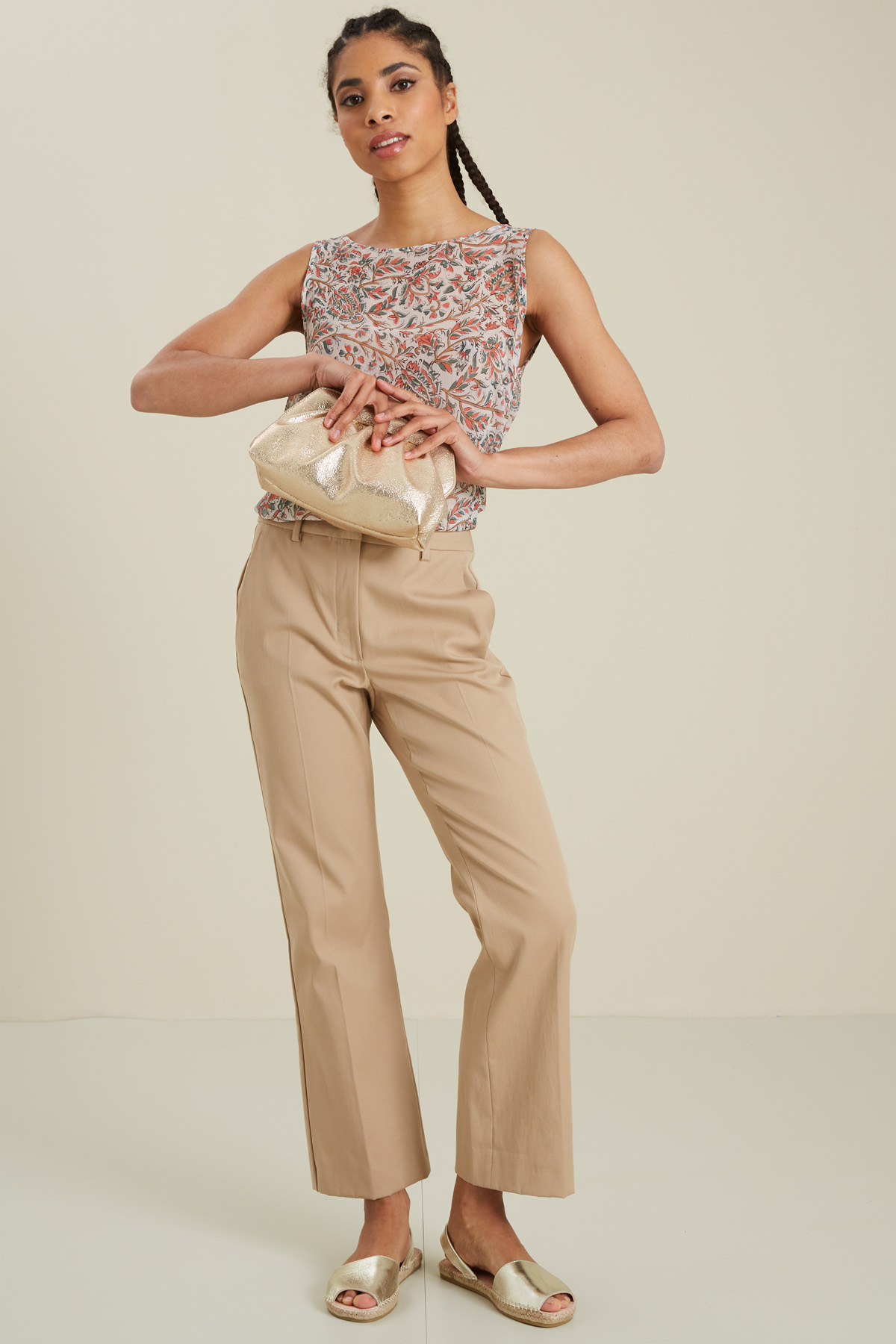 Pantaloni dalla linea leggermente svasata al fondo realizzati in tessuto di cotone stretch, con cintone e passanti in vita, piega stirata, tasche alla francese ai fianchi e a filetto dietro. Allacciatura nascosta tramite zip, gancio e bottone.