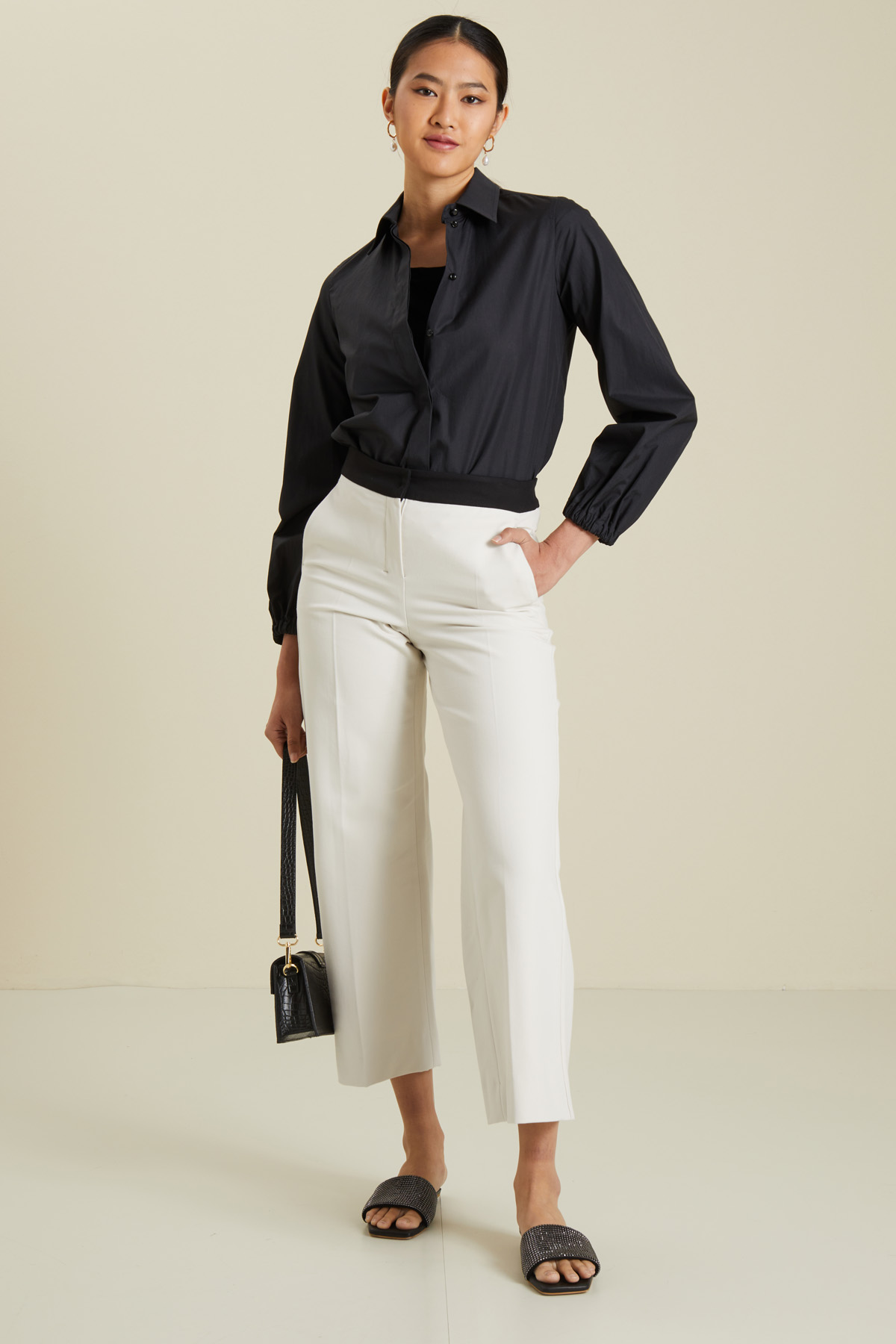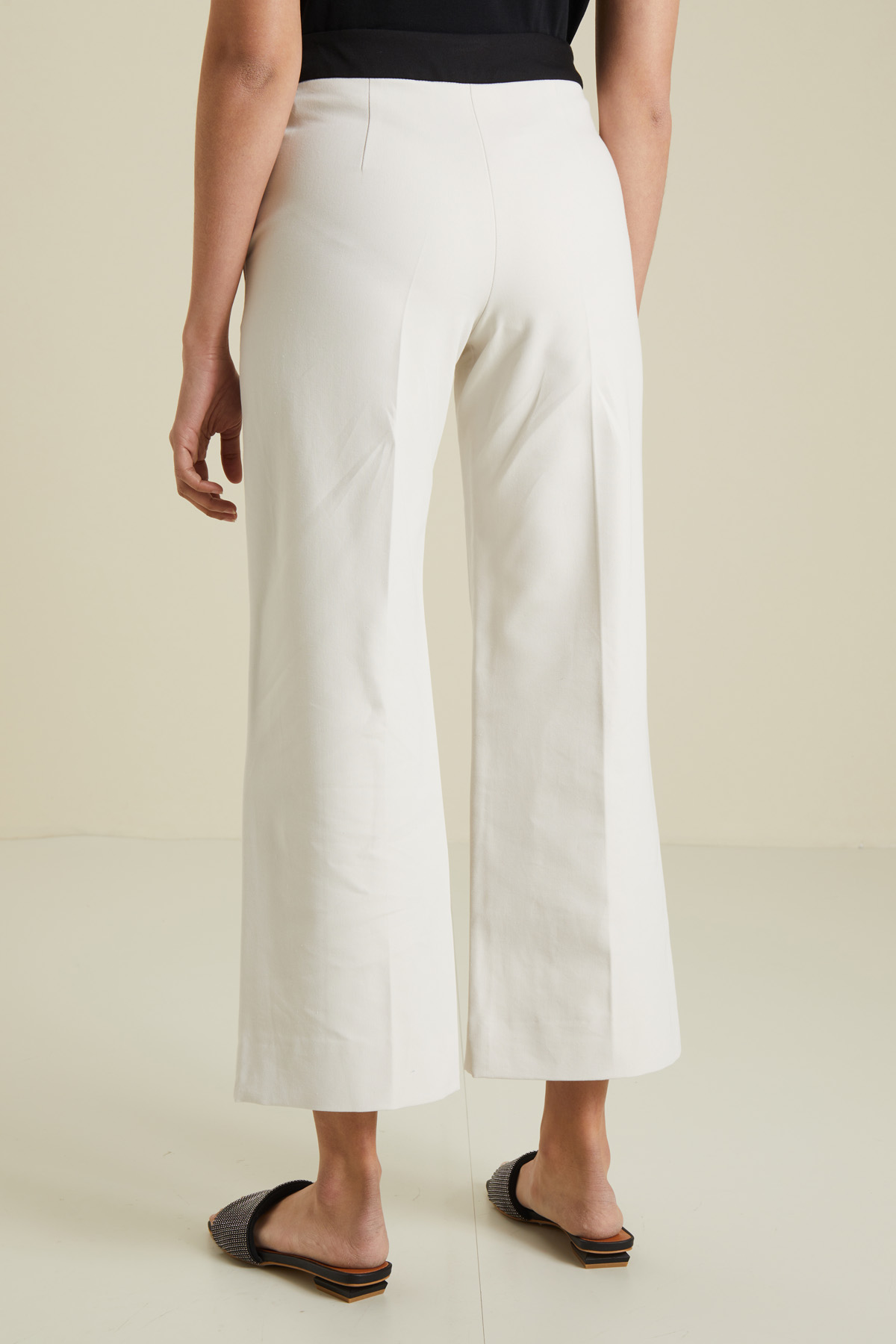 Pantaloni ampi realizzati in tessuto doppio di cotone e viscosa stretch, con cintone a contrasto in vita, tasche alla francese sui fianchi e allacciatura nascosta tramite zip, bottone e gancio.