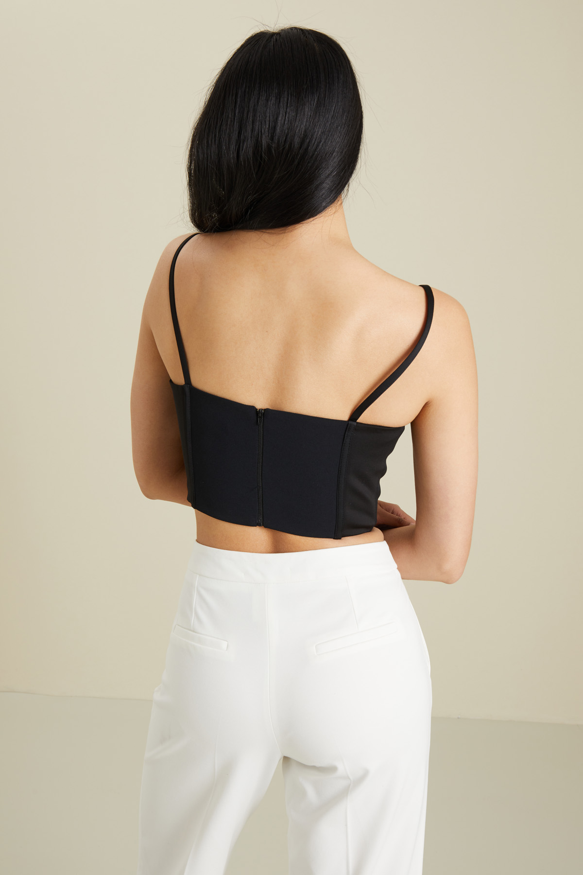 Crop top dalla linea a bustino realizzato in enver satin, con scollo ampio e spalline sottili. Allacciatura tramite zip nel retro.