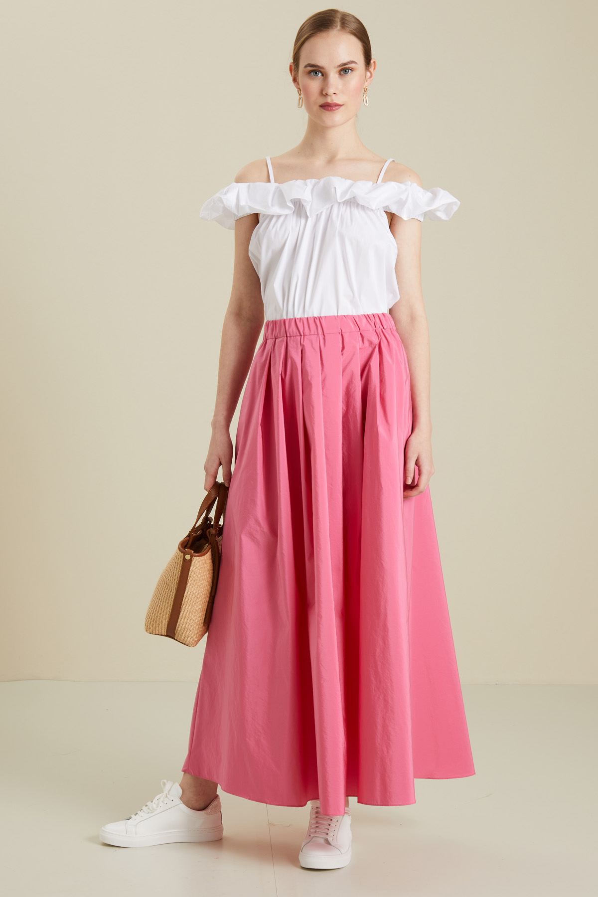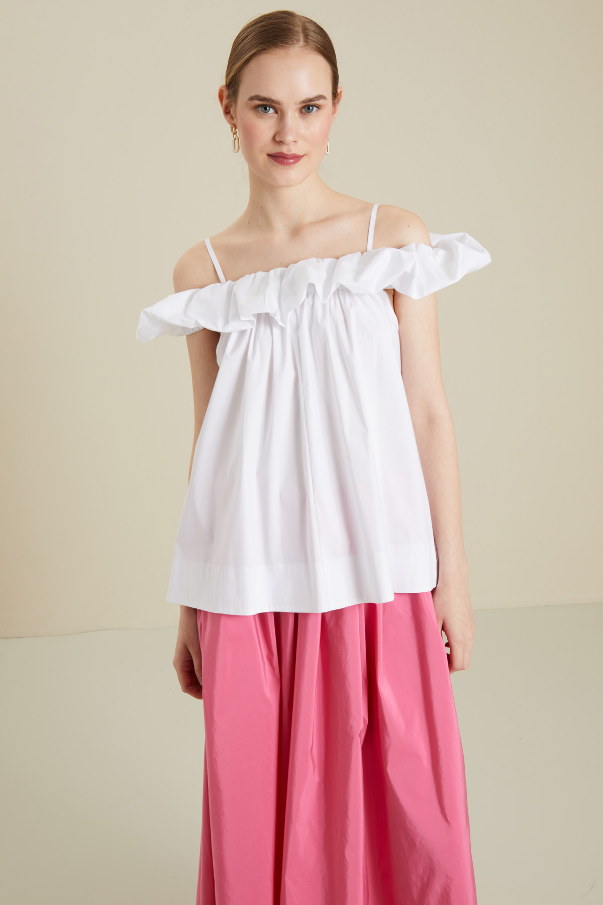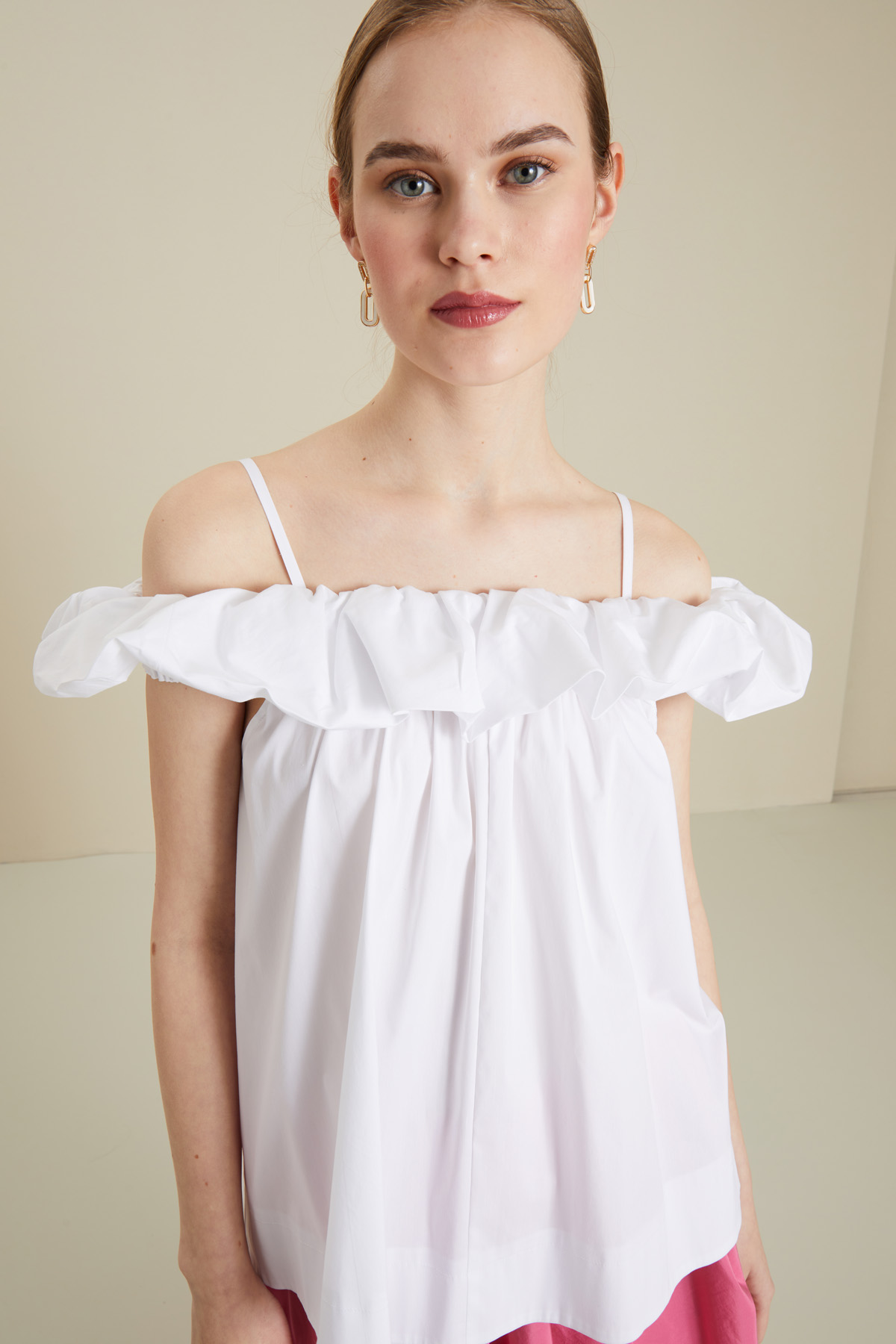 Top dalla linea dritta realizzato in popeline di misto cotone, con motivo di balza sullo scollo, spalline sottili e maniche ad aletta.