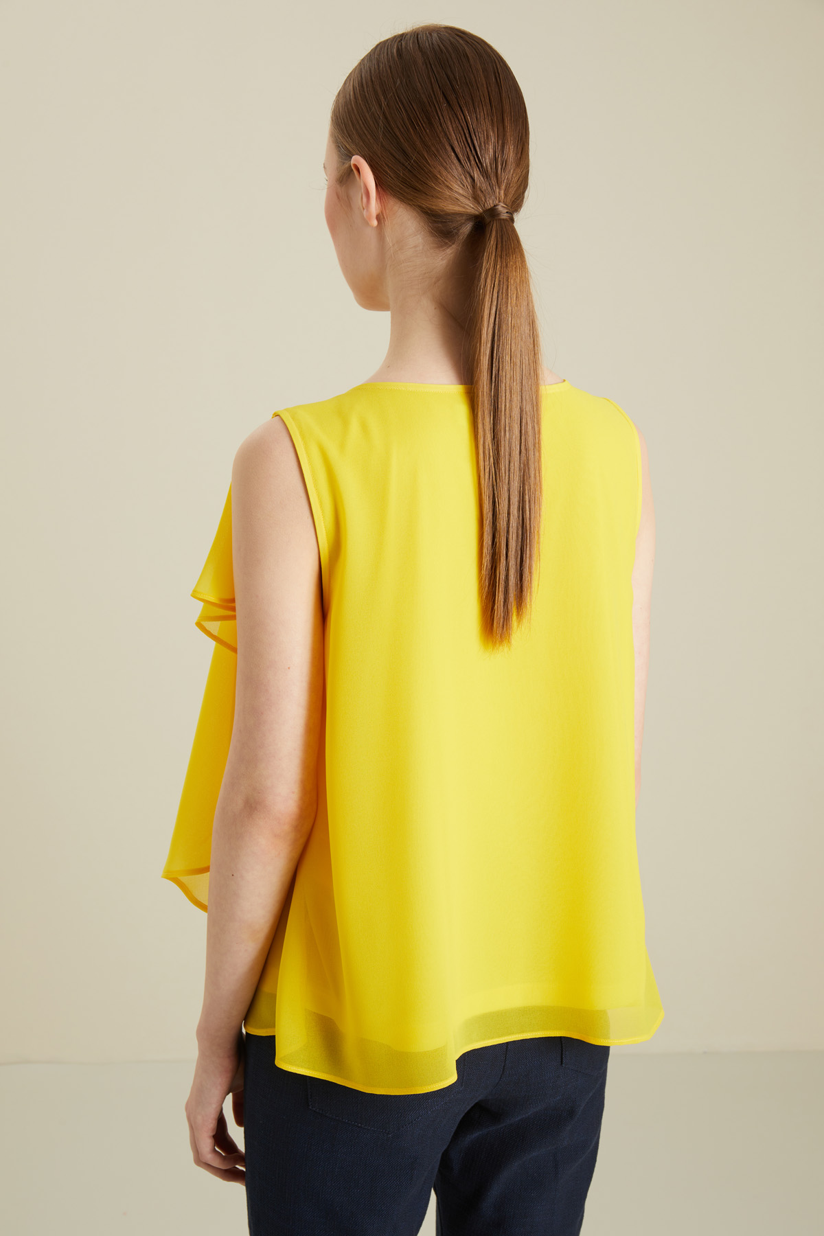 Top dalla linea dritta realizzata in tessuto crepe con scollo rotondo e volant ad inserto sul davanti.
