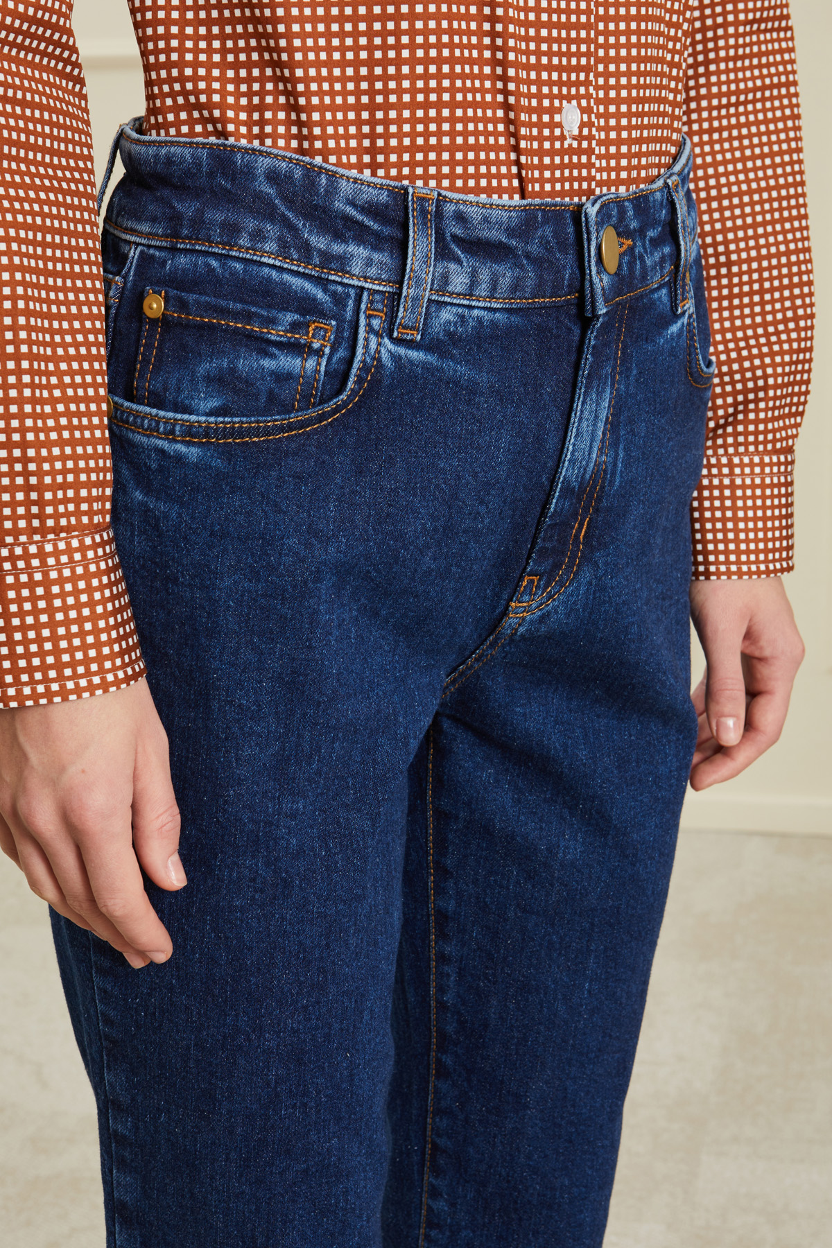 Jeans dalla linea dritta realizzati in denim di cotone stretch, con passanti in vita, cinque tasche e allacciatura tramite zip nascosta e bottone metallico.