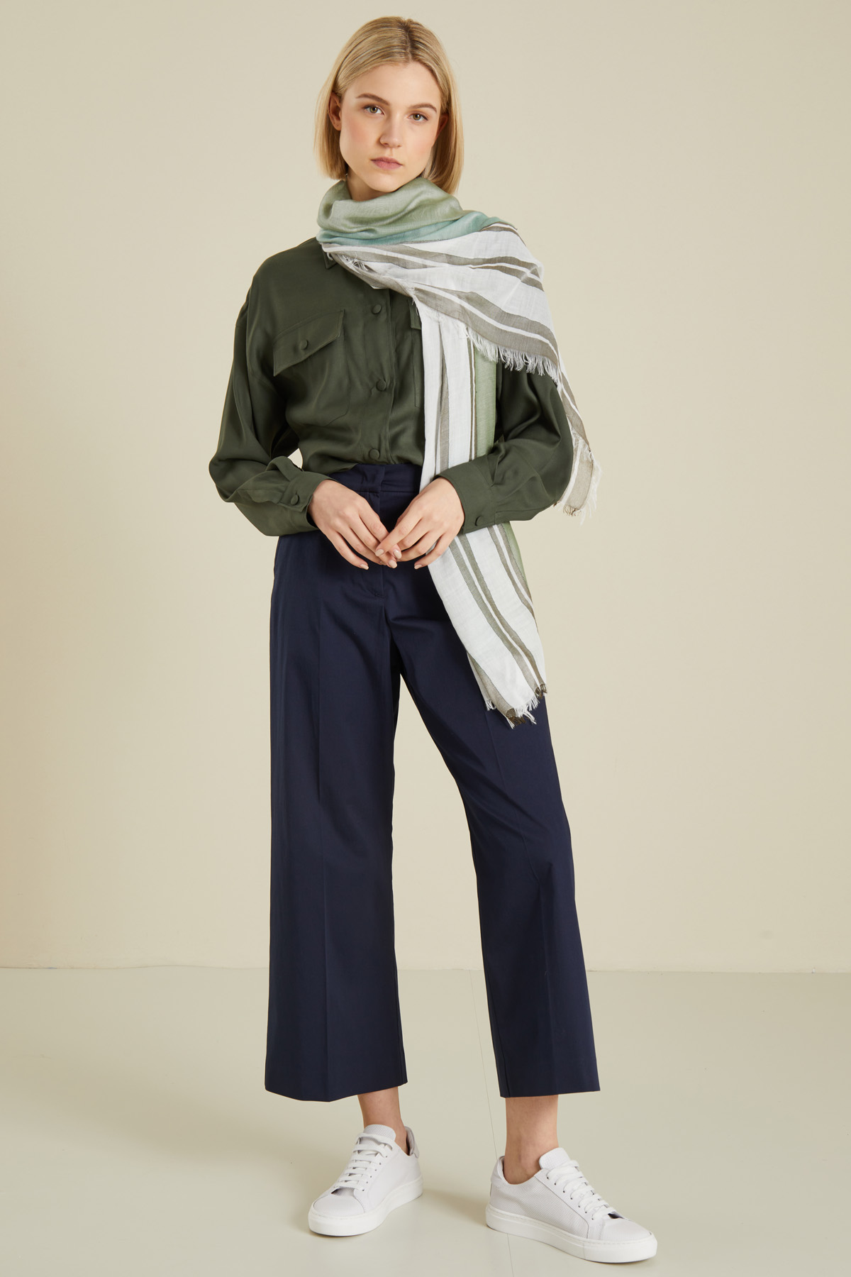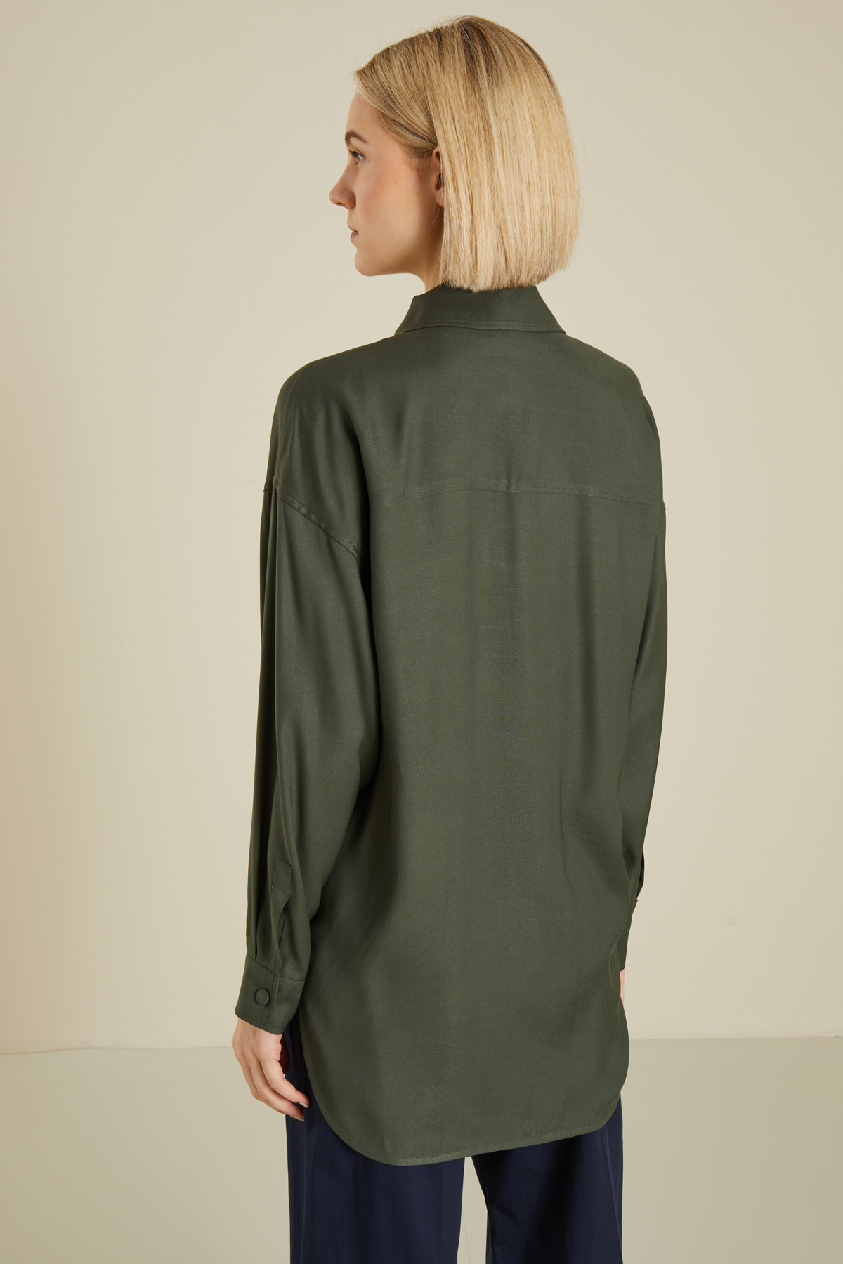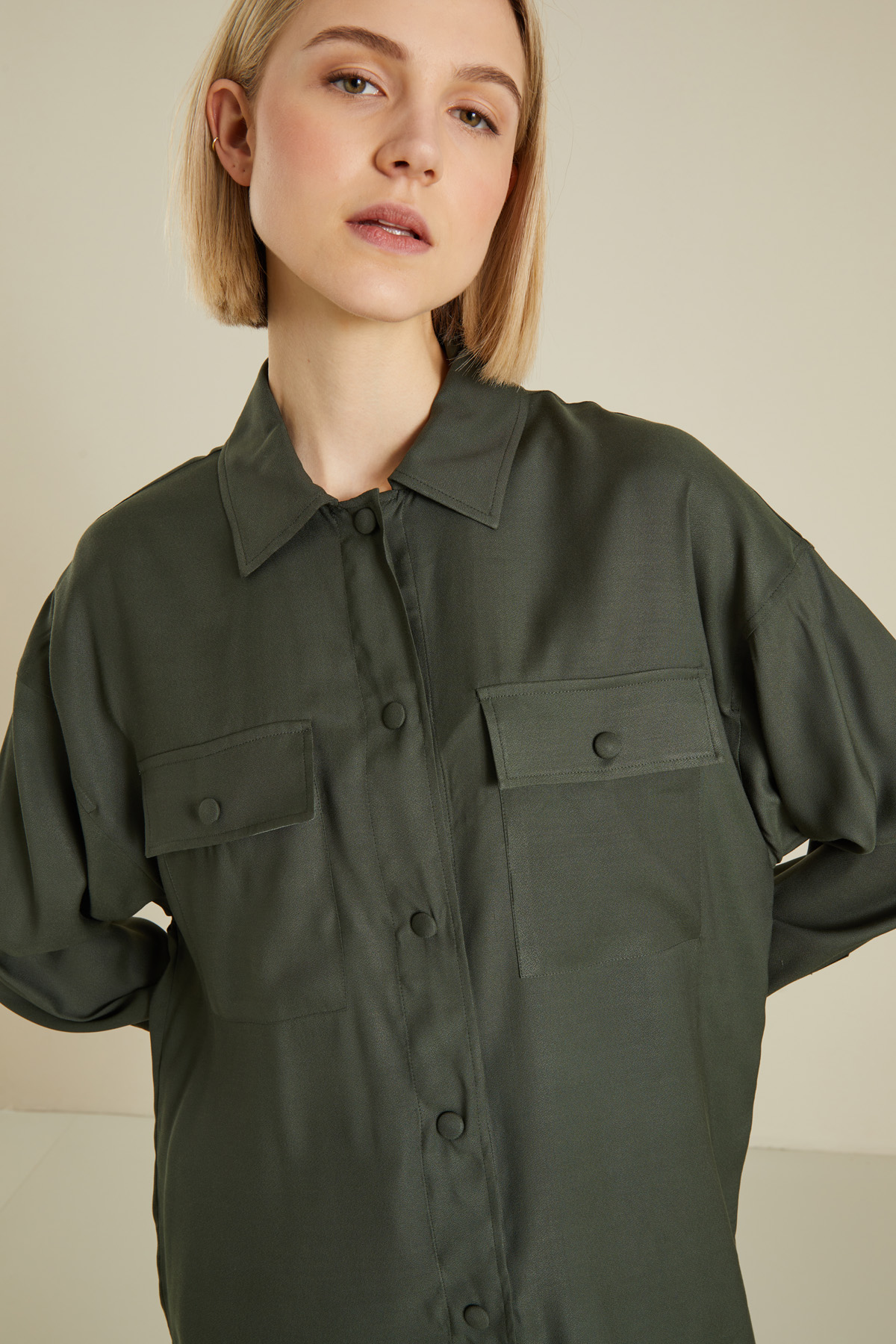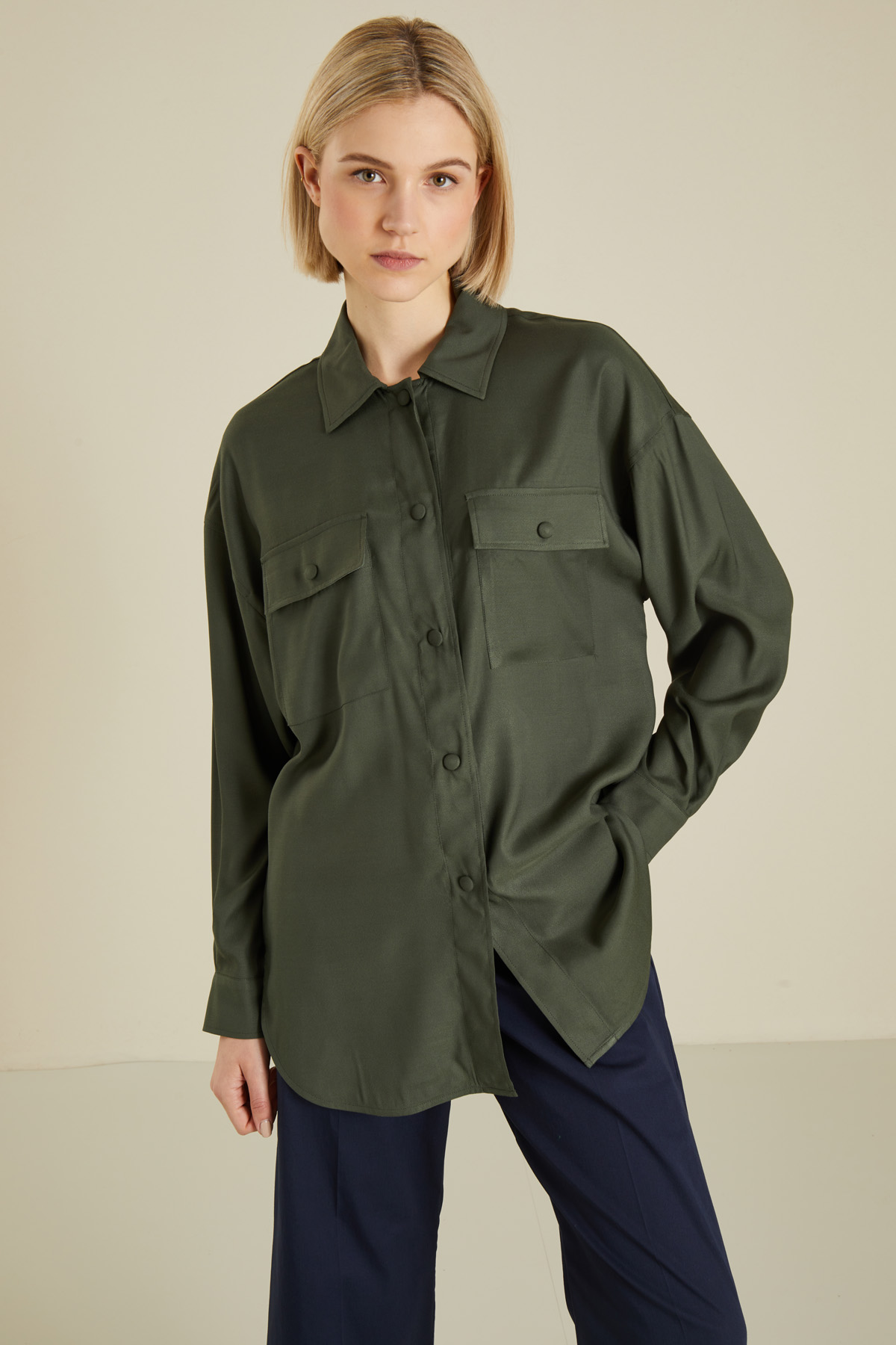Camicia dalla linea over realizzata in tessuto fluido di pura viscosa, con colletto classico, maniche lunghe con polsino e bottone ricoperto, taschini applicati con patta al petto, spacchetti laterali e fondo arrotondato. Allacciatura tramite bottoni automatici ricoperti.