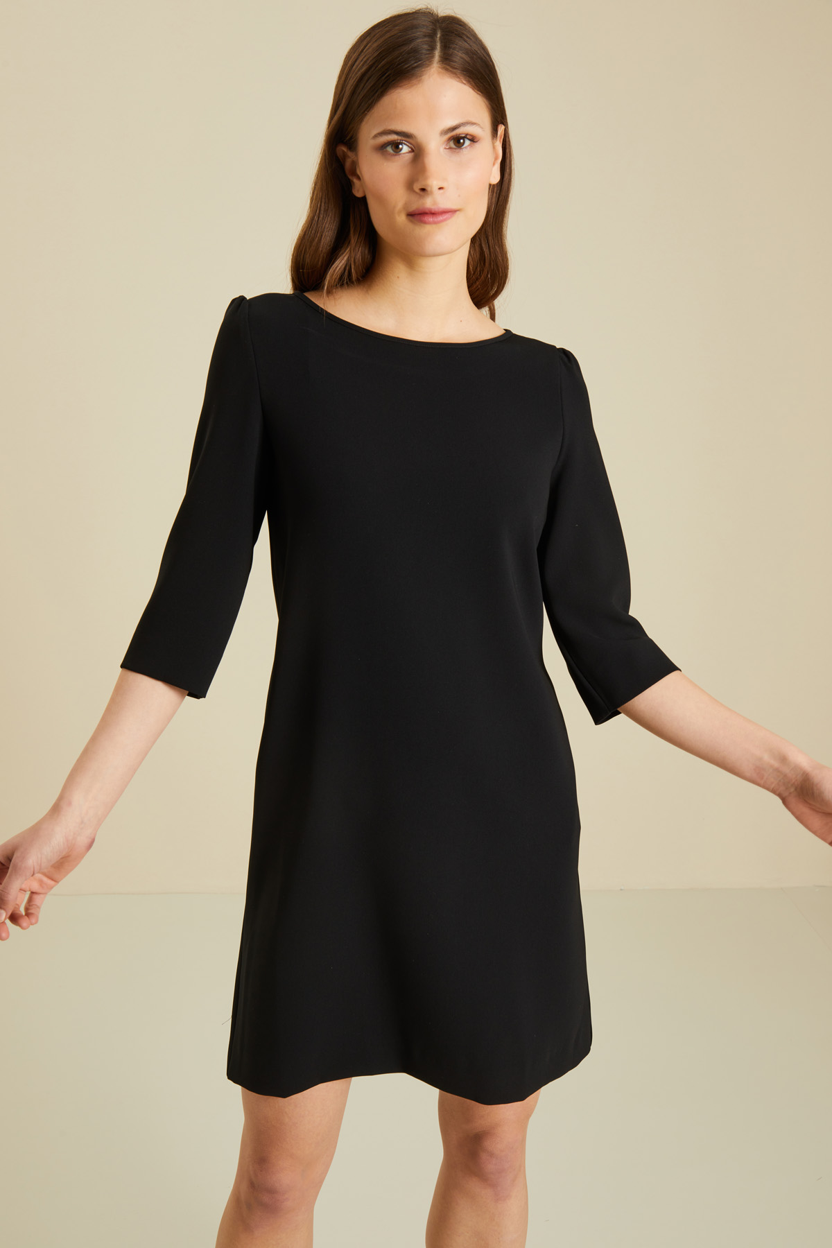 Abito corto dalla linea dritta realizzato in cady con scollo rotondo, maniche a tre quarti, tasche laterali inserite in cucitura e allacciatura sul retro tramite cerniera invisibile.