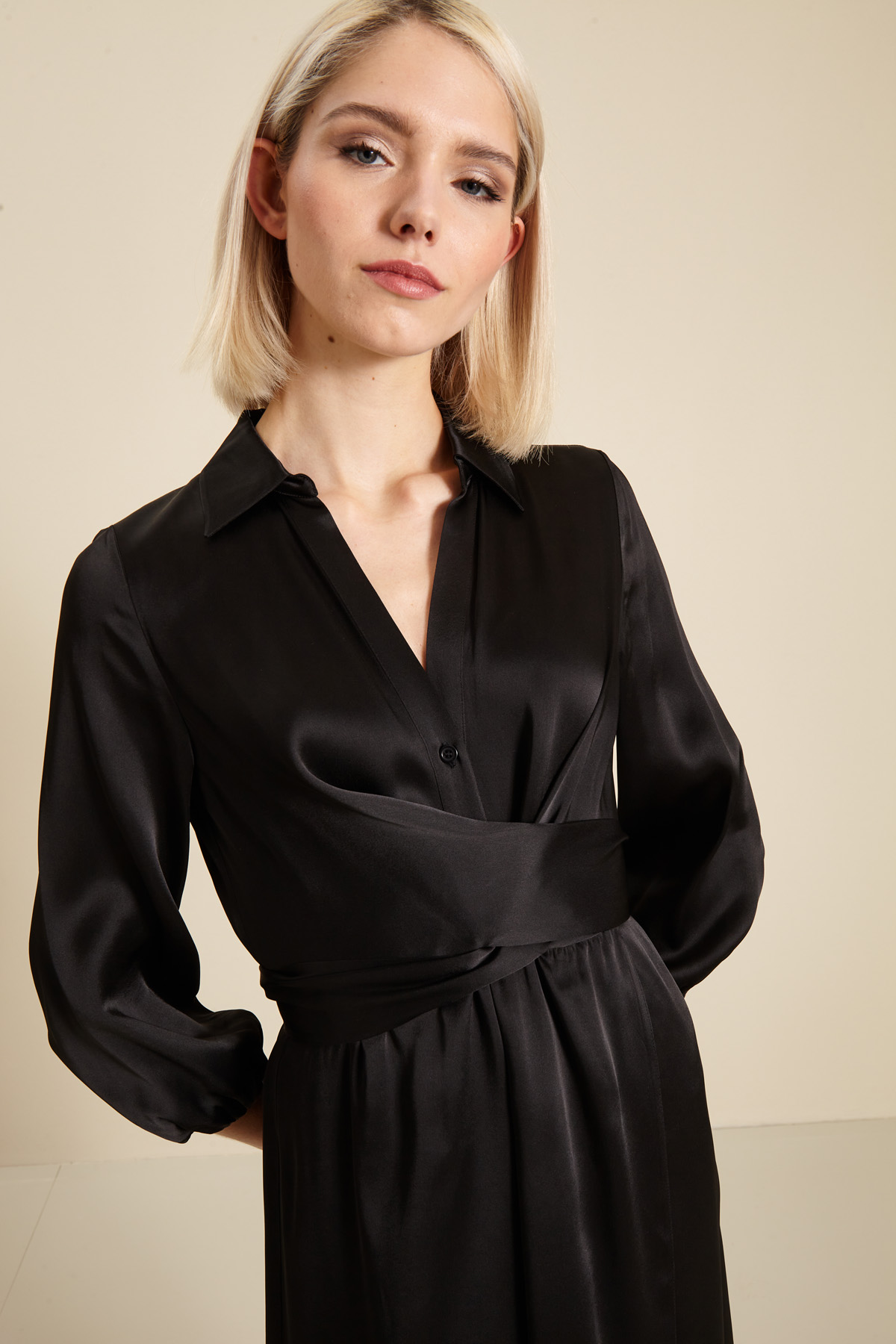 Chemisier dalla linea fluida realizzato in raso, con colletto a camicia, apertura a V tramite bottoni sul davanti, maniche a tre quarti, inserto elastico al polso e in vita. Dettaglio di lembi da annodare in vita stile fusciacca.