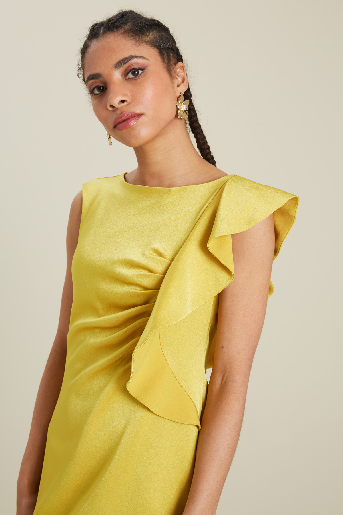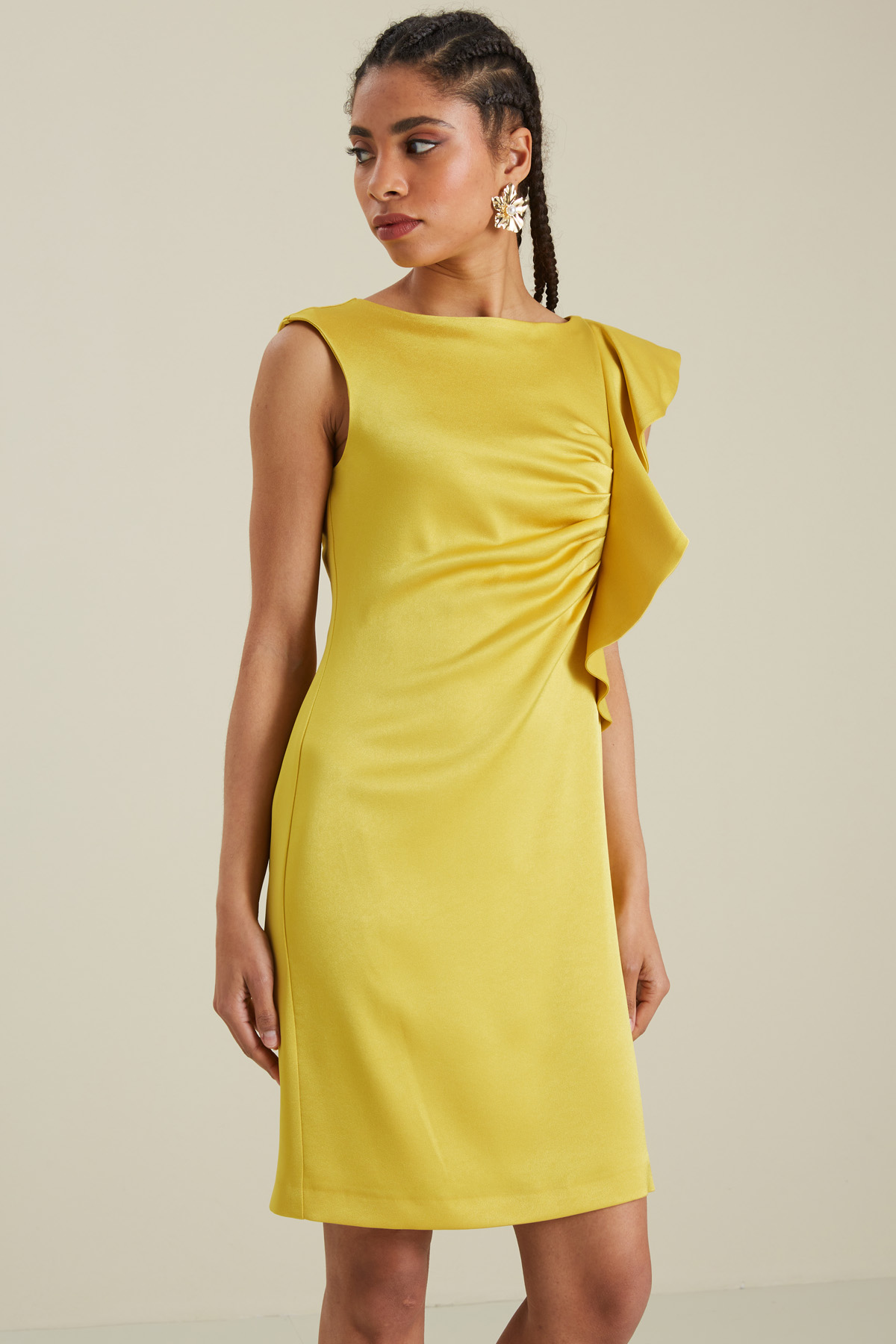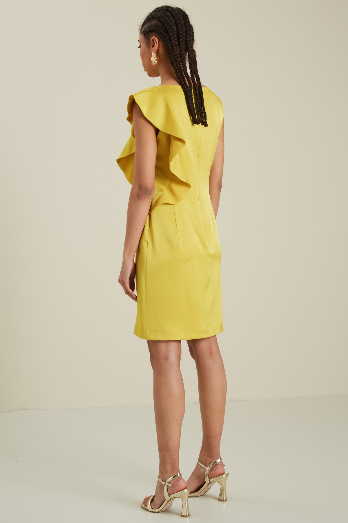 Tubino smanicato realizzato in enver satin con scollo a barchetta, dettaglio di volant e arricciatura, allacciatura tramite zip invisibile nel retro. Foderato.
