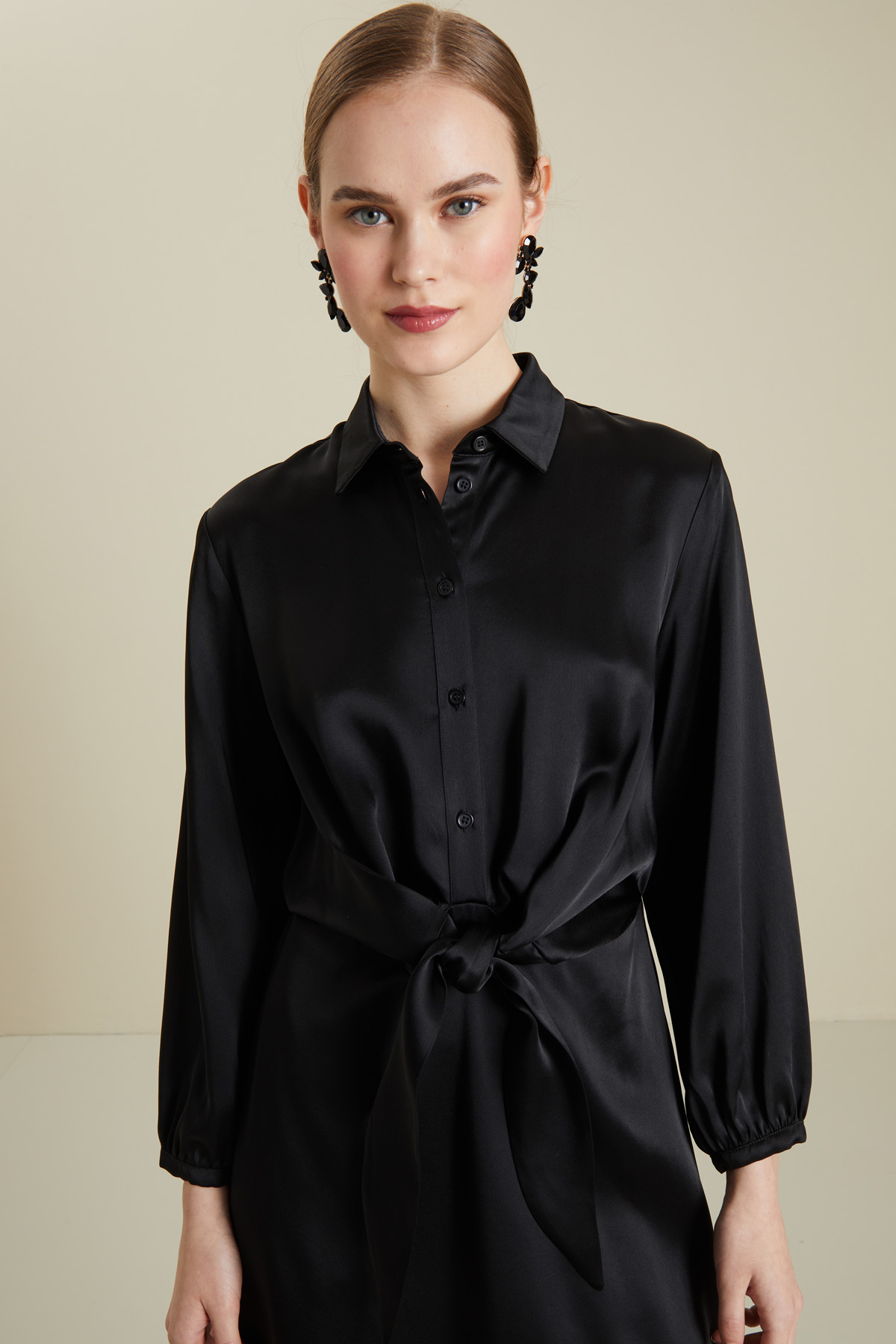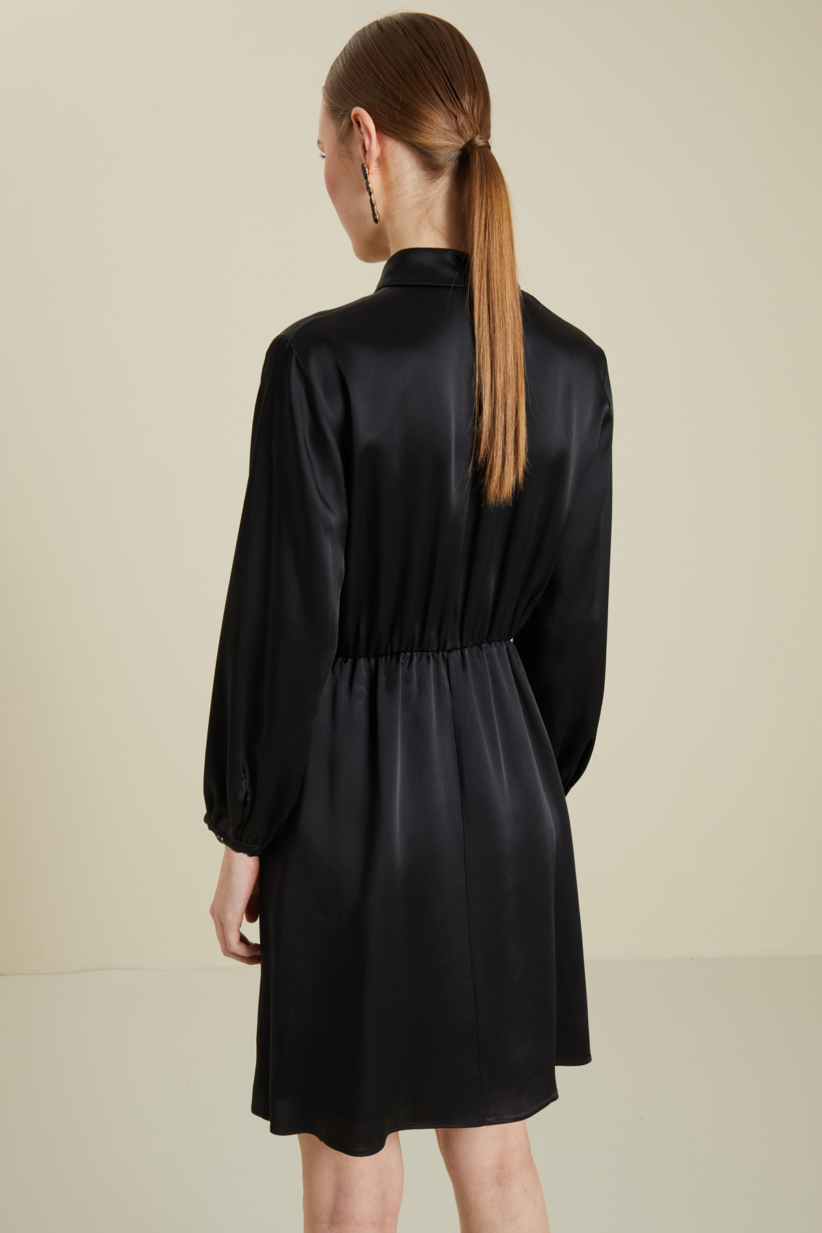 Abito dalla linea sfiacata realizzato in raso, con colletto a camicia, maniche lunghe con polsino e bottone, nastri da annodare in vita e gonna svasata. Allacciatura tramite bottoni.