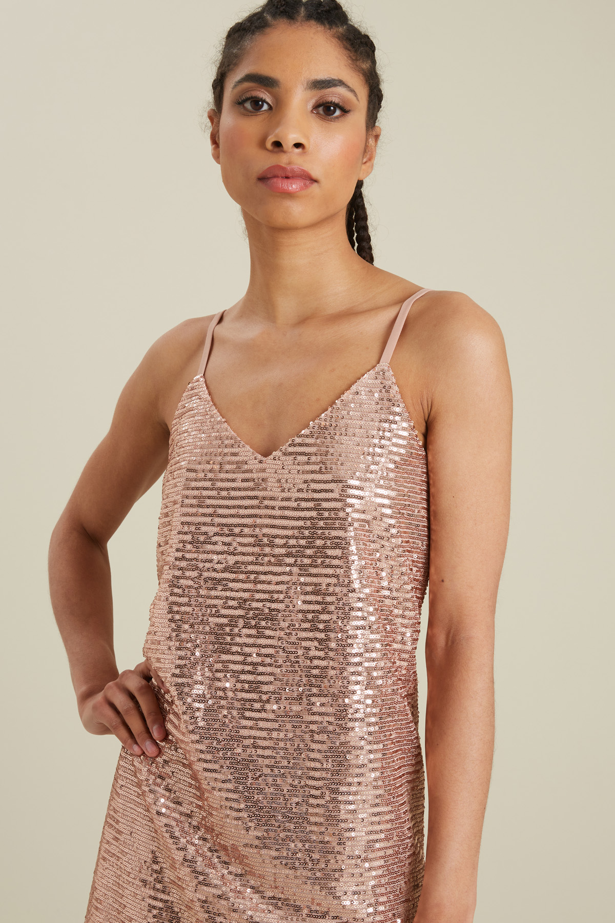 Abito corto a sottoveste realizzato in tulle con motivo di paillettes ricamato all over, scollo a V, spalline sottili regolabili. Foderato.