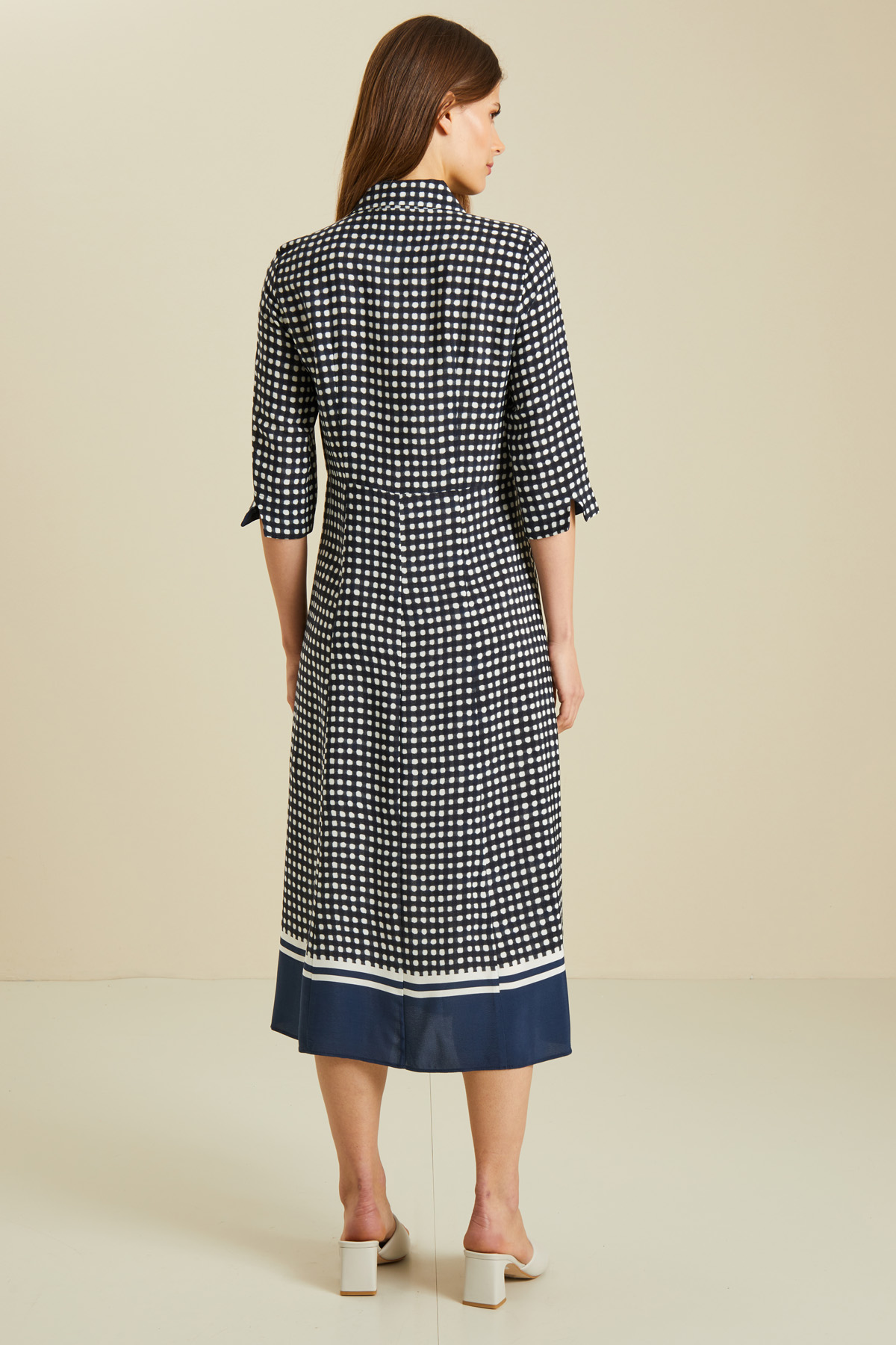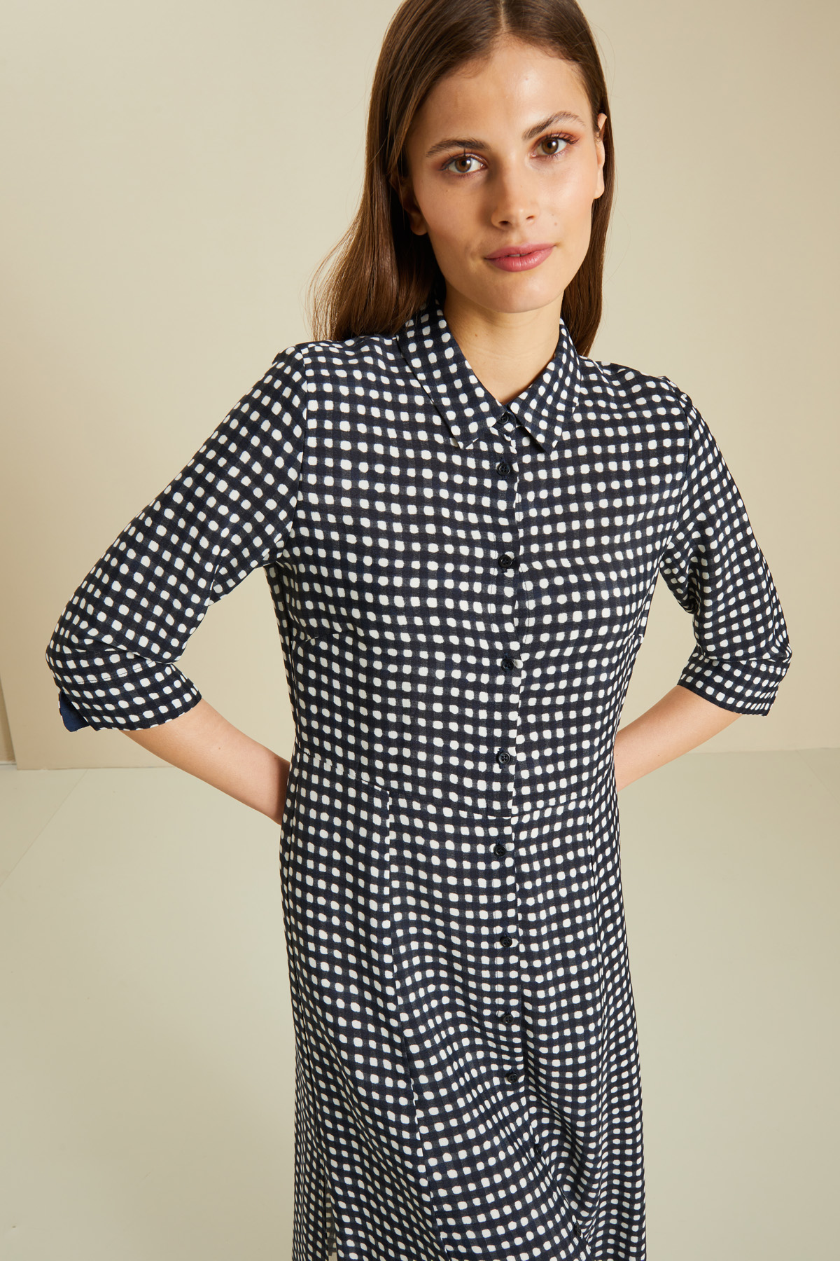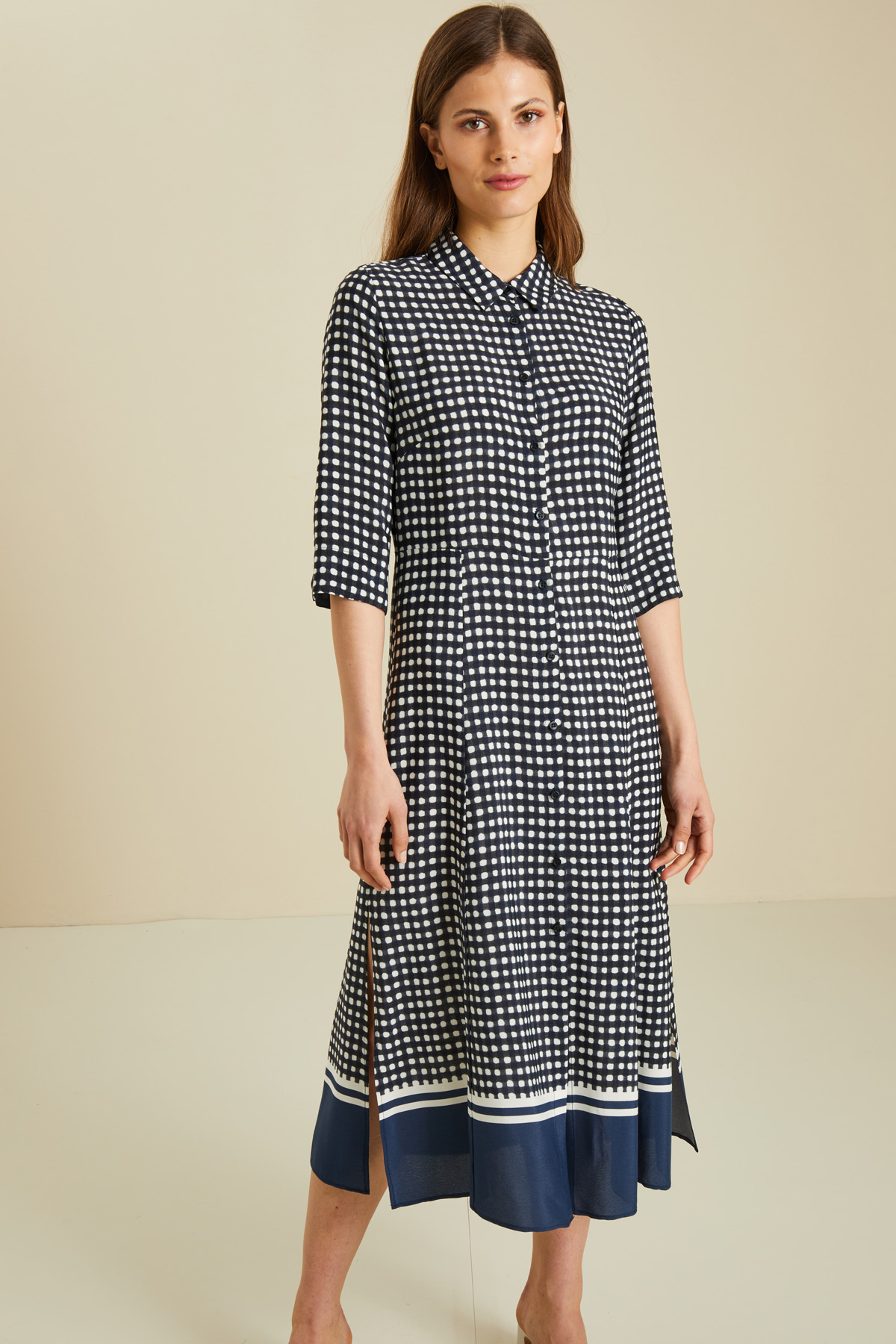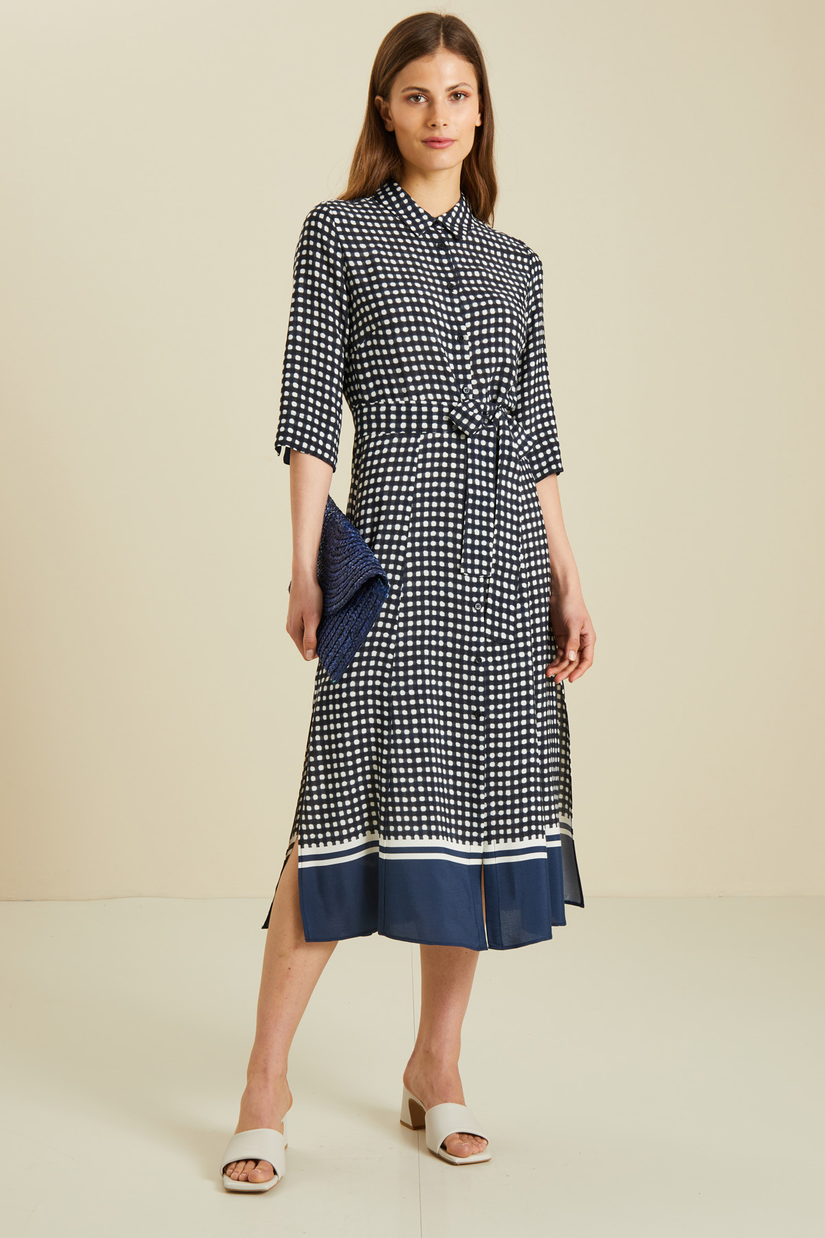 Abito chemisier realizzato in tessuto fluido di viscosa stampato fantasia con colletto a camicia, maniche a tre quarti con polsini, spacchi laterali e allacciatura tramite bottoni. Cintura coordinata da avvolgere e annodare sul punto vita.