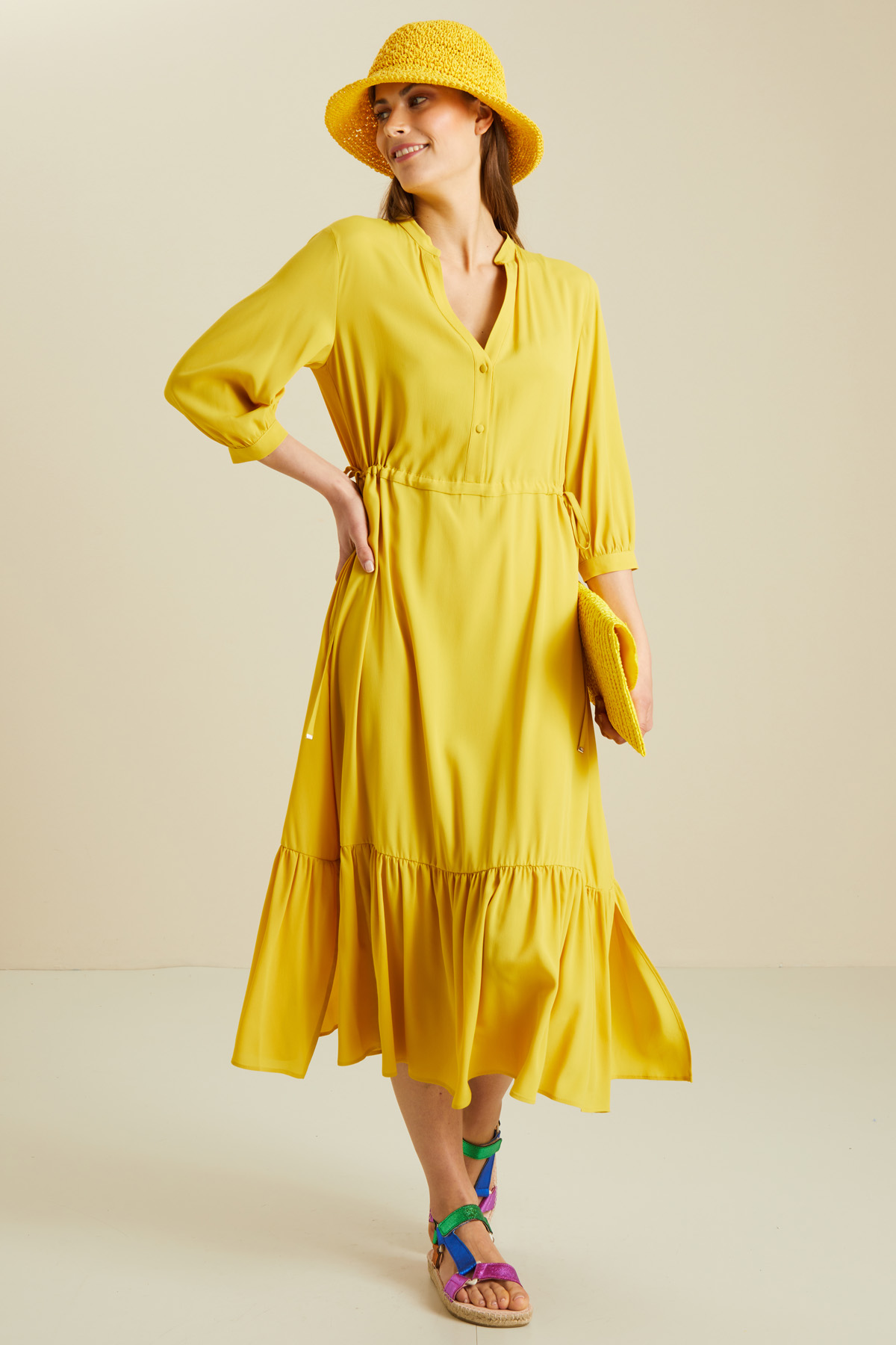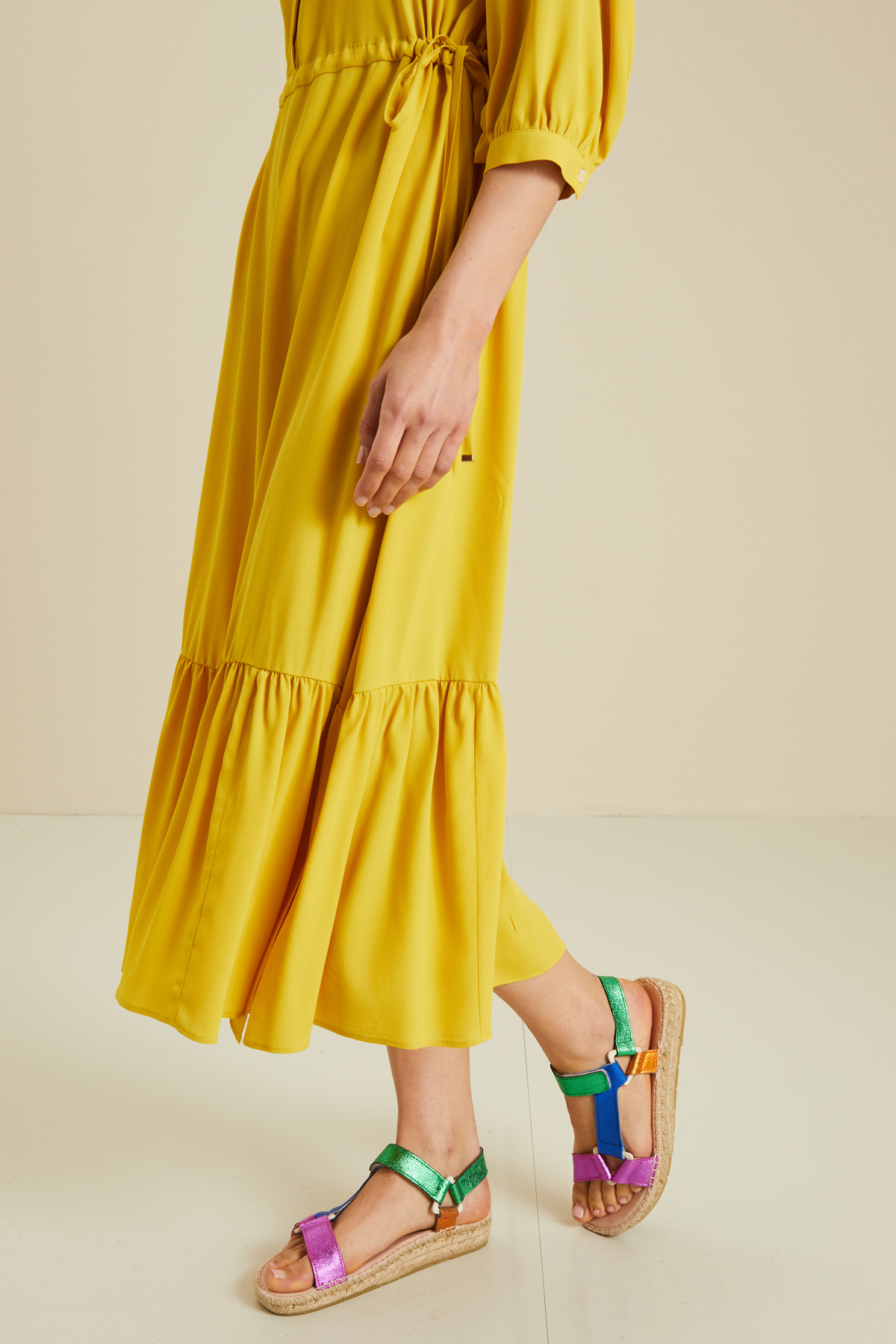 Abito fluido midi realizzato in crepe di misto seta con scollo a V rifinito da bottoni rivestiti, maniche a tre quarti, coulisse regolabile sul punto vita e balza sul fondo.