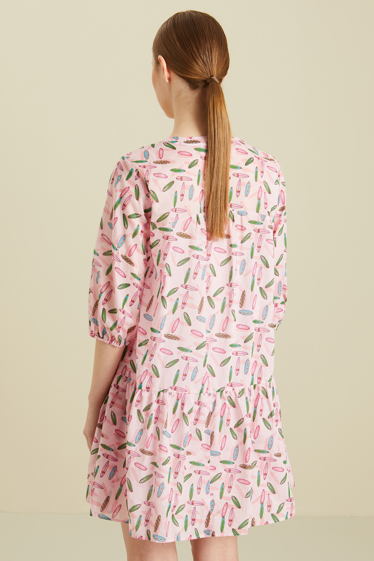 Abito a grembiule realizzato in mussola di puro cotone stampato fantasia con scollo a V, maniche a tre quarti con inserti elastici, balza sul fondo e allacciatura tramite bottoni.