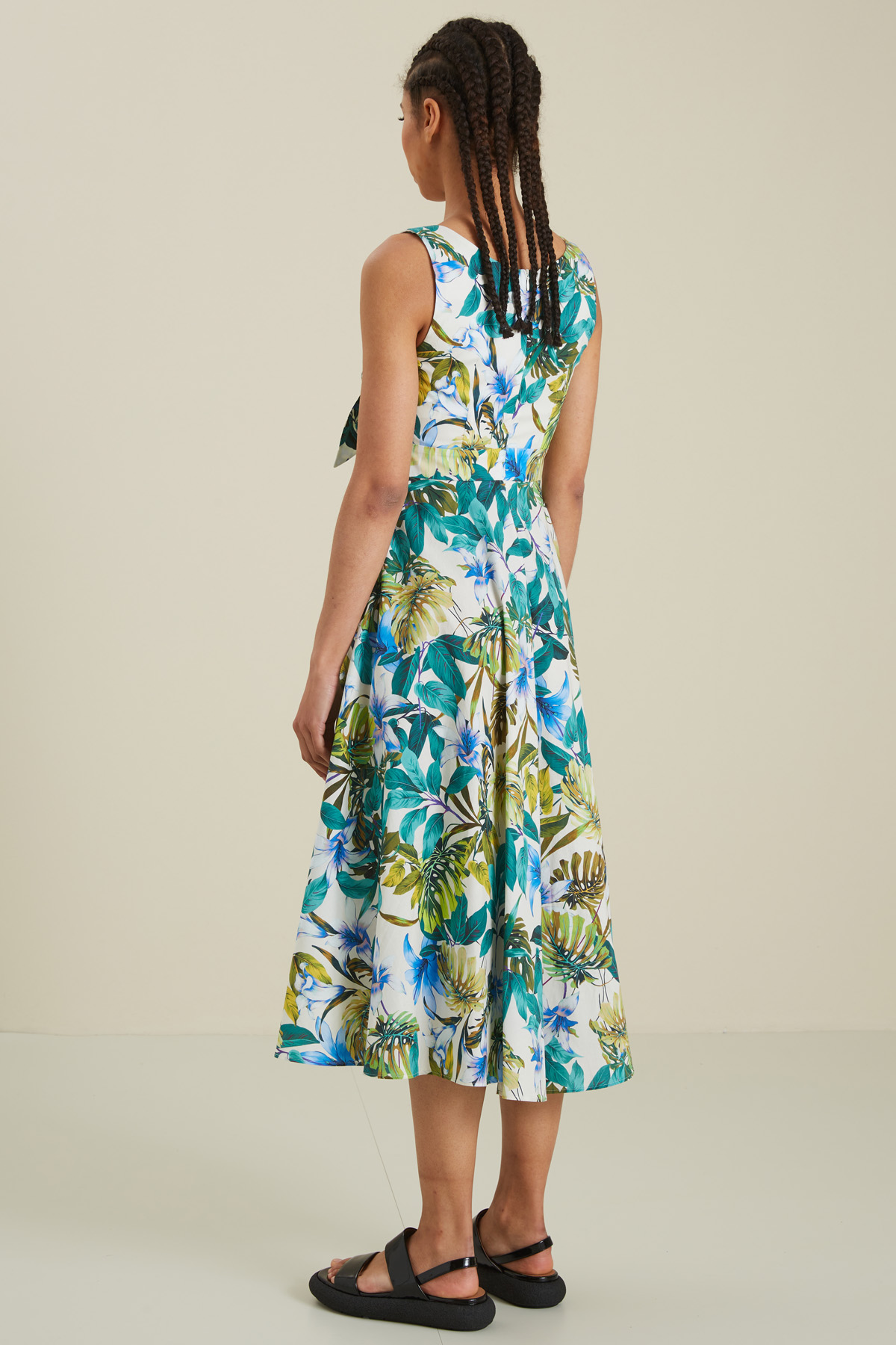 Abito smanicato dalla linea svasata realizzato in popeline di cotone stretch stampato, scollo a V con dettaglio di fiocco, spalline spesse, cintone in vita e allacciatura tramite zip invisibile nel retro. Semifoderato.