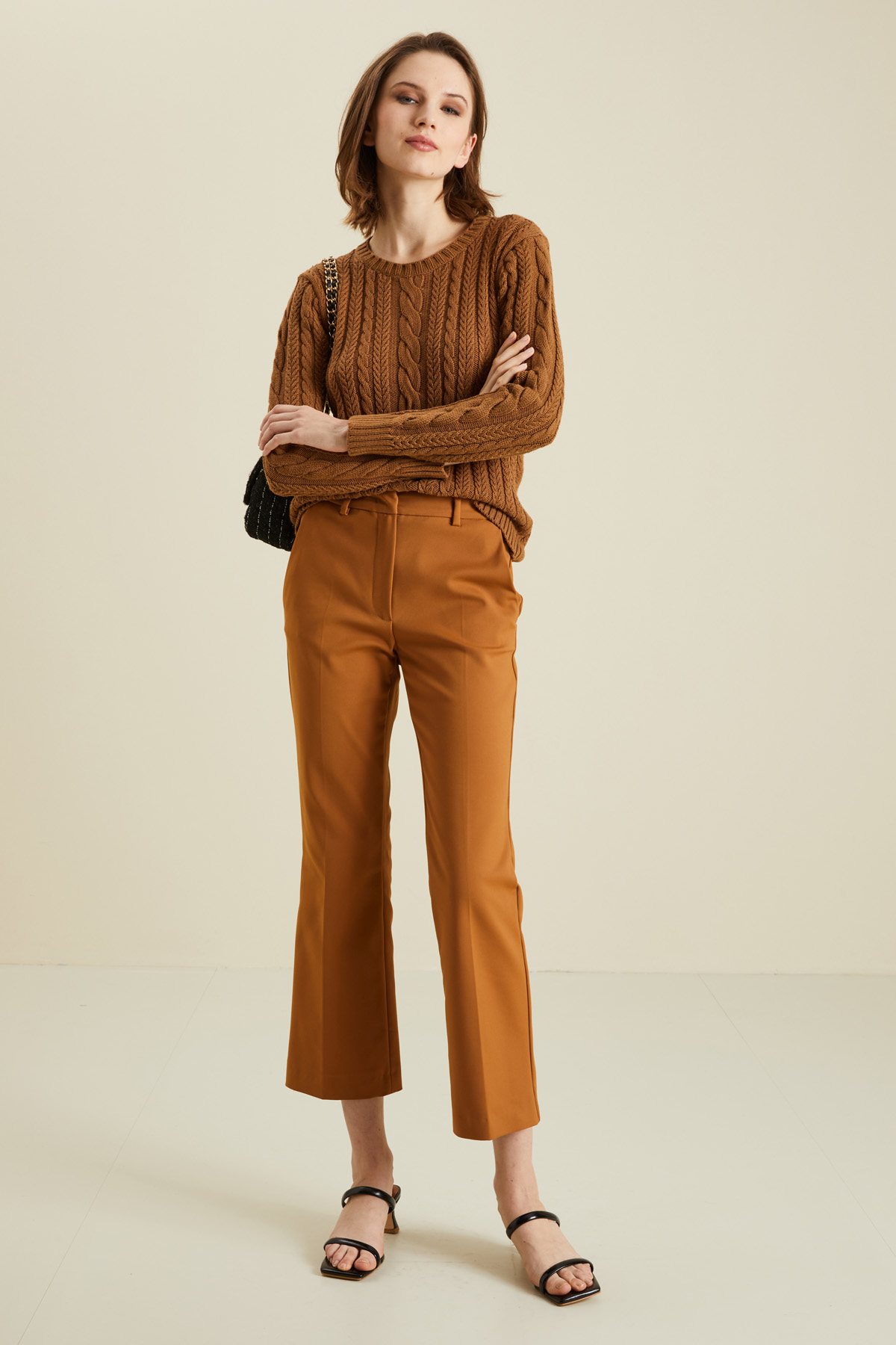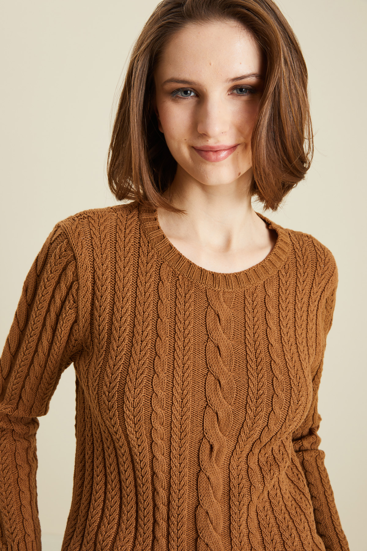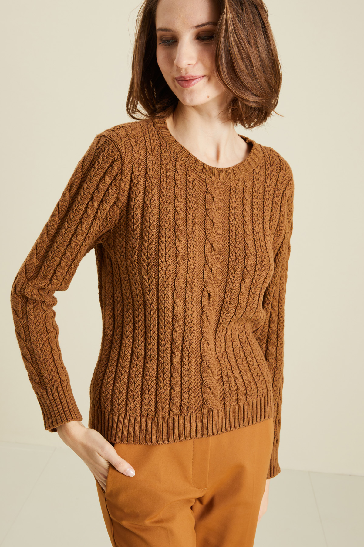 Maglia dalla linea semiaderente realizzata in filato di misto cotone con lavorazione a trecce, scollo rotondo, maniche lunghe e profili rifiniti a coste.