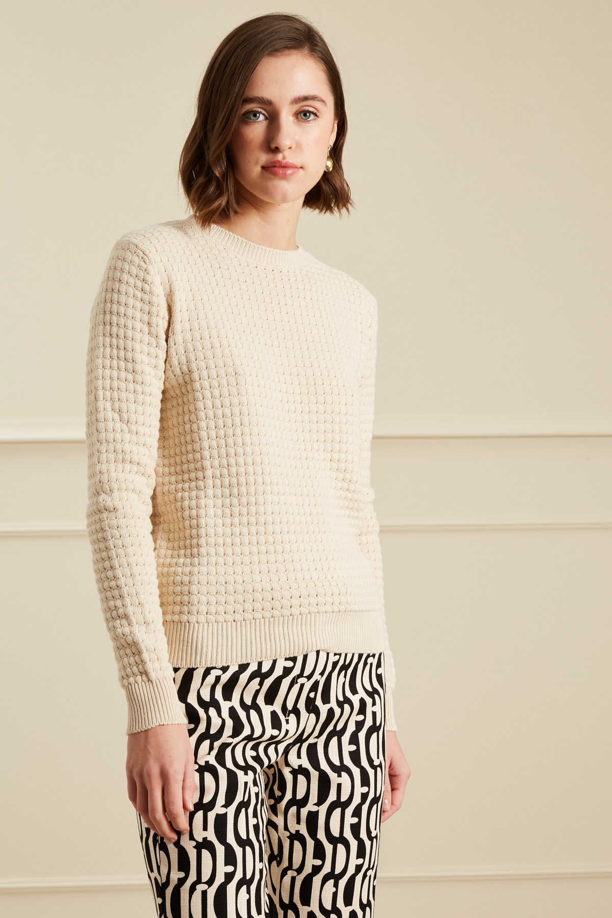 Maglia dalla linea dritta realizzata in filato di misto cotone con lavorazione a rilievo, scollo a giro, maniche lunghe e profili rifiniti a coste.