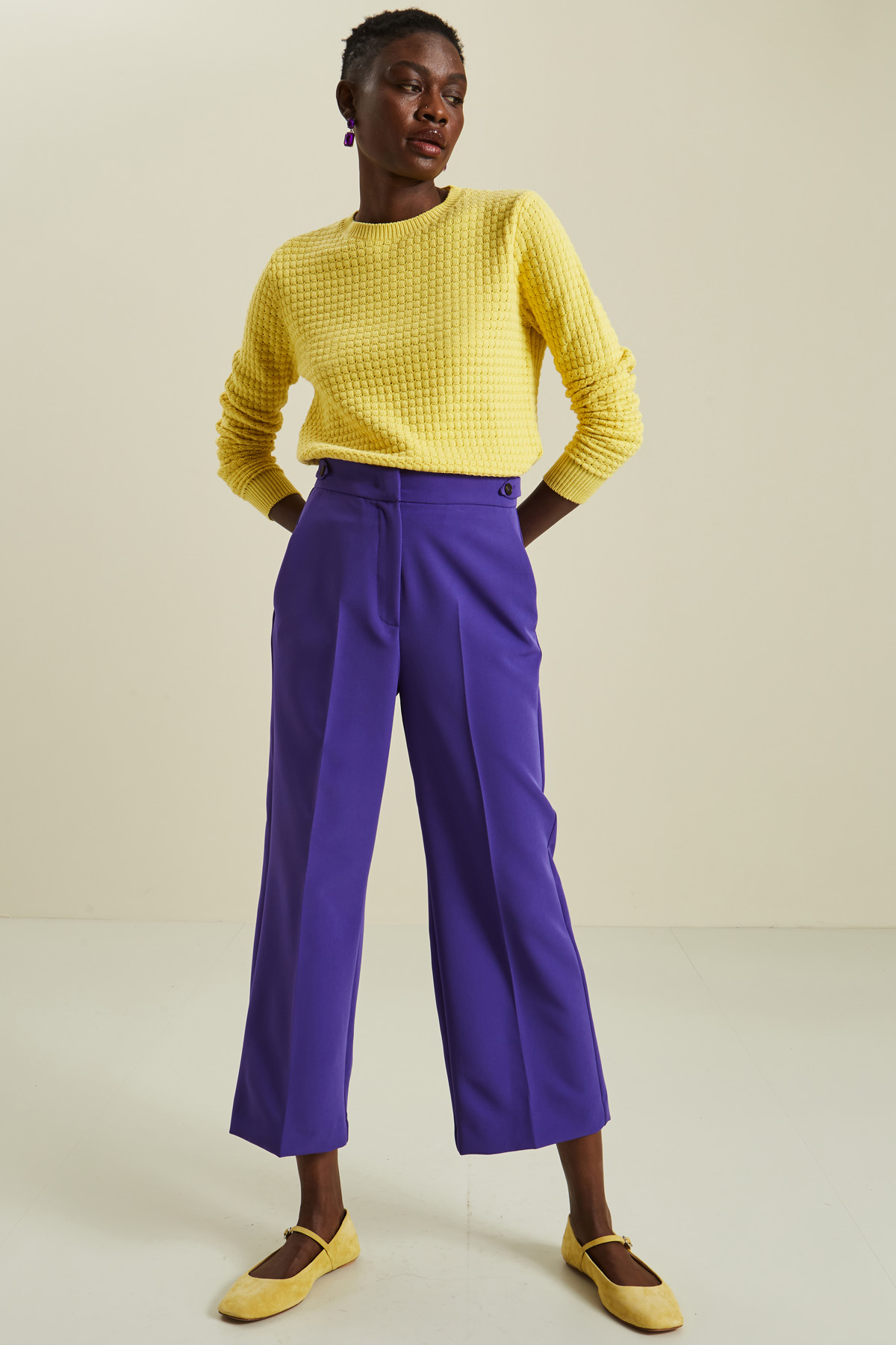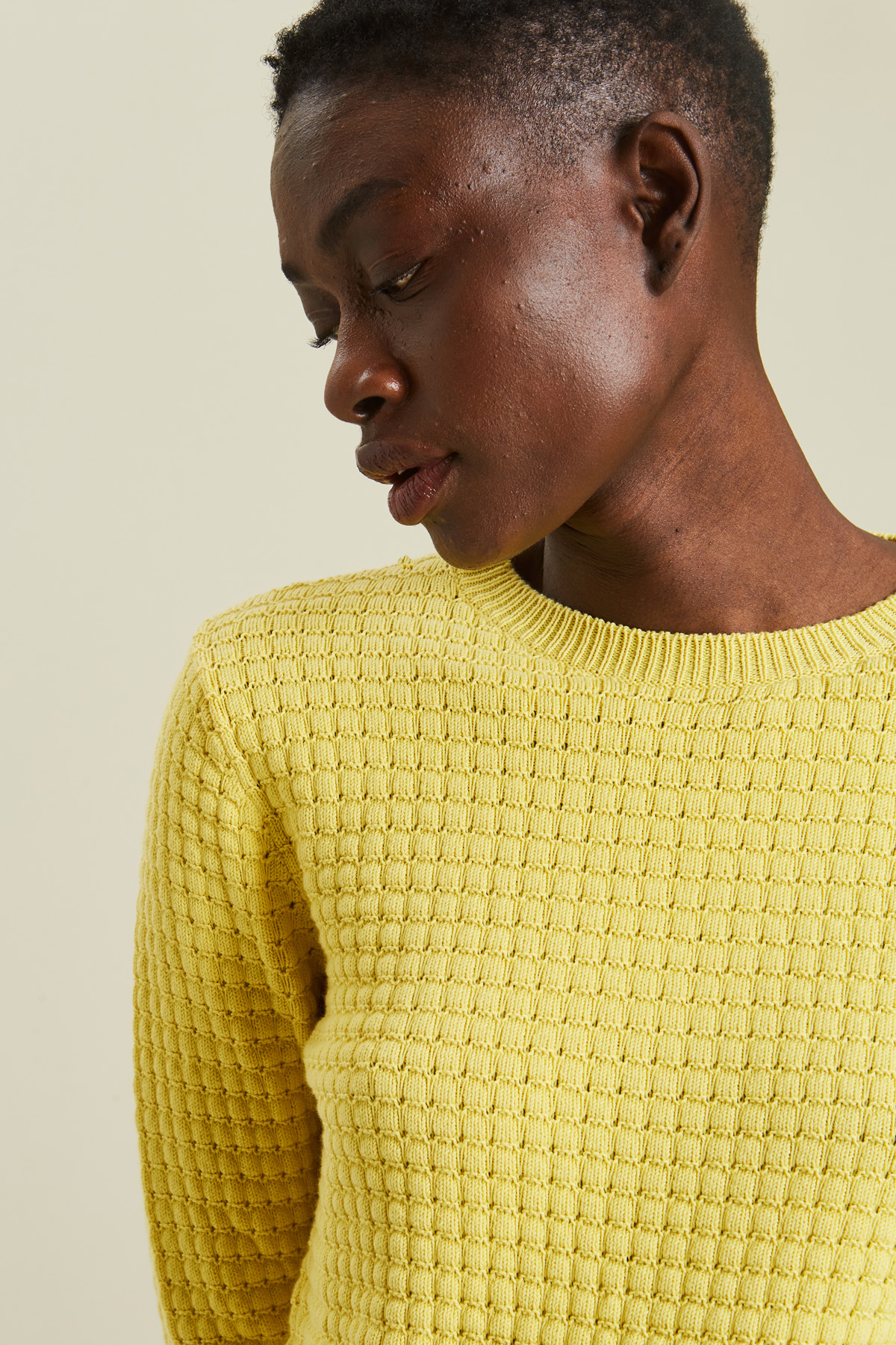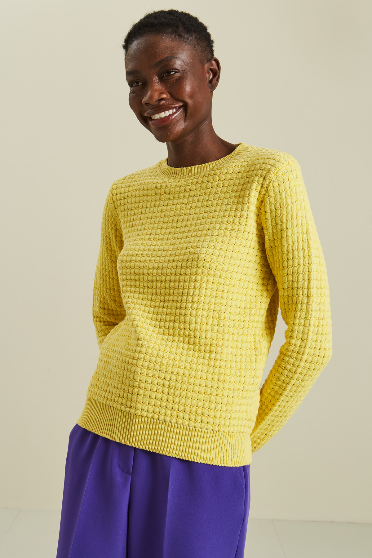 Maglia dalla linea dritta realizzata in filato di misto cotone con lavorazione a rilievo, scollo a giro, maniche lunghe e profili rifiniti a coste.