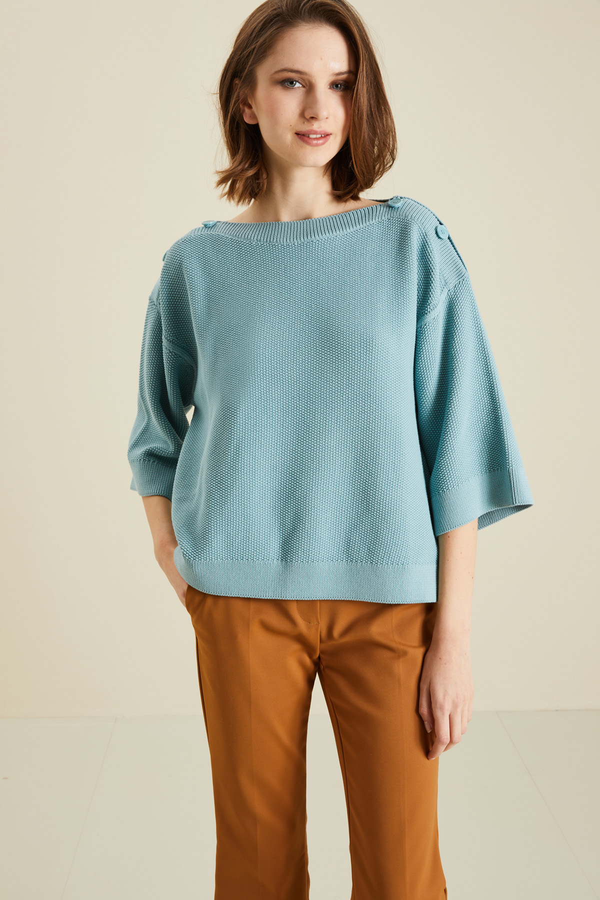 Maglia dal volume over realizzata in filato misto cotone, con scollo a barchetta dettaglio di bottoni con asola sulle spalle, maniche a tre quarti dal giro sceso, piccoli spacchi laterali a fondo capo e profili a coste.