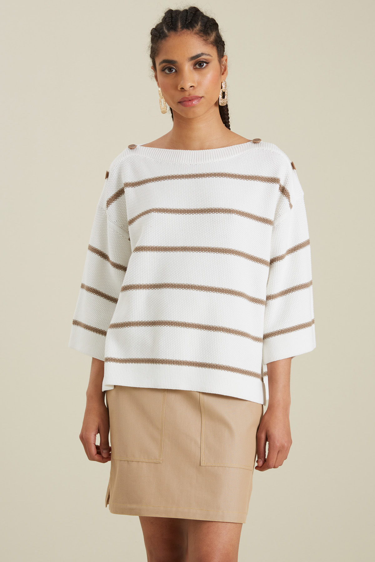 Maglia dal volume over realizzata in filato misto cotone, con scollo a barchetta dettaglio di bottoni con asola sulle spalle, maniche a tre quarti dal giro sceso, piccoli spacchi laterali a fondo capo e profili a coste.
