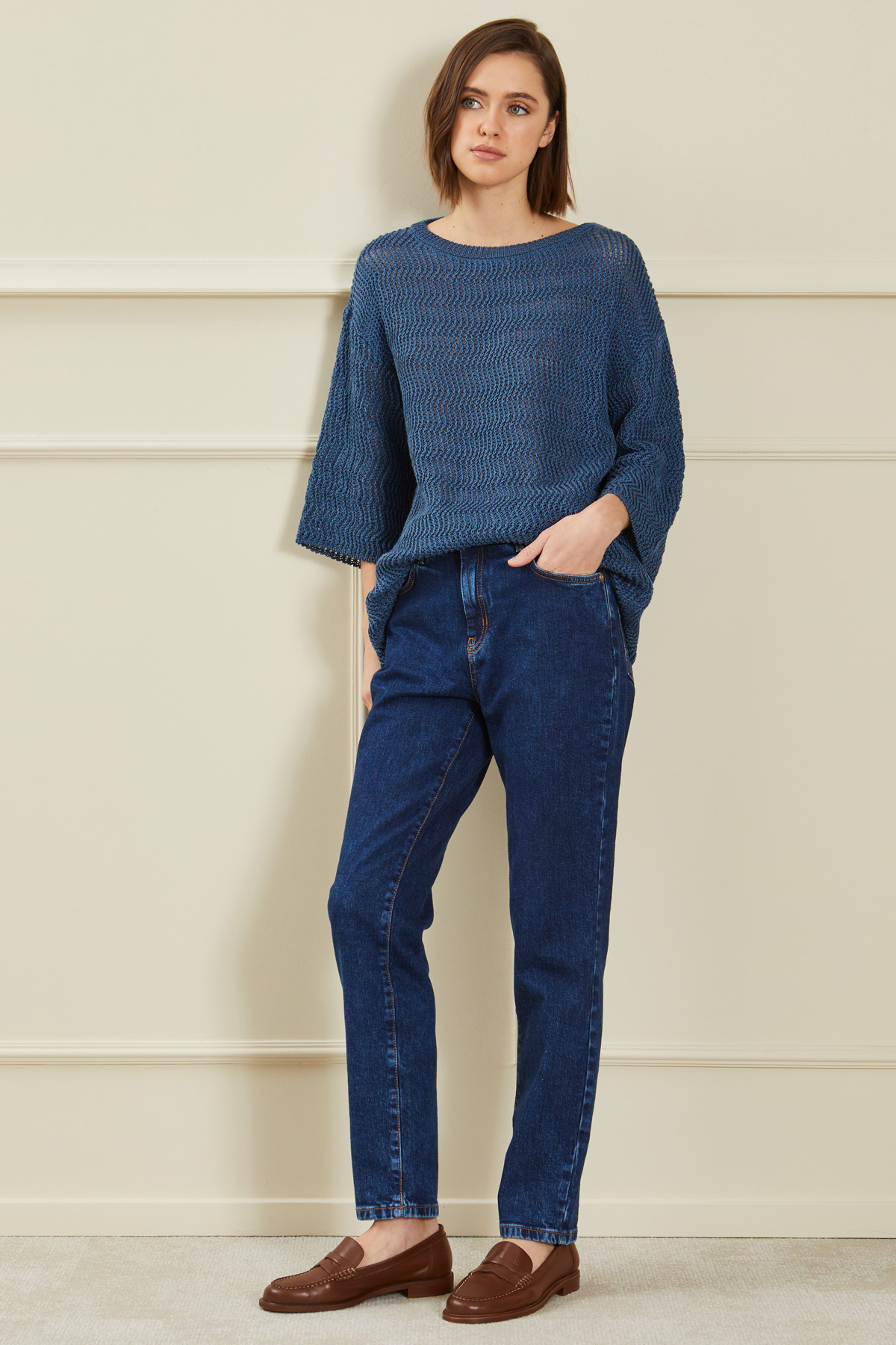 Maglia dalla linea morbida realizzata in filato di puro lino, con lavorazione a trecce, scollo rotondo, maniche tre quarti svasate.
