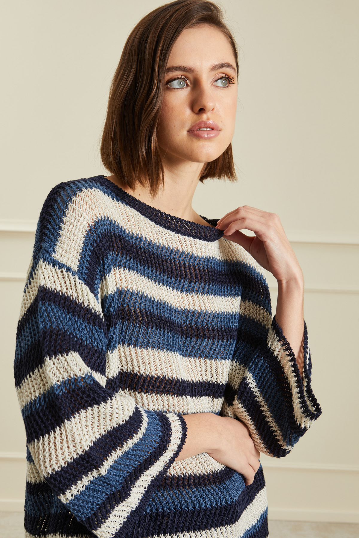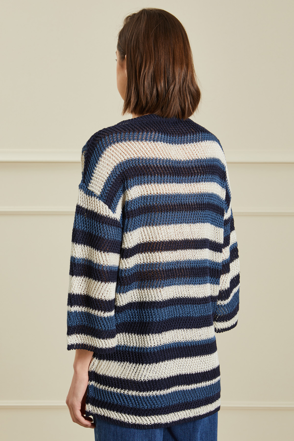 Maglia dalla linea over realizzata in filato di puro lino a maglia larga, con scollo tondo rifinito a costine e maniche a tre quarti dal giro sceso.