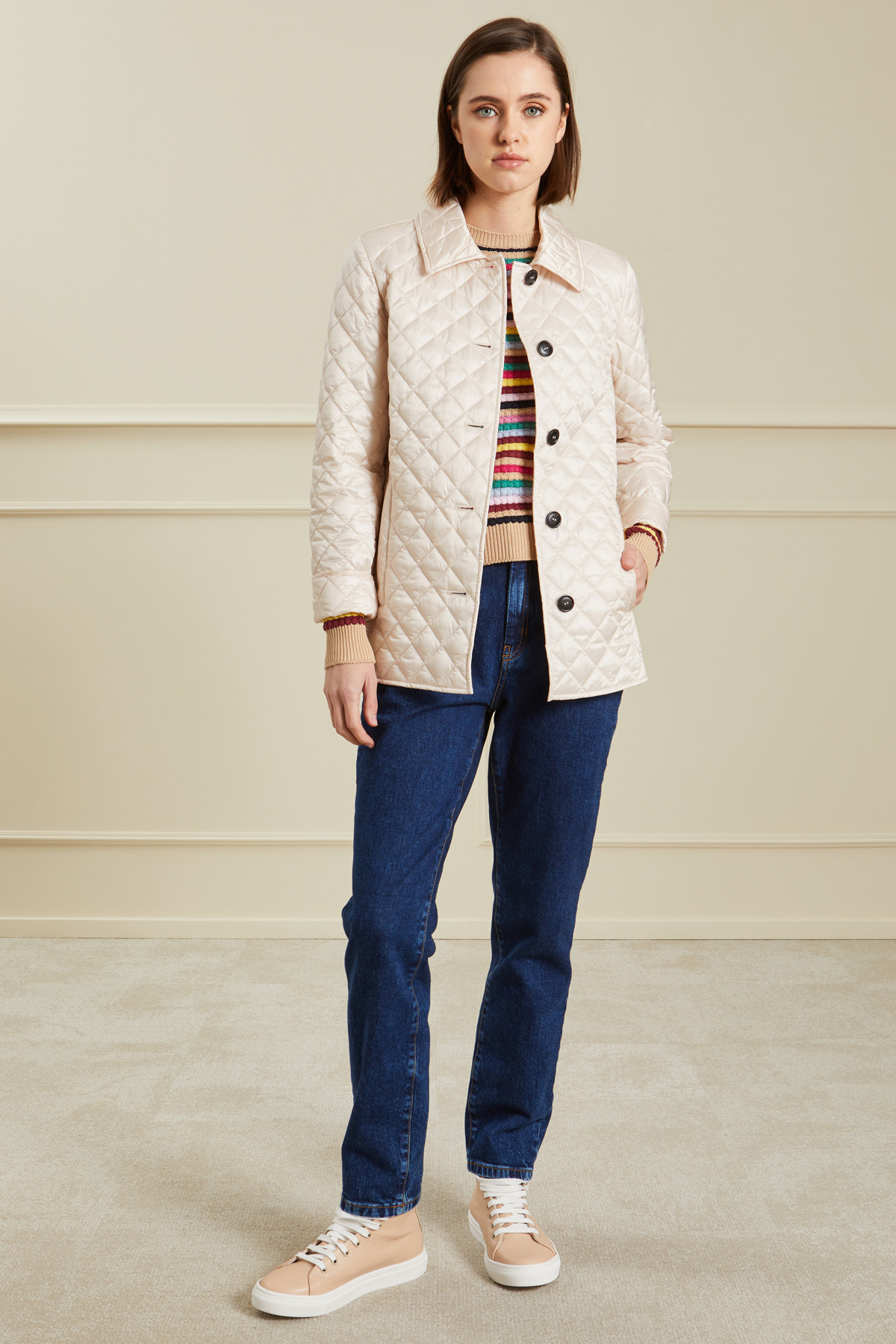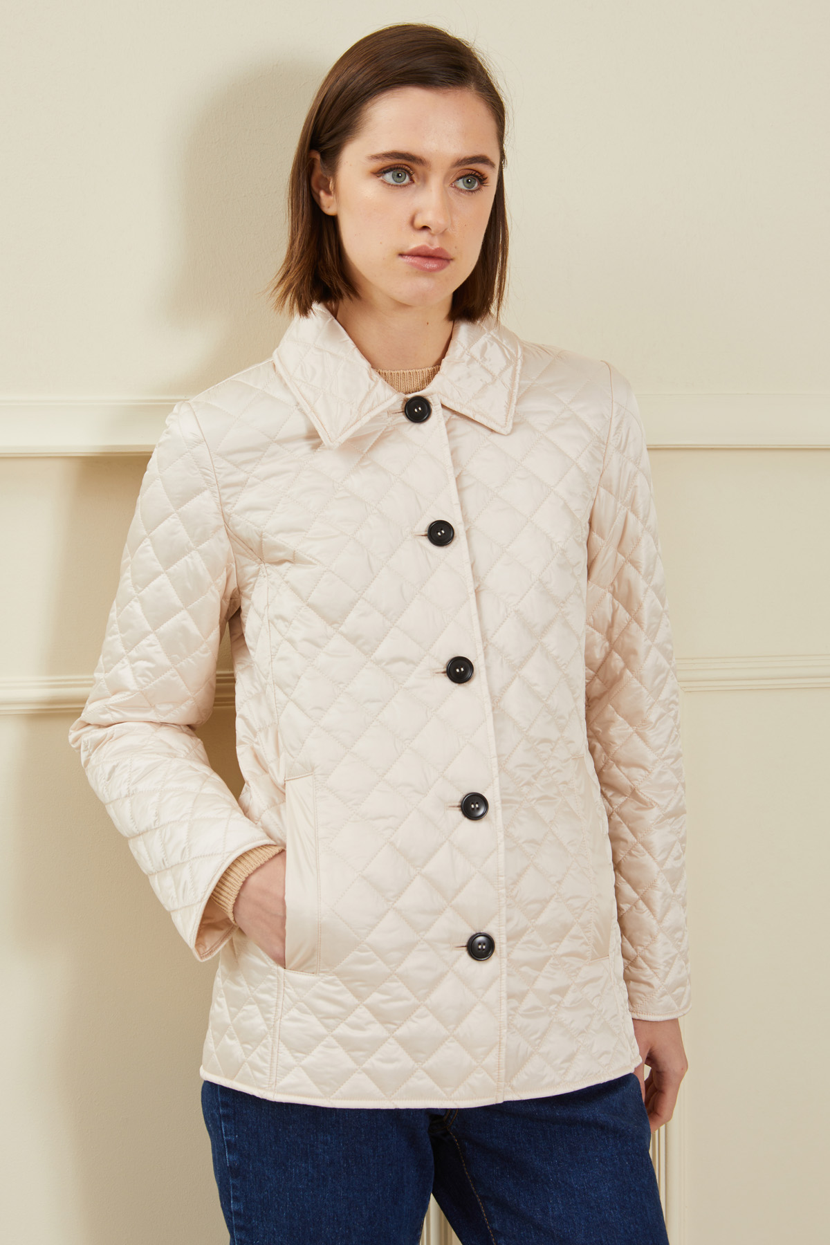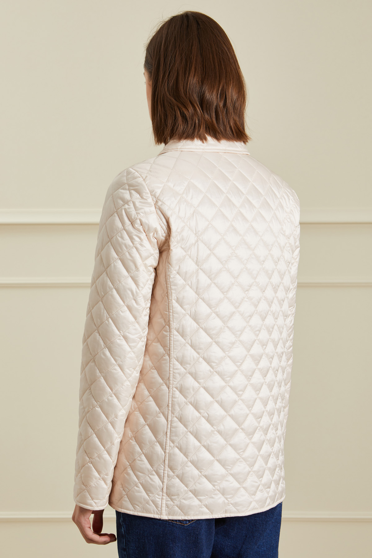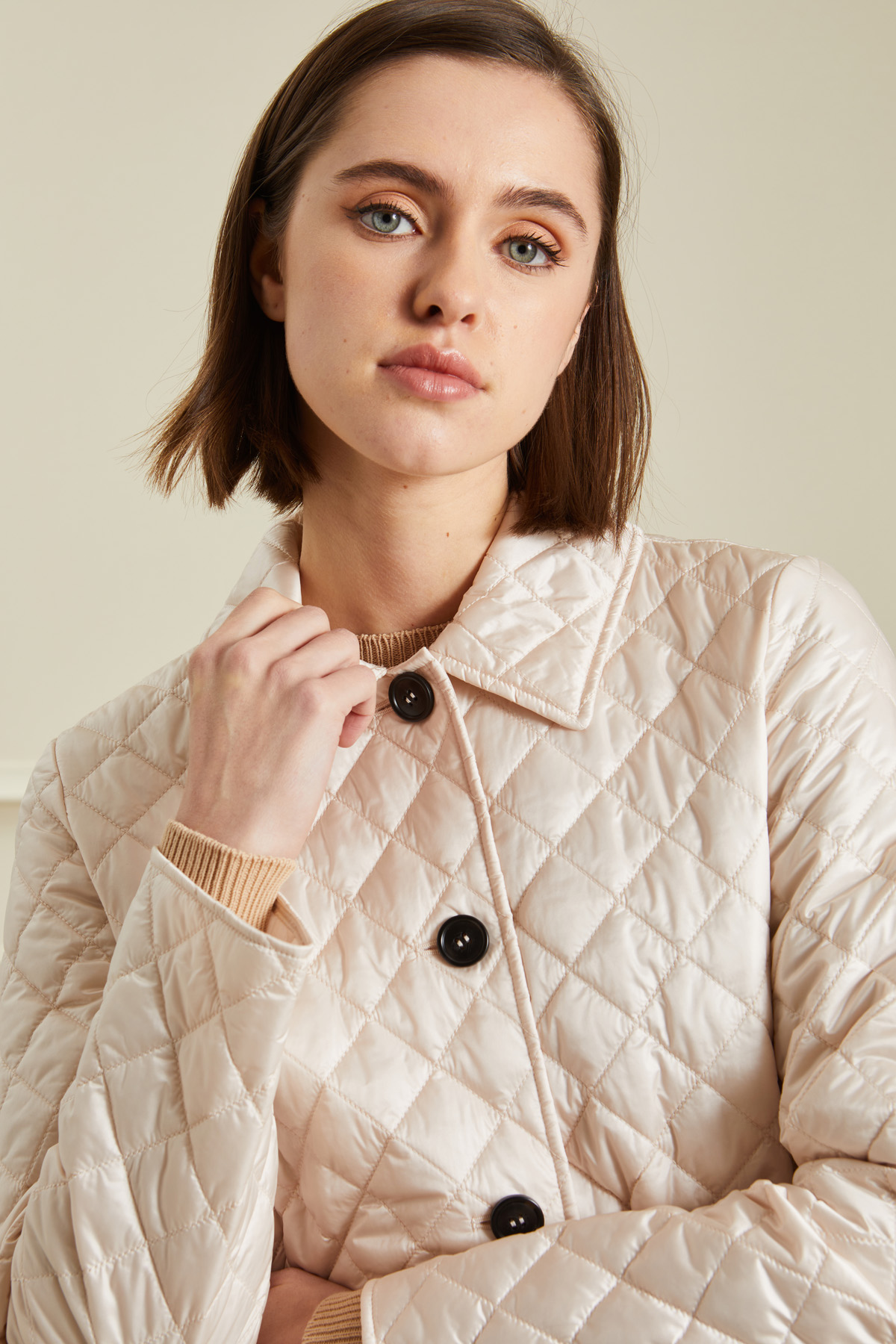 Imbottito dalla linea dritta realizzato in tessuto tecnico antigoccia, trapuntato, con colletto a camicia, tasche a filetto e chiusura a bottoni.