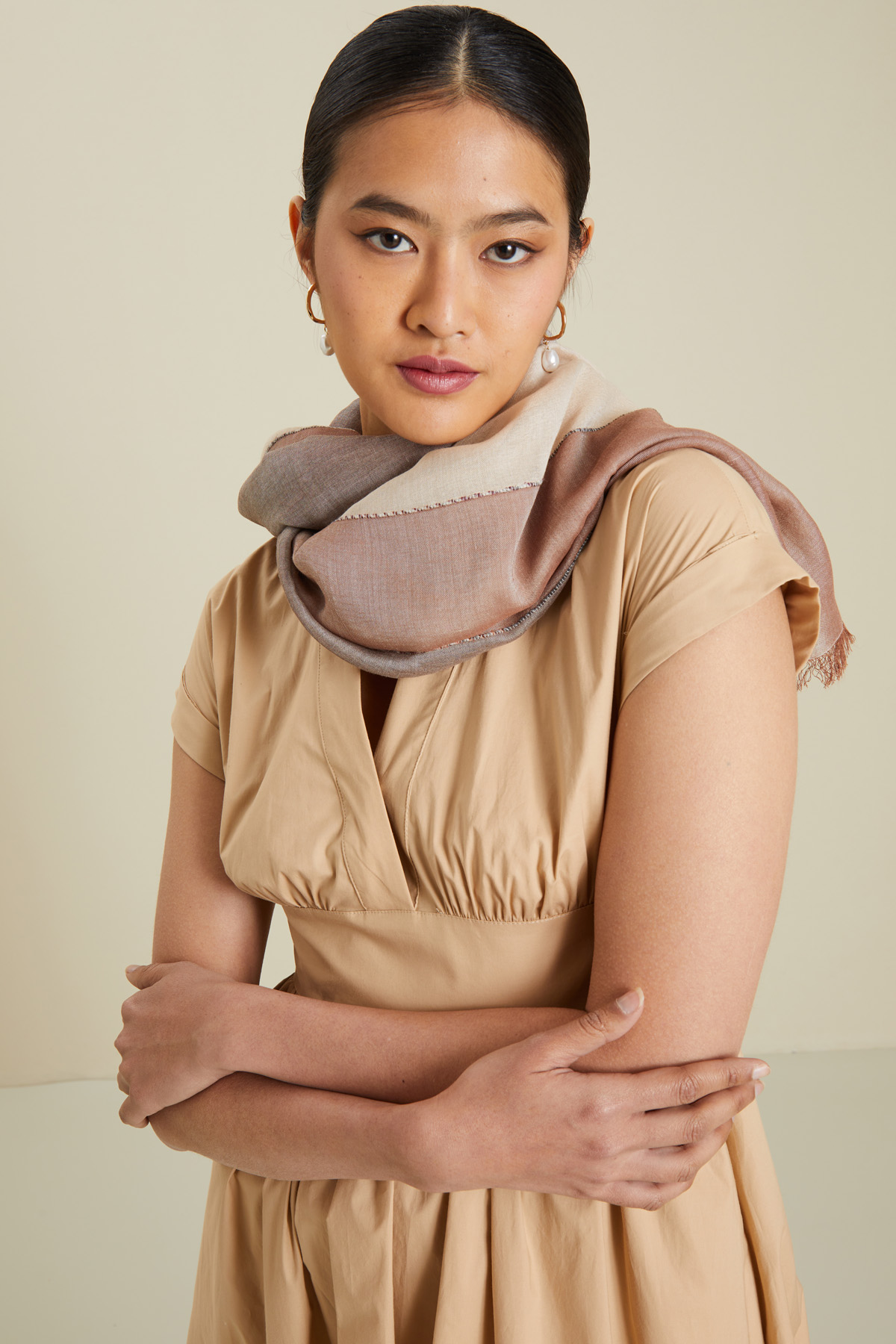 Sciarpa realizzata in tela di misto viscosa tinto filo, con dettagli a rilievo e profili sfrangiati.