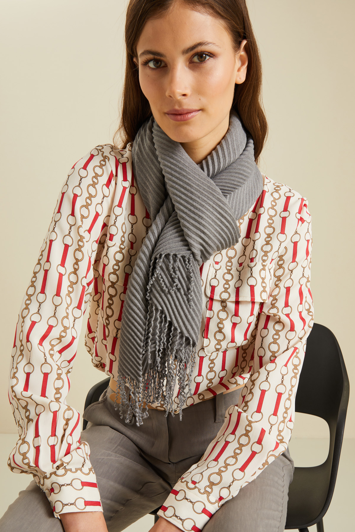 Sciarpa realizzata in tessuto di misto viscosa con motivo plissettato all over e dettaglio di frange alle estremità.