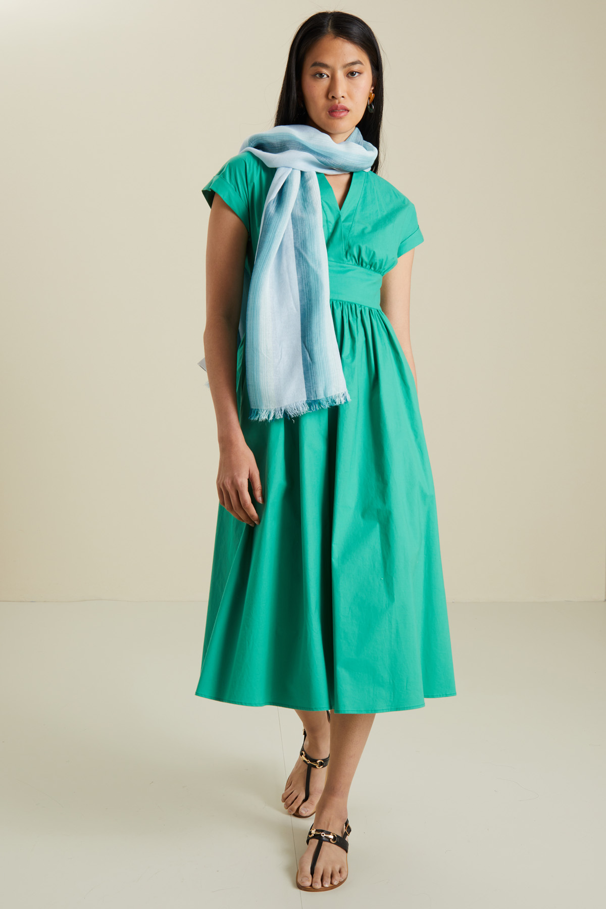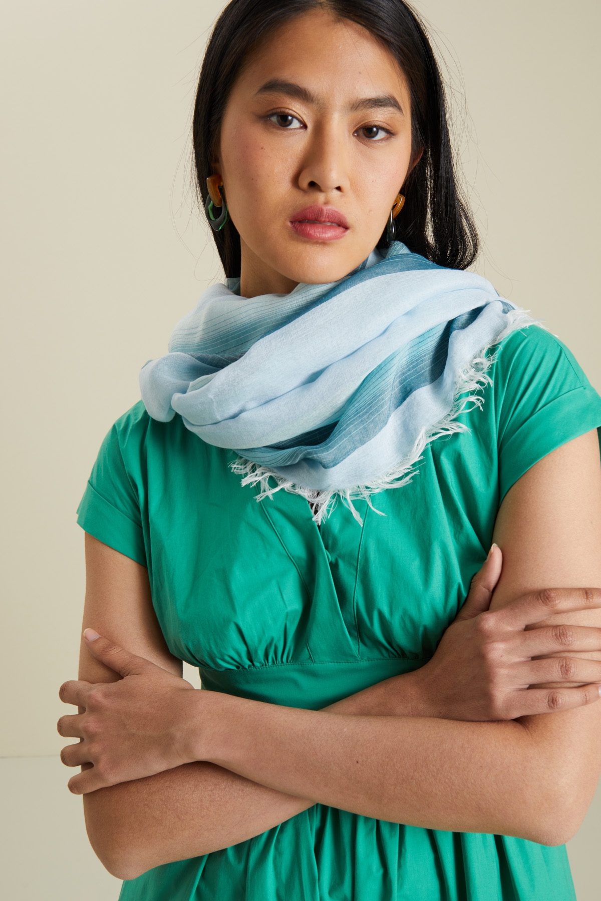 Sciarpa realizzata in tela di pura viscosa tinto filo con profili sfrangiati.