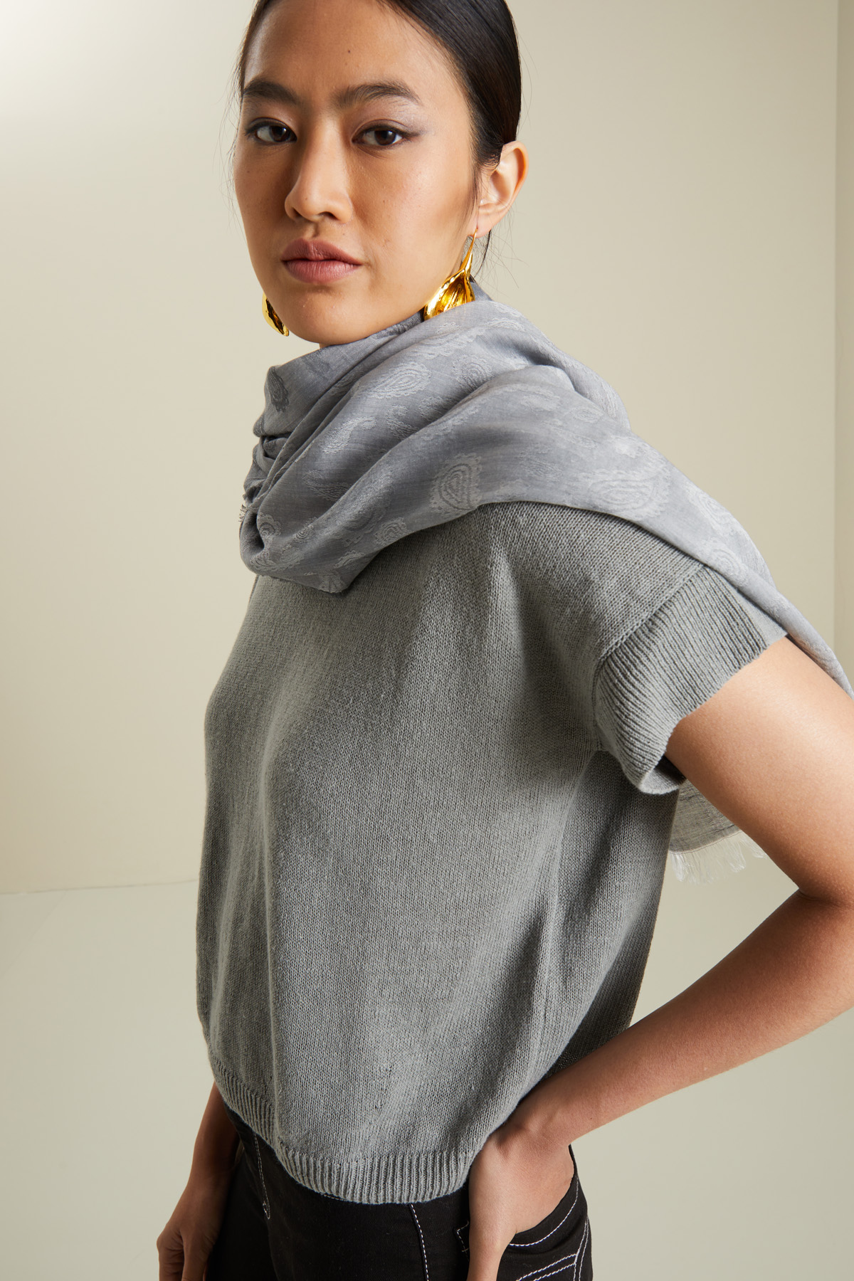 Sciarpa realizzata in tela di puro cotone con lavorazione jacquard e profili sfrangiati.