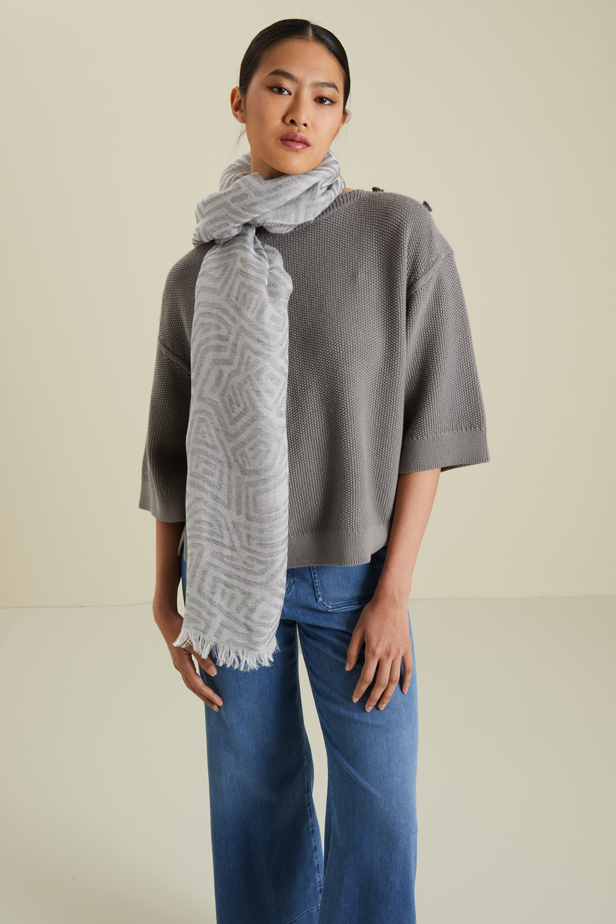 Sciarpa realizzata in tela di misto lino, cotone e viscosa, con lavorazione jacquard e profili sfrangiati.