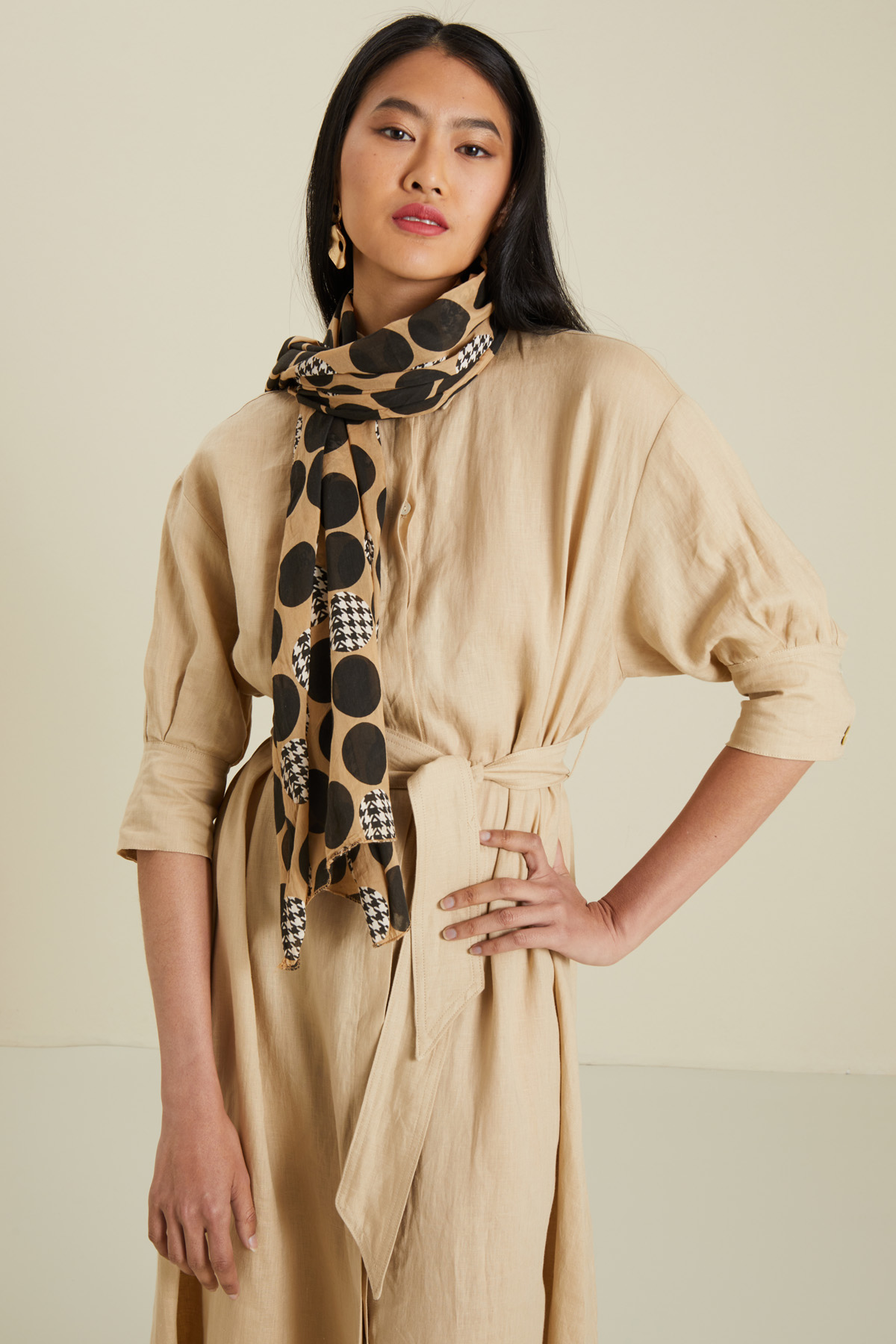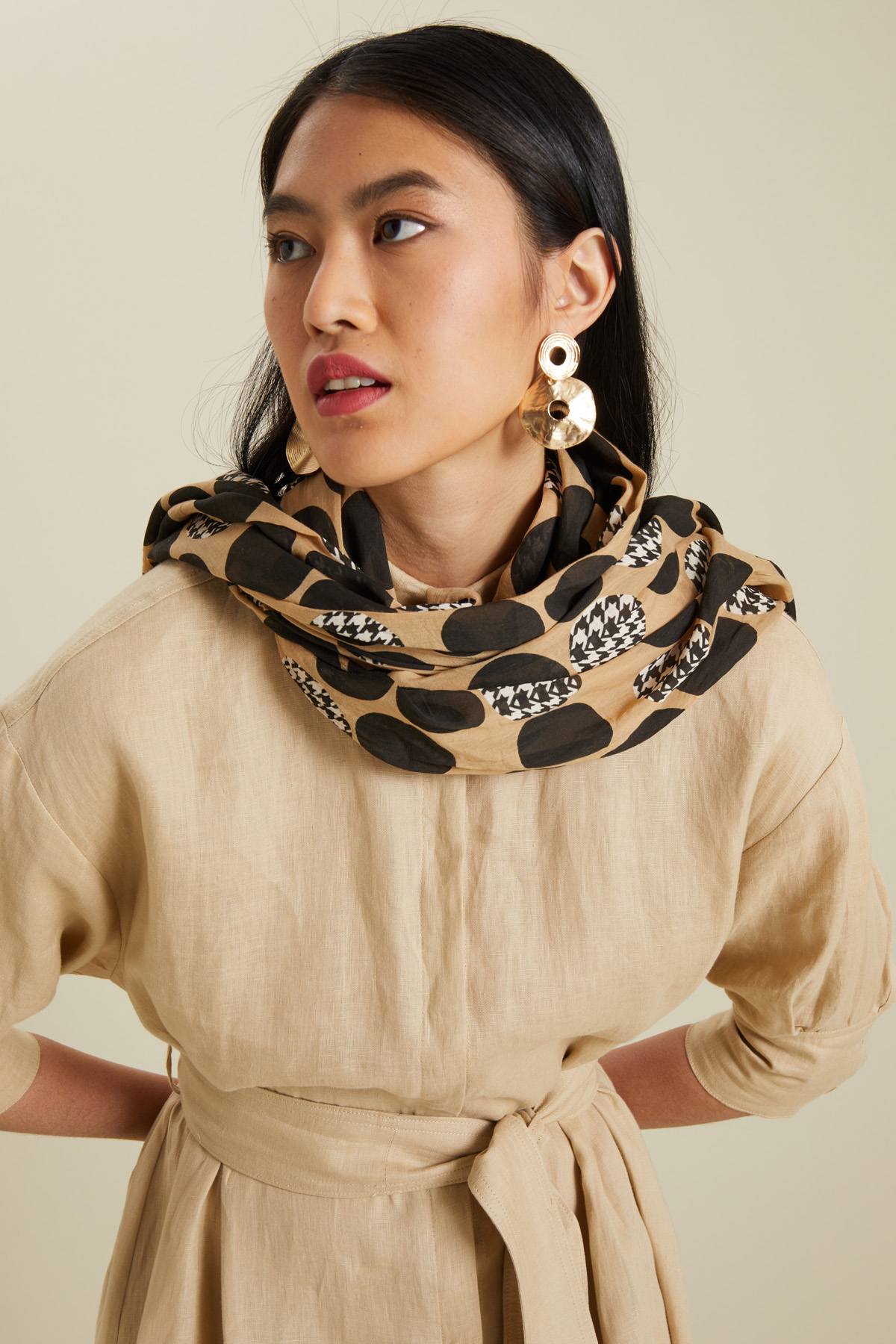 Stola realizzata in tela leggera di cotone e seta stampata, con bordi asimmetrici.