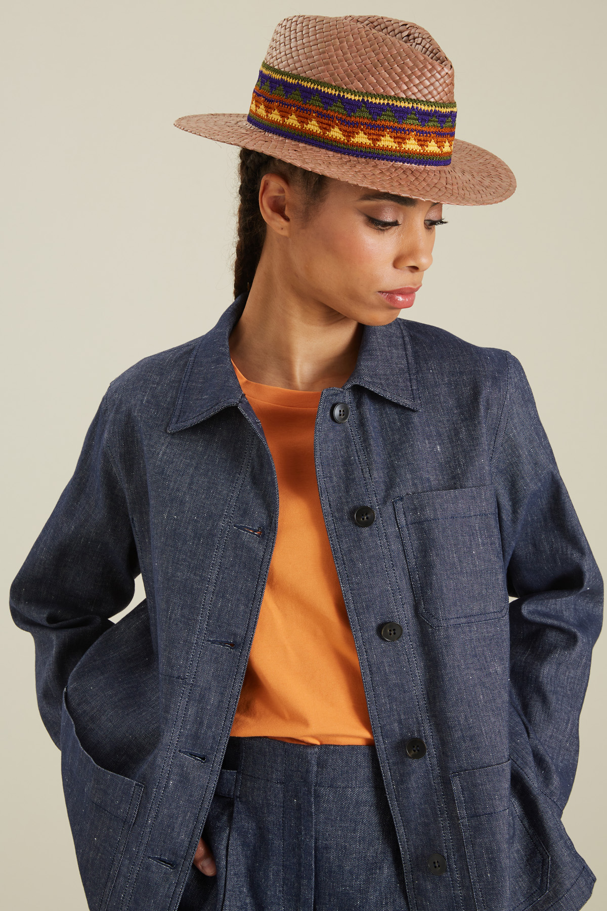 - Modello in paglia; nastro parasudore 64% cotone, 36% poliestere; con particolari in 50% viscosa, 47% acetato, 3% poliammide.