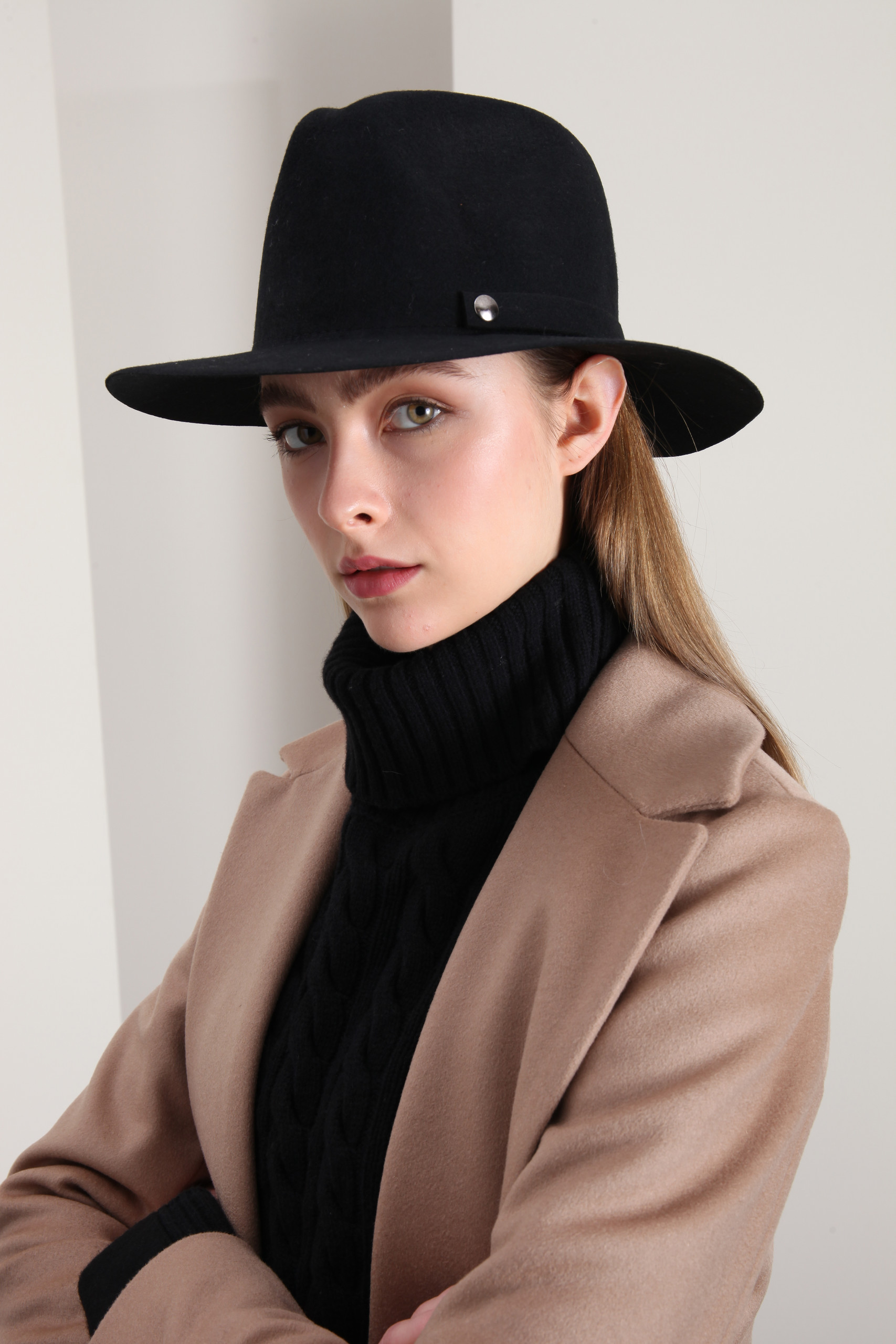 Fedora realizzata in pura lana cotta, con dettaglio rimovibile in tono.
