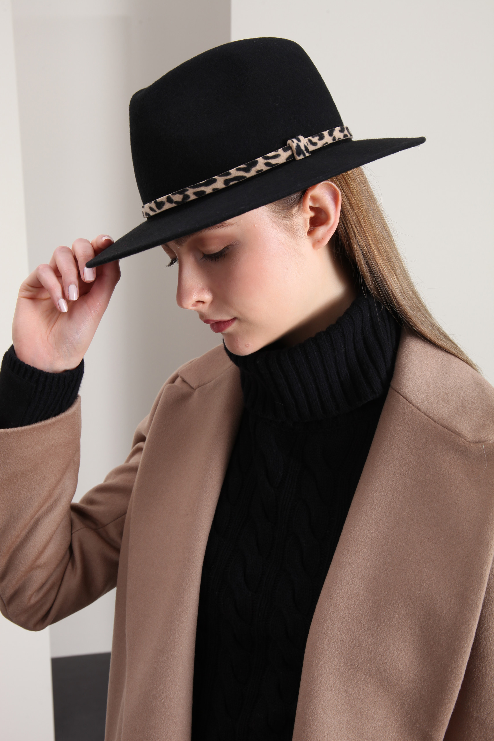 Fedora realizzata in pura lana cotta, con passamaneria stampata.