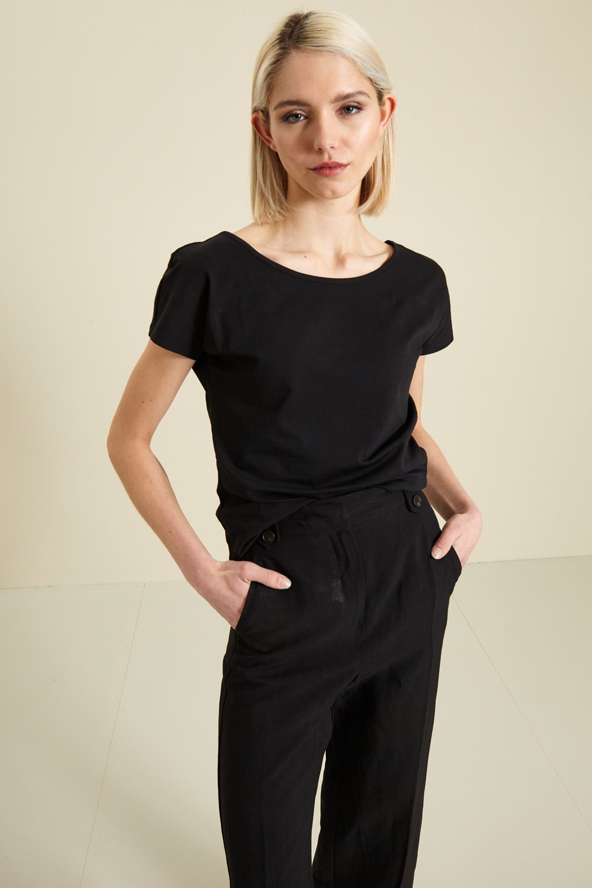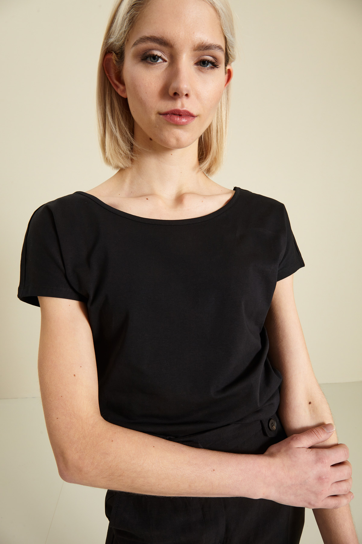 T-shirt dalla linea dritta realizzata in jersey di cotone stretch, con scollo a barchetta e maniche corte a kimono.