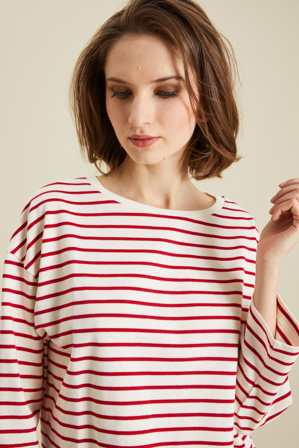 T-shirt dalla linea leggermente svasata realizzata in jersey pesante di cotone, con scollo a giro, maniche lunghe dal giro sceso.