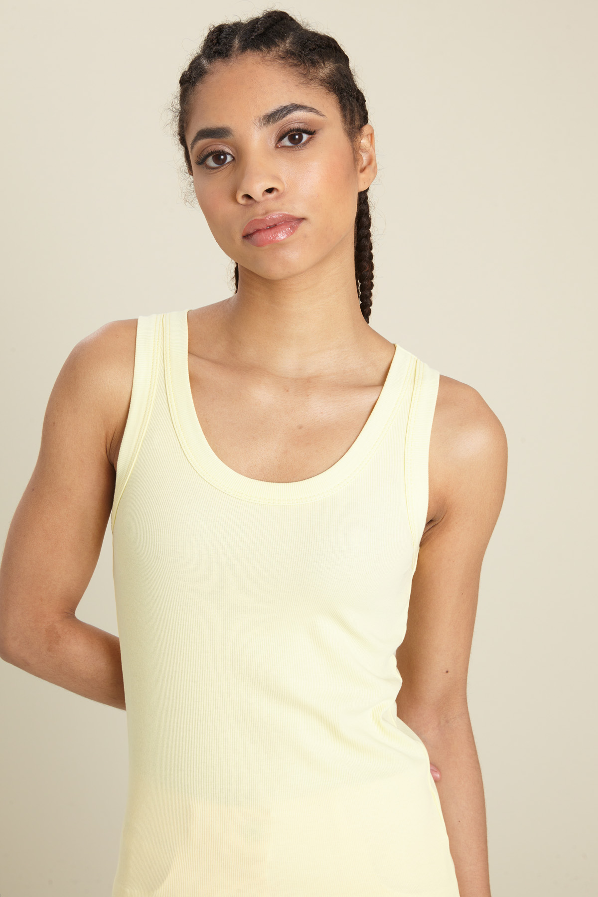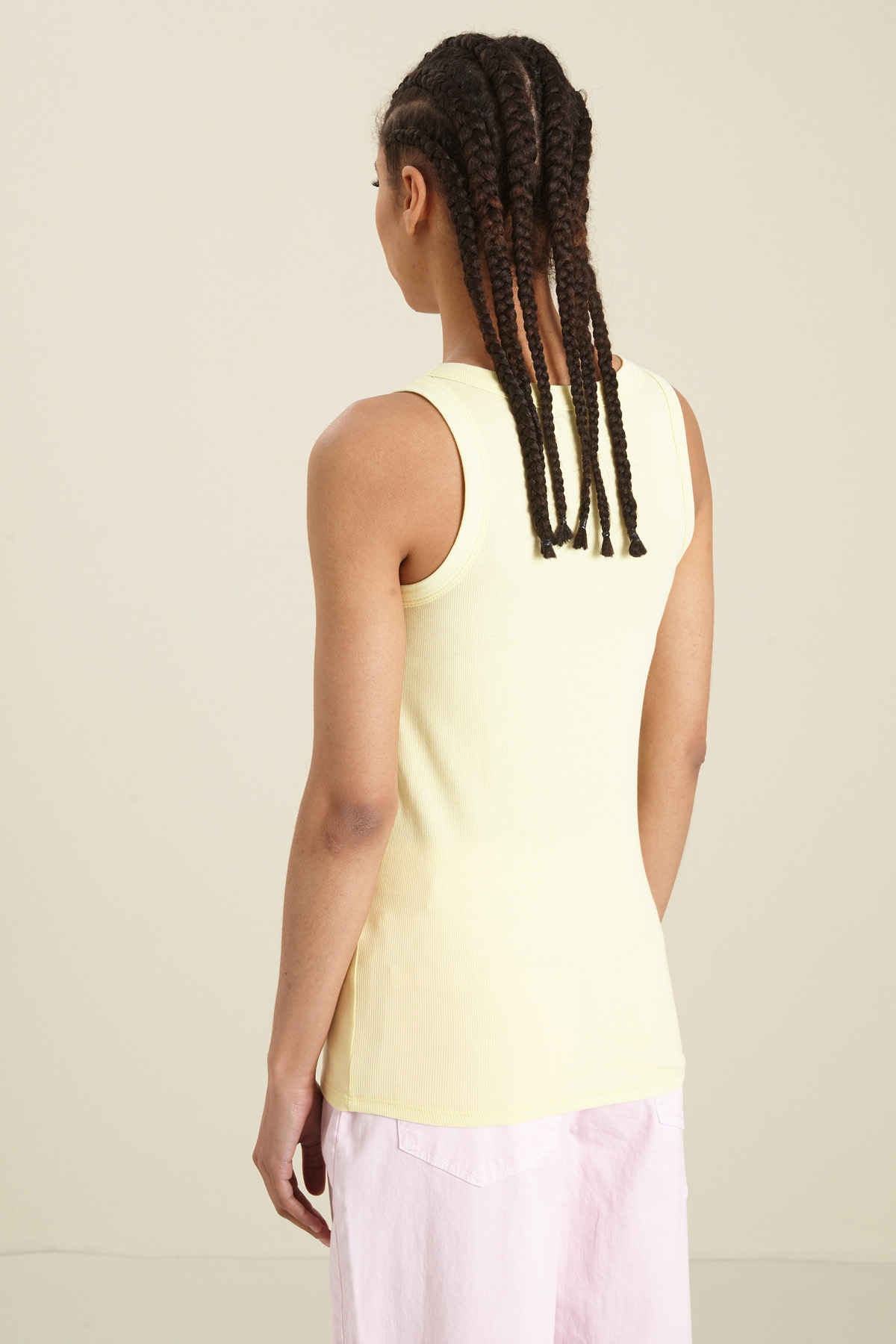 Canotta dalla linea aderente realizzata in jersey di cotone stretch a costine, con scollo tondo e senza maniche.