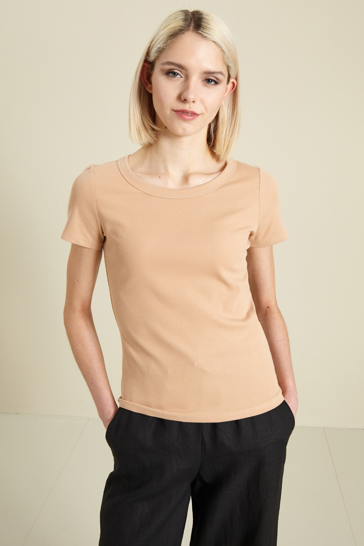 T-shirt dalla linea aderente realizzata in jersey di cotone stretch a costine, con scollo rotondo e maniche corte.